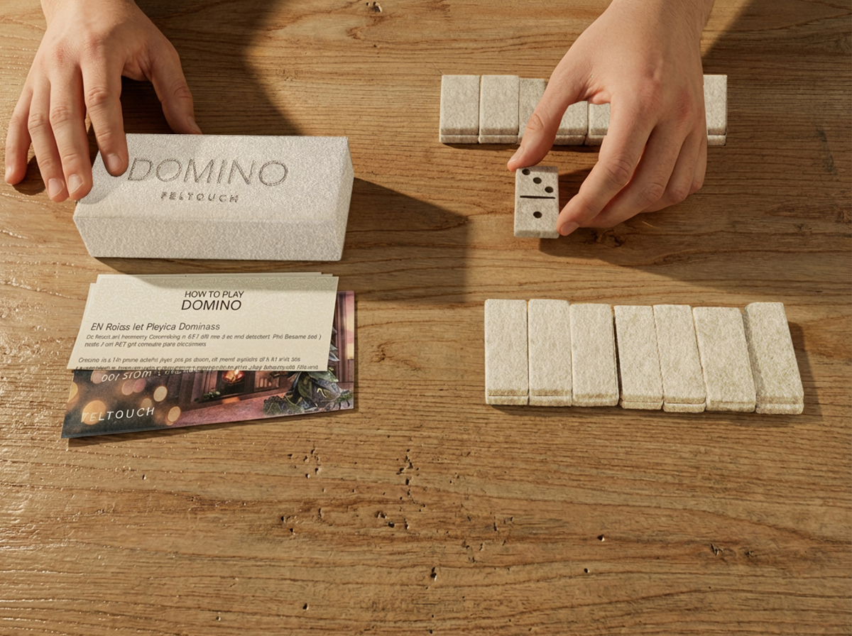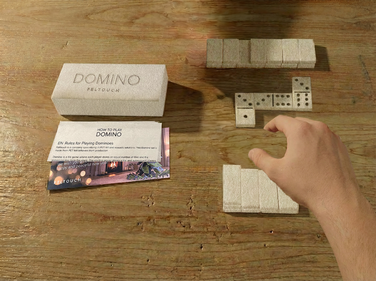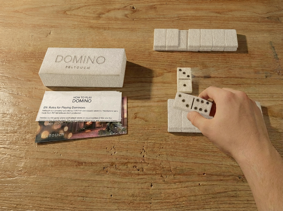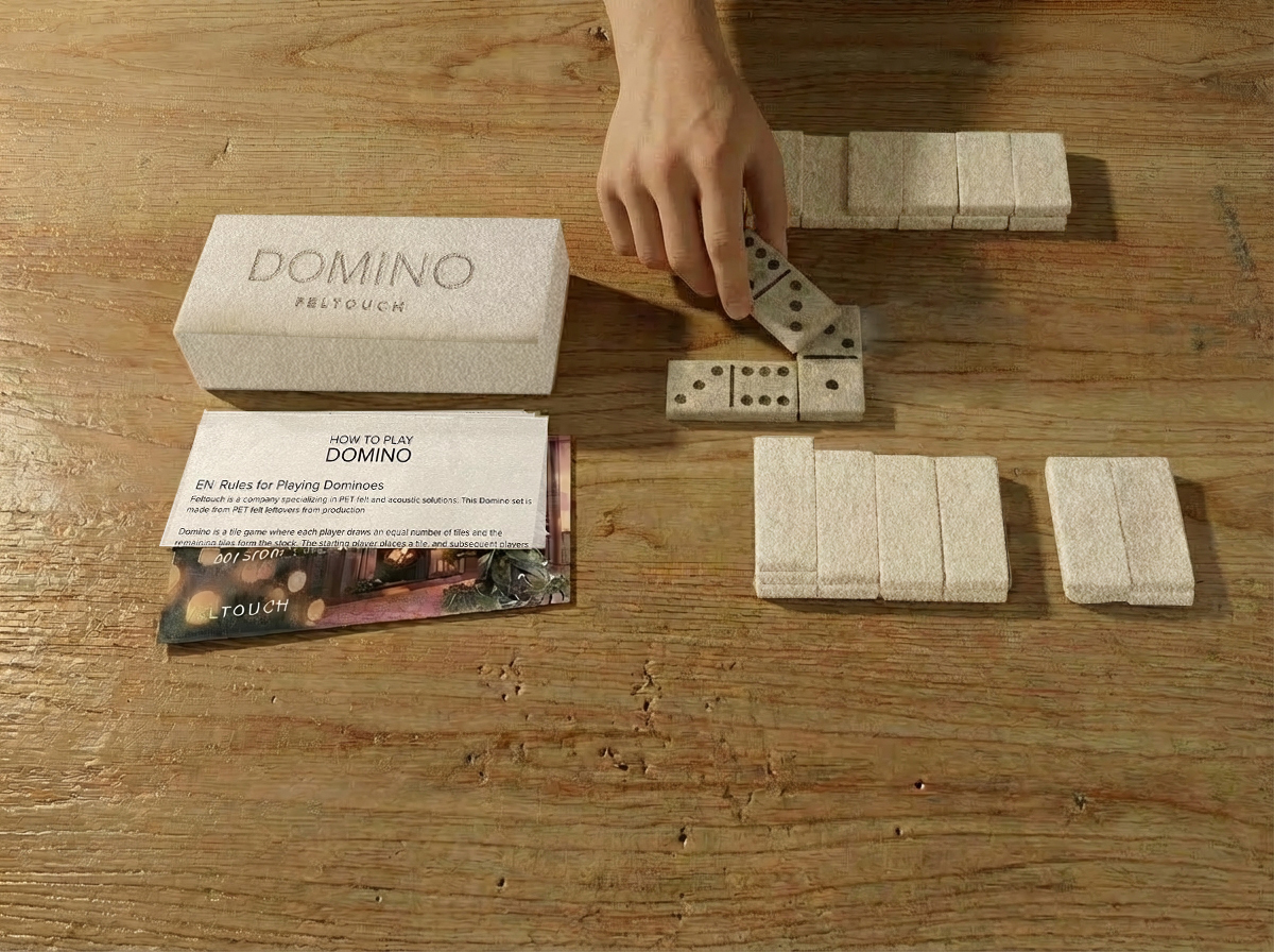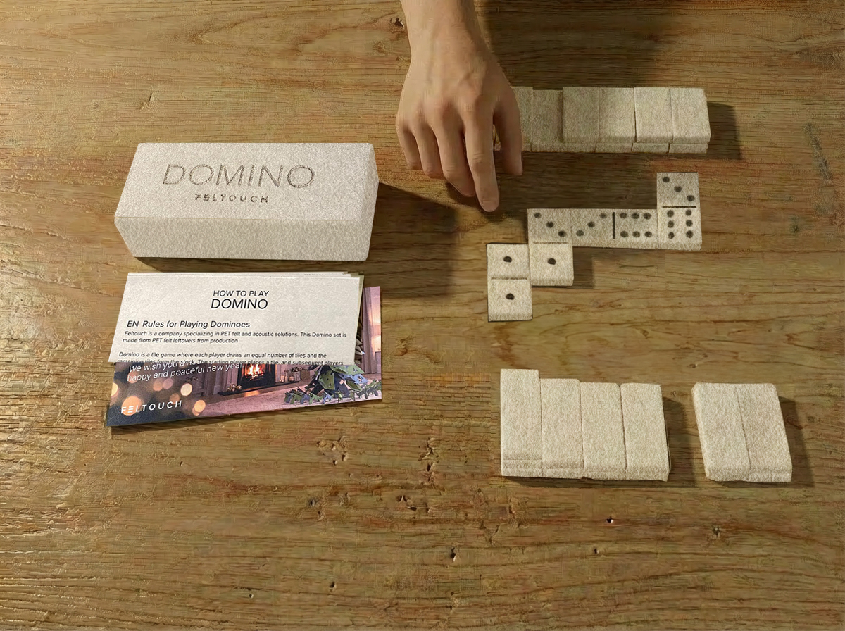 Feltouch, is a manufacturing and product development company specializing in PET felt with advanced fiber and nonwoven textile technology. High-performance acoustic absorbing solutions aimed at improving speech intelligibility, comfort, and concentration in all interior spaces are offered. This Domino set is made from PET felt leftovers generated During the production process.