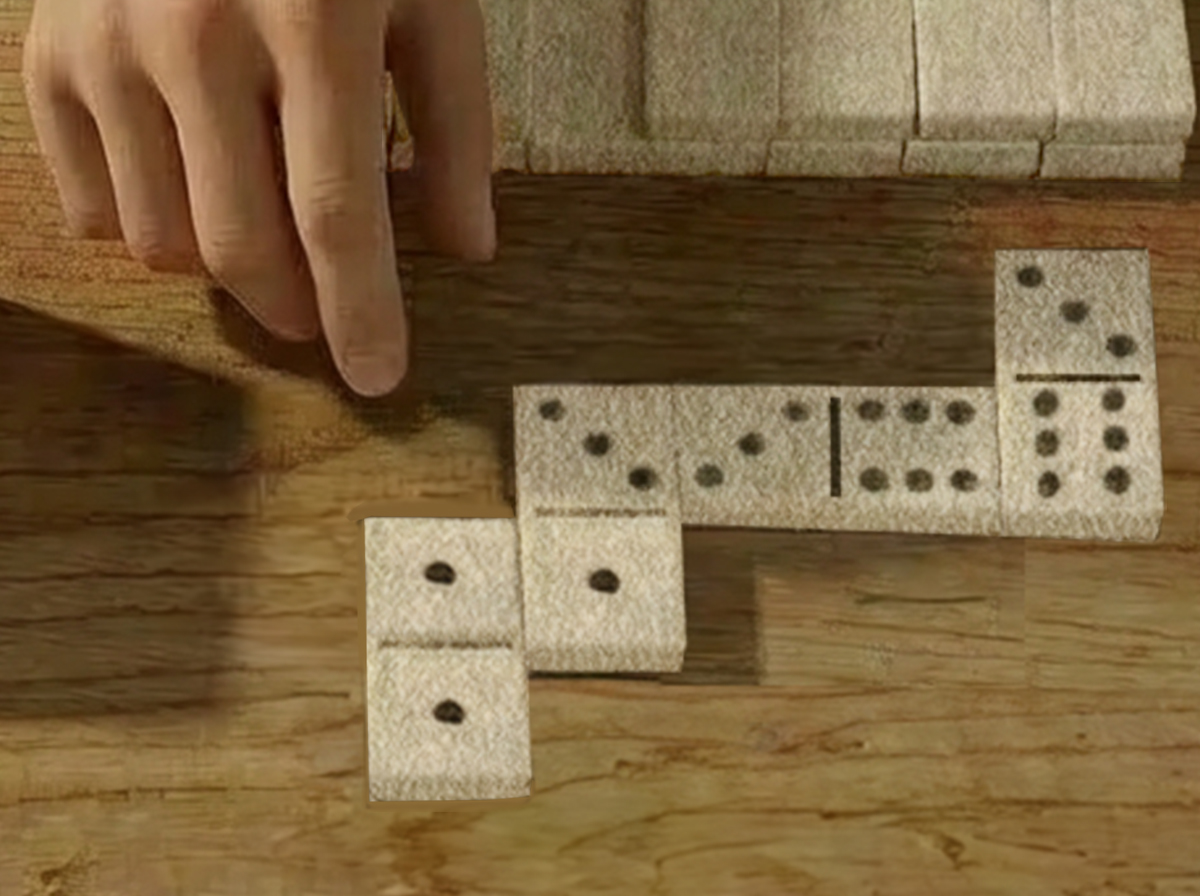 The starting player places the first tile on the table. The next player (to the left) must play a tile that matches one of the open ends. For example, if the first player plays a five–three, the next player must play a tile with either a five or a three. Only one tile may be played per turn.