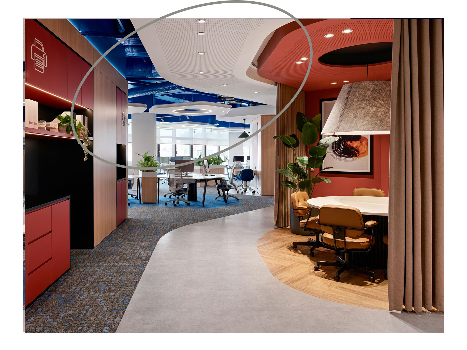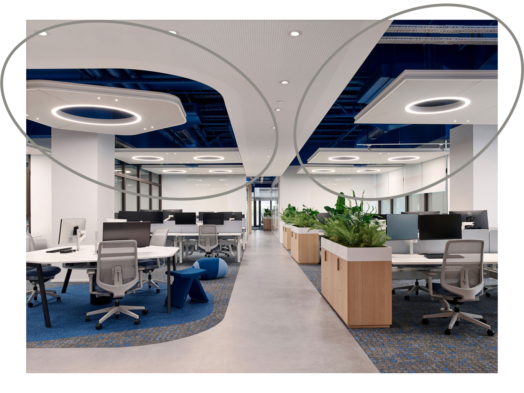 Amadeus Project, Plate acoustic ceiling panels were applied to improve sound absorption while maintaining a clean and continuous ceiling design in the open-plan office areas.