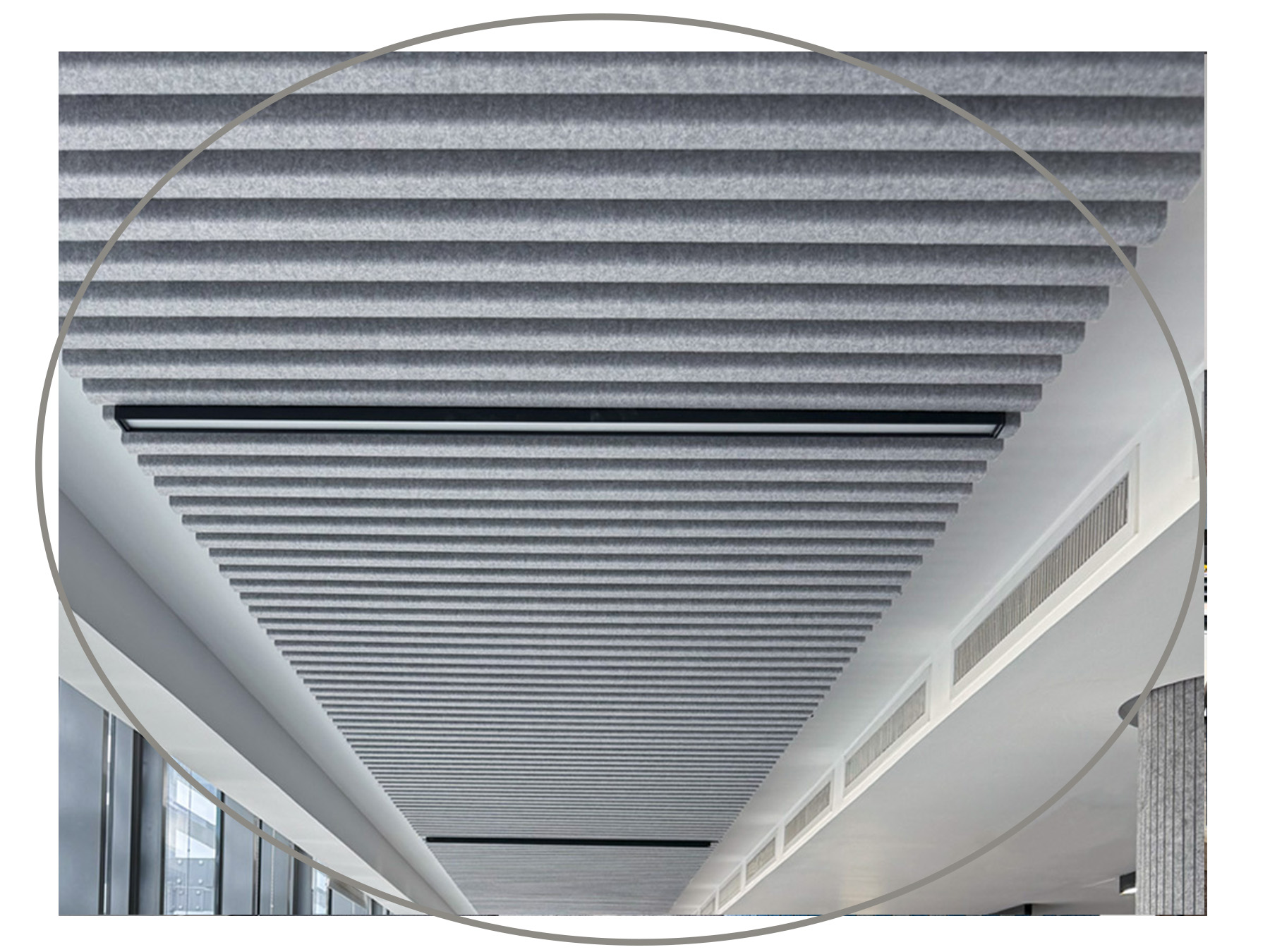 Eczacıbaşı Pharmaceuticals project, Grid Ceiling, Flat Cloud, Chevrone, and Air-Felt Baffle systems were applied to improve sound absorption while maintaining a clean and continuous ceiling design in the office areas.