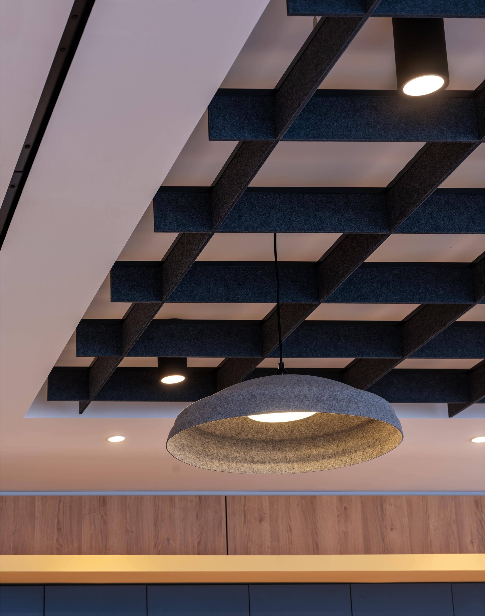 Each product contributes to a cohesive acoustic performance, from the geometric precision of Honeycomb panels to the sculptural presence of Air Felt Baffle installations. Sparkle Line lighting elements further enhance the interior ambiance, merging light, texture, and acoustic comfort seamlessly.