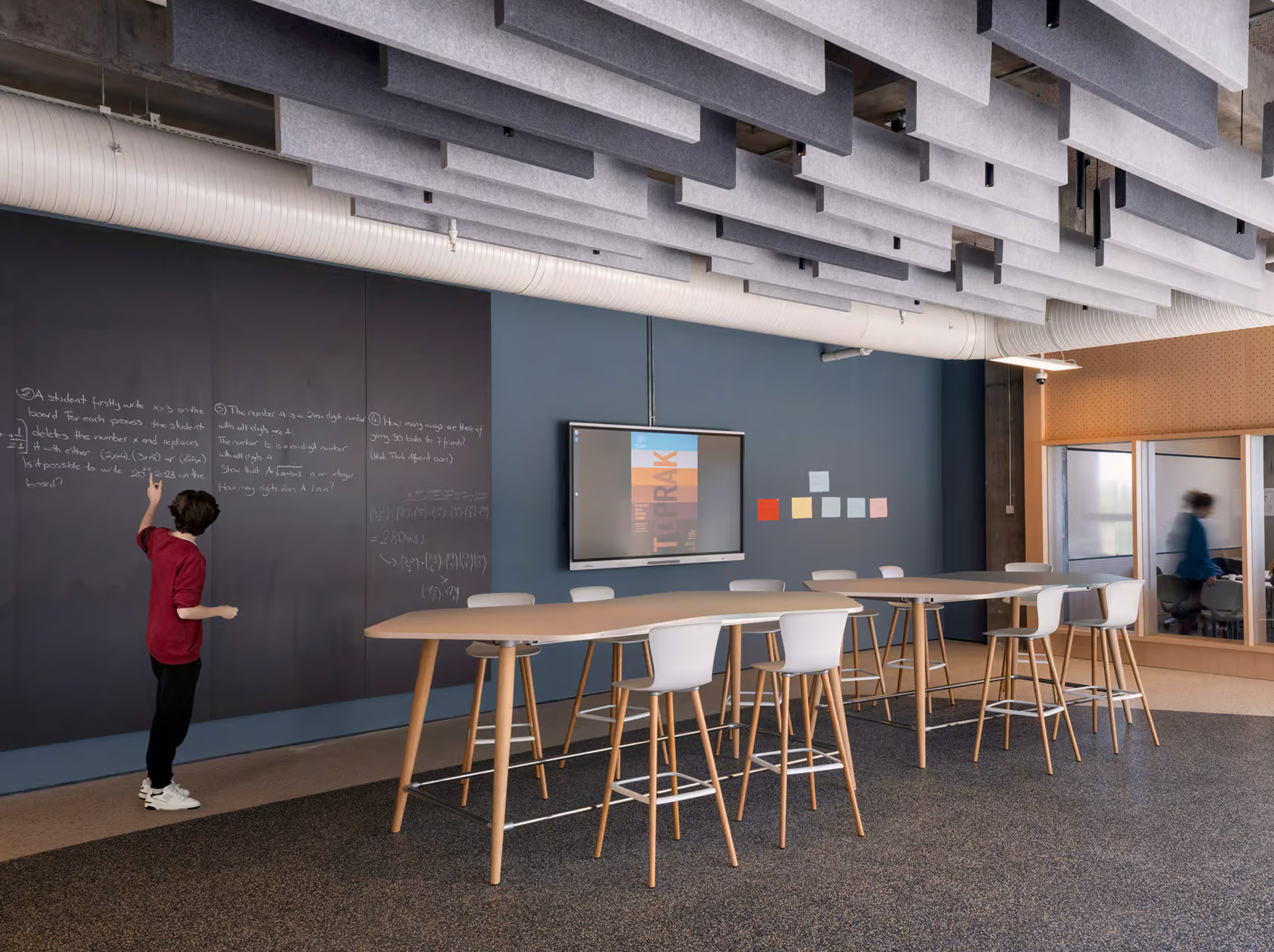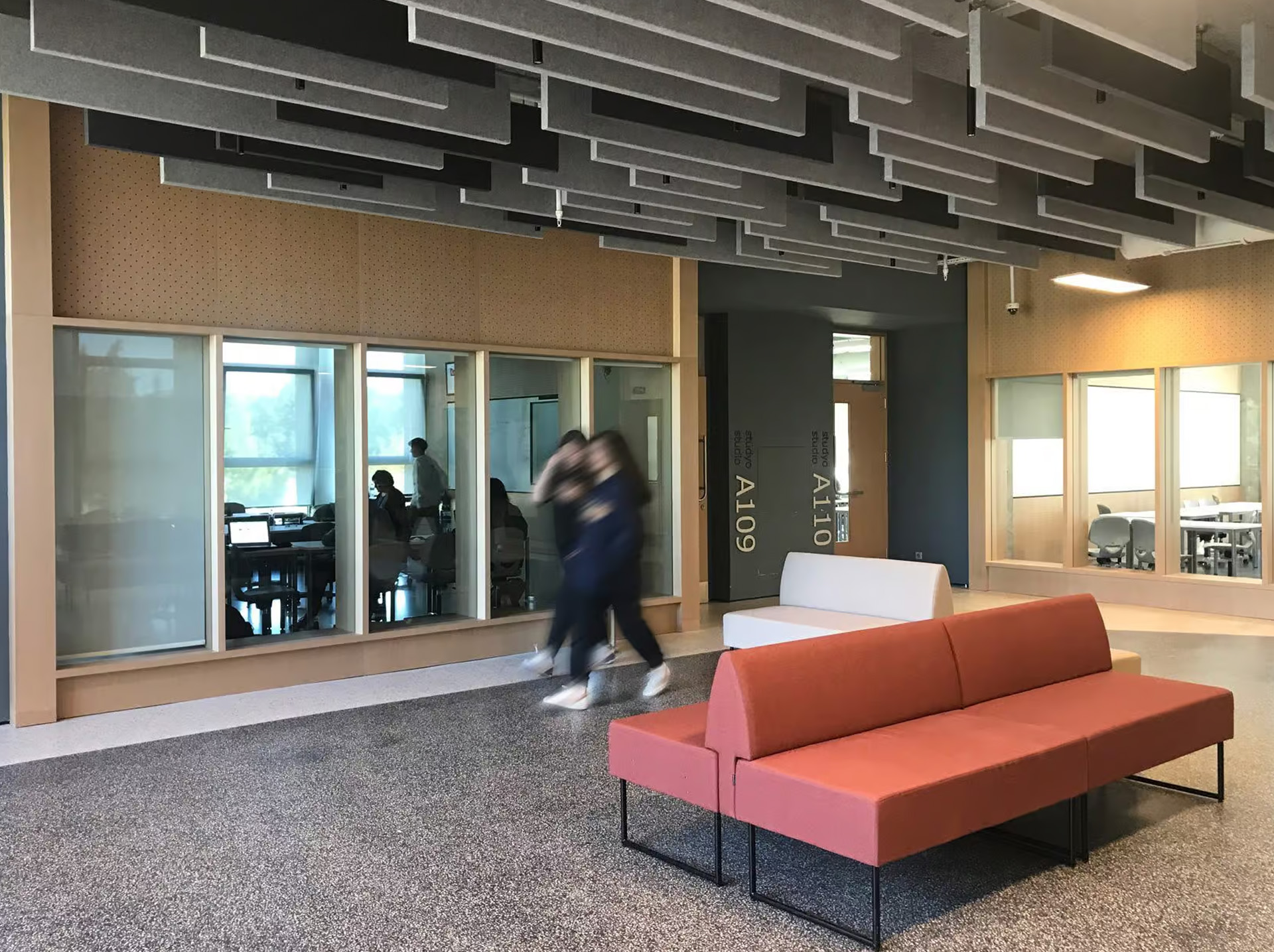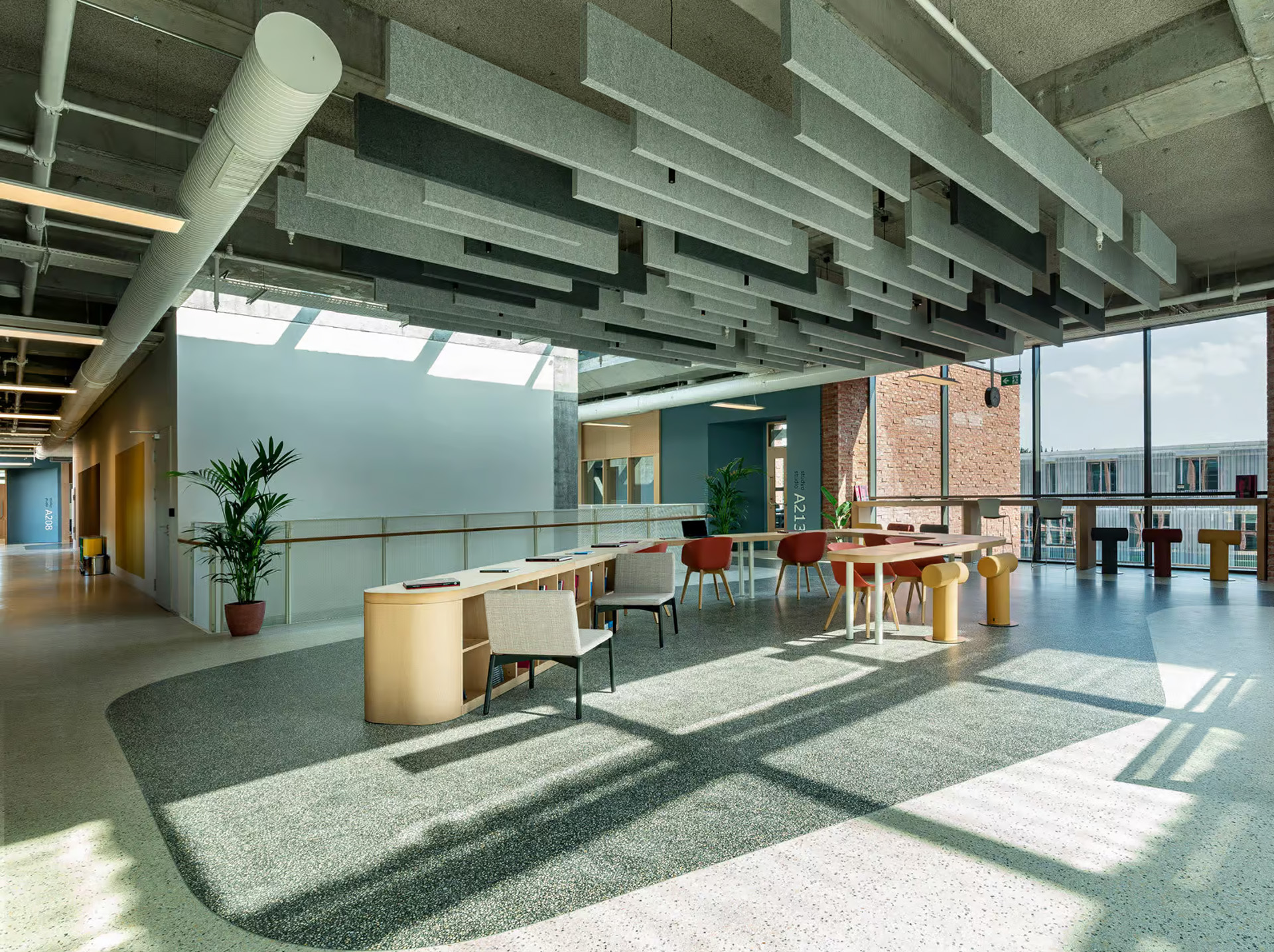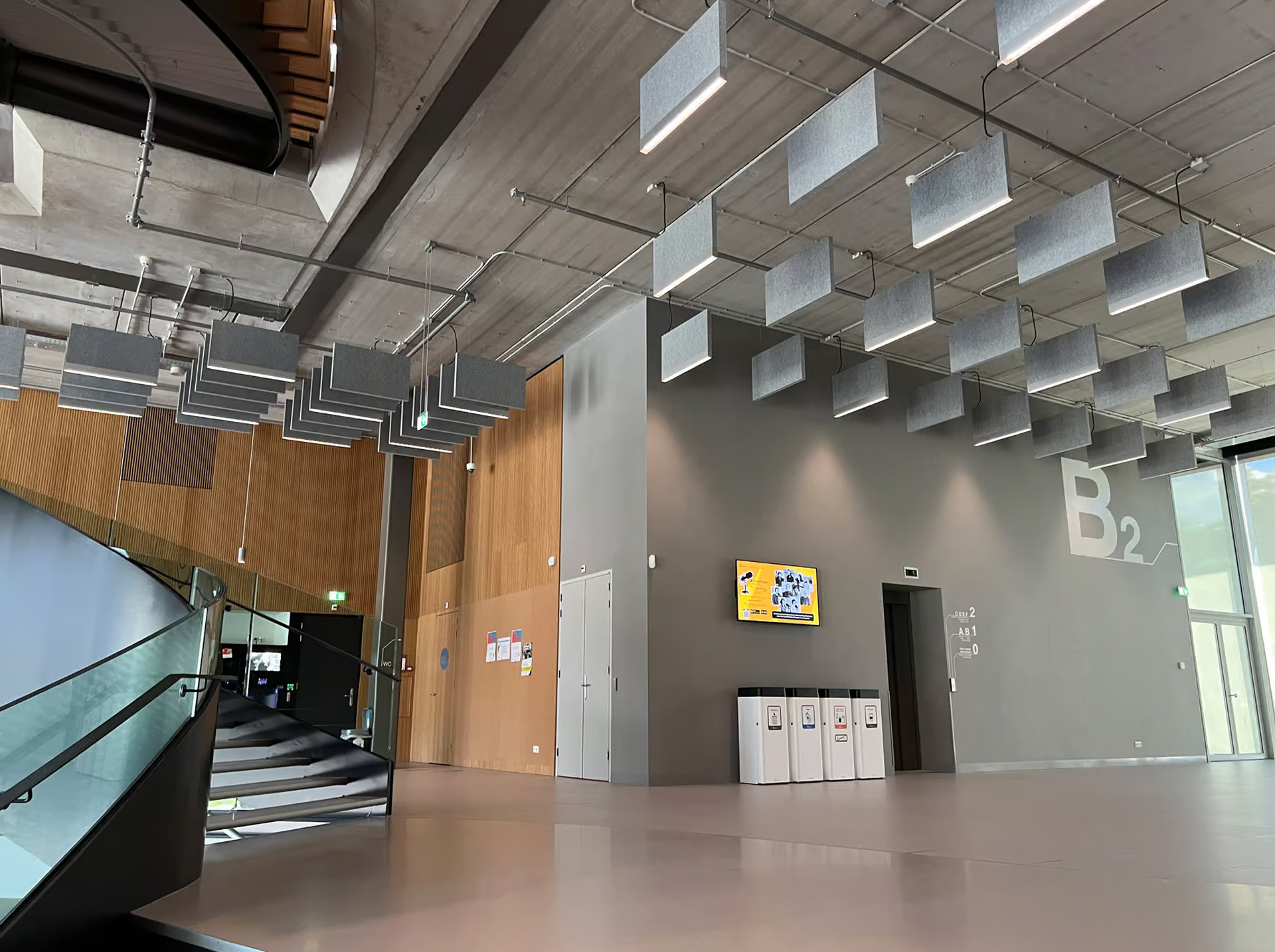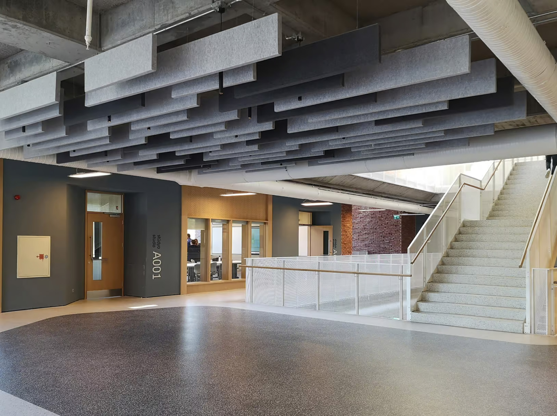 Air-Felt Baffle panels use PET felt made from 50% recycled material. The panels are lightweight and durable, which makes installation simple. The product comes in 53 Feltouch PET felt color options. These colors match the palette used across the collection.