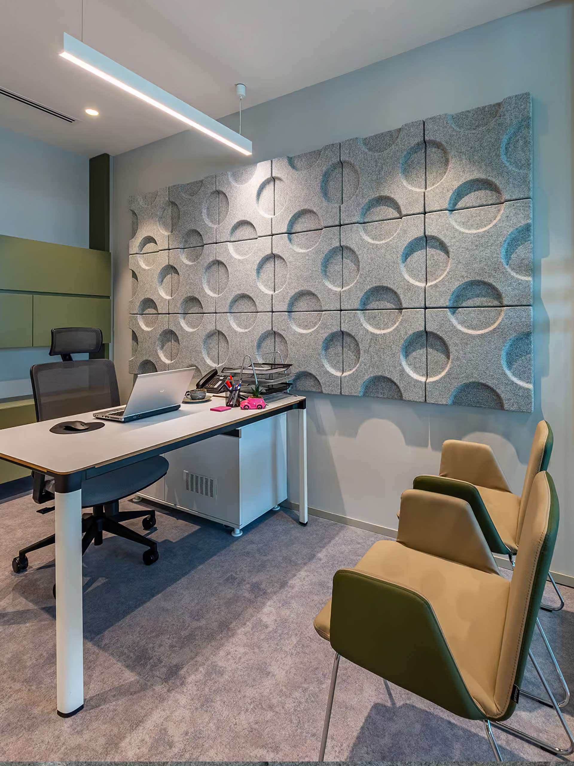 Batura Acoustic Panel works well in offices, meeting rooms, hospitality venues, educational facilities, reception areas, and public interiors. It improves acoustic comfort while adding a distinctive architectural surface.