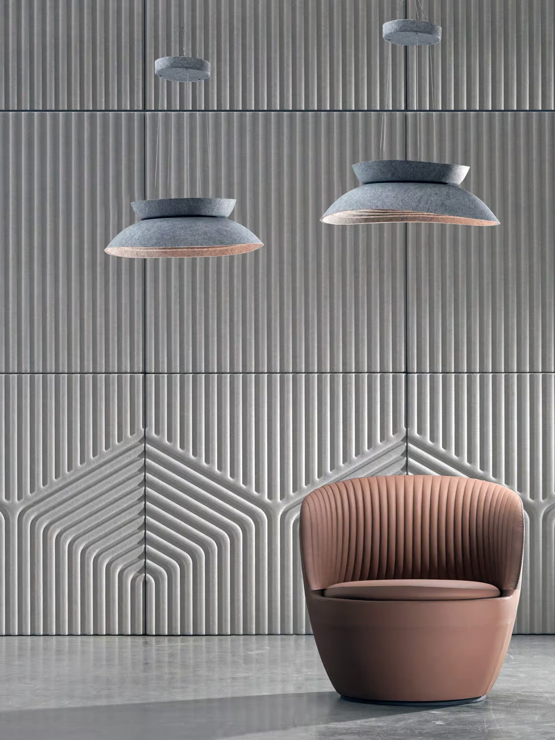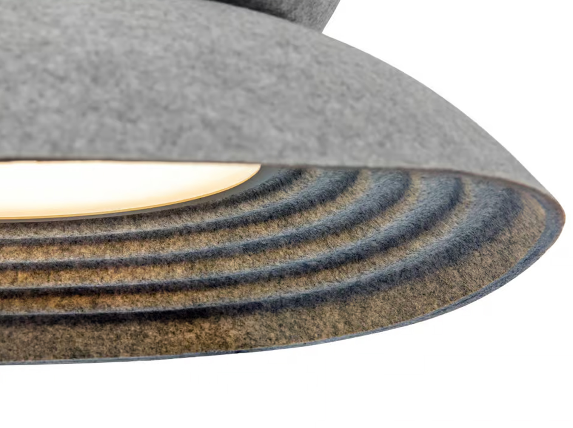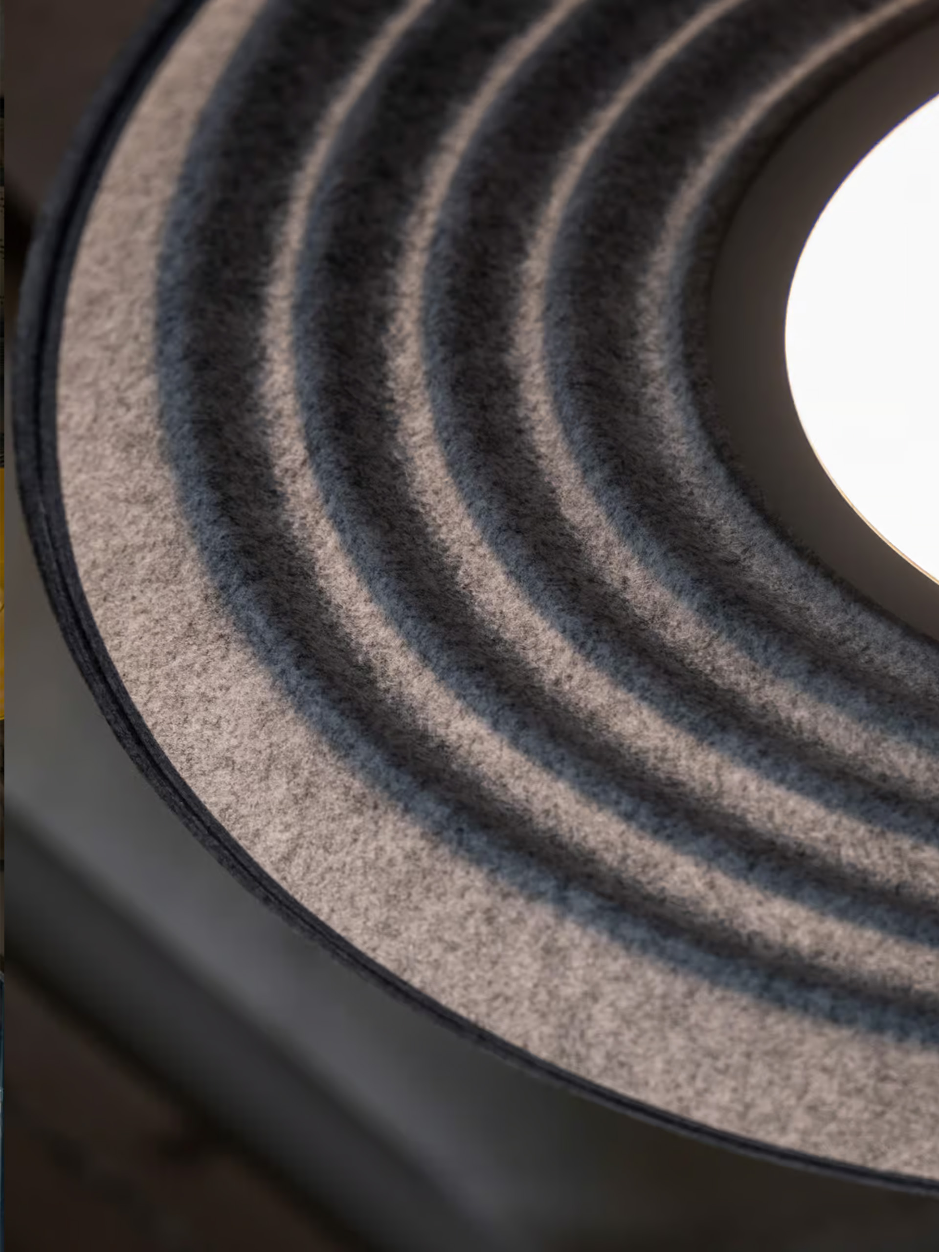 Manufactured from 50% recycled PET felt, Bowl combines sustainable material use with acoustic efficiency. The felt structure supports sound absorption while introducing a soft surface character to the design.