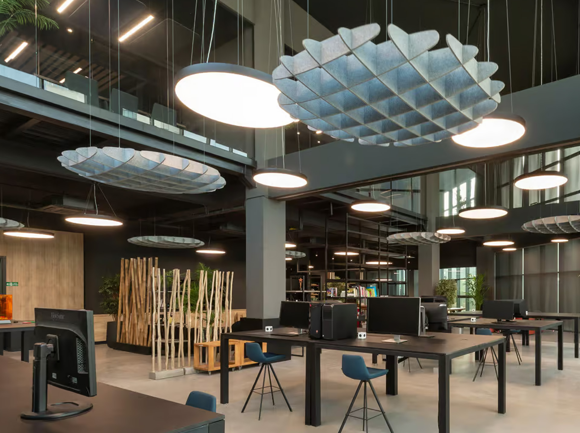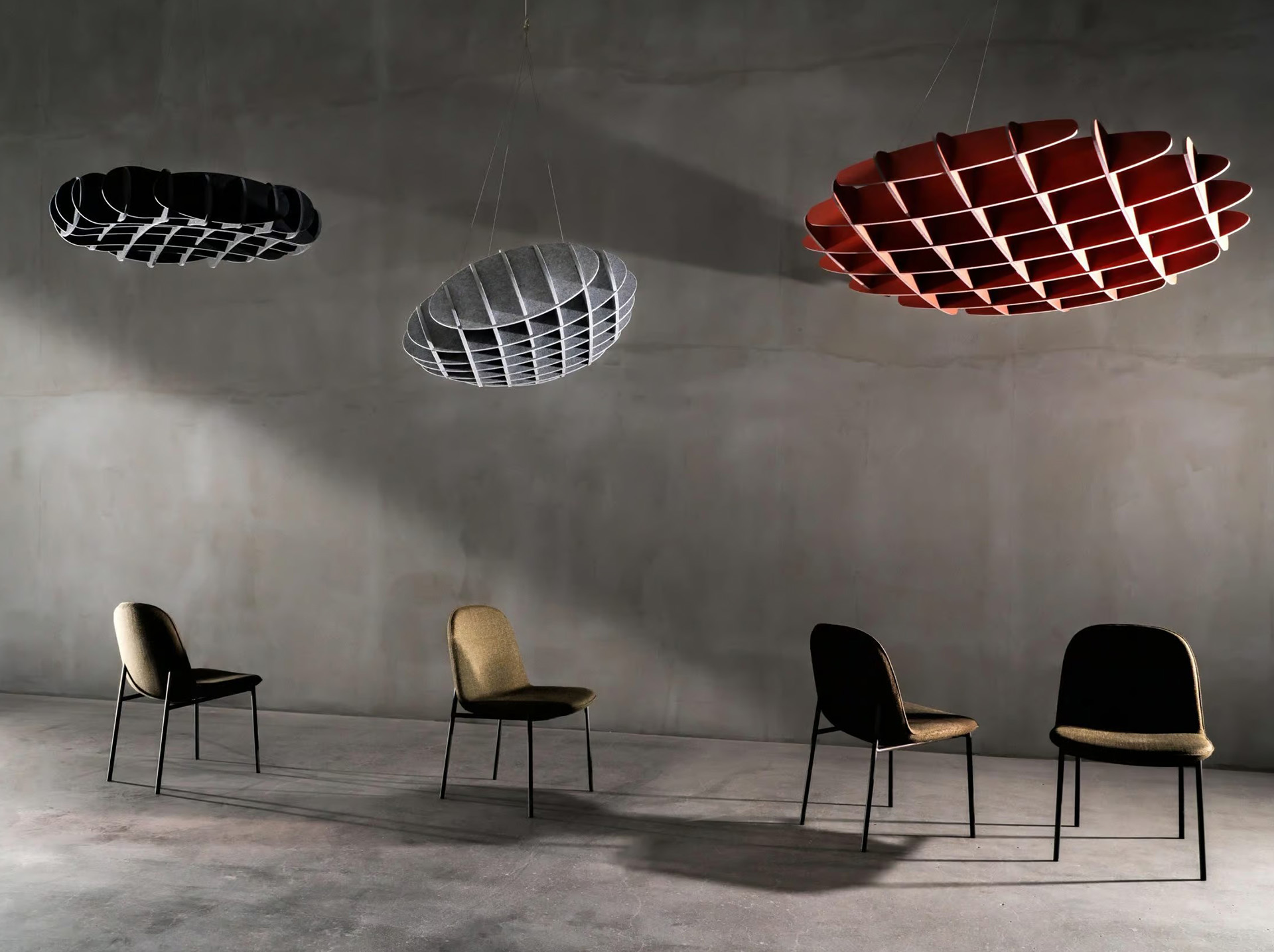 Cloud Models of the Plativity Collection offer acoustic solutions by creating unique modular hanging ceiling solutions. Semi-rigid free-hanging solutions are lightweight and easy to install. Clouds delivers tailor made acoustic solutions with cut out 12mm or 14mm thickness of Plate sheets that offers standart various dimensions.
