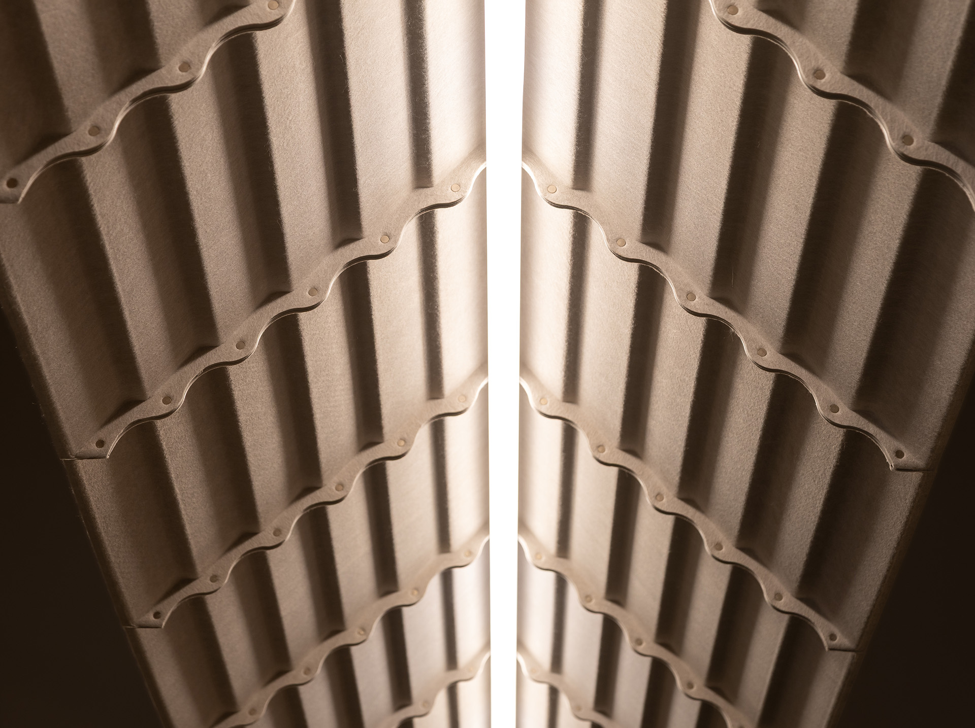 Step lampshades are produced from recycled PET felt. This material reflects light while also absorbing ambient sound. As a result, Step Pendant Lighting supports both visual comfort and acoustic balance in interior spaces.