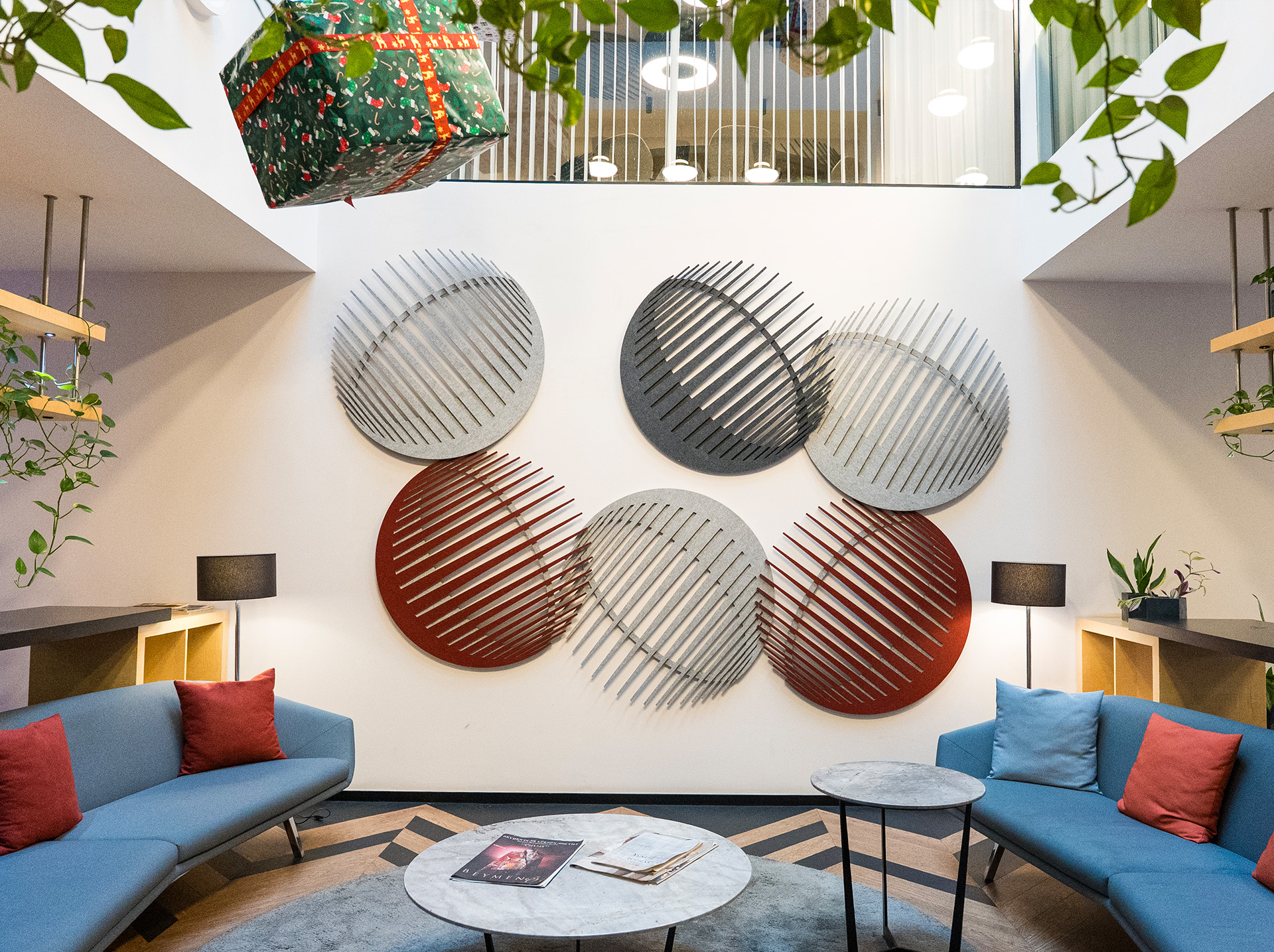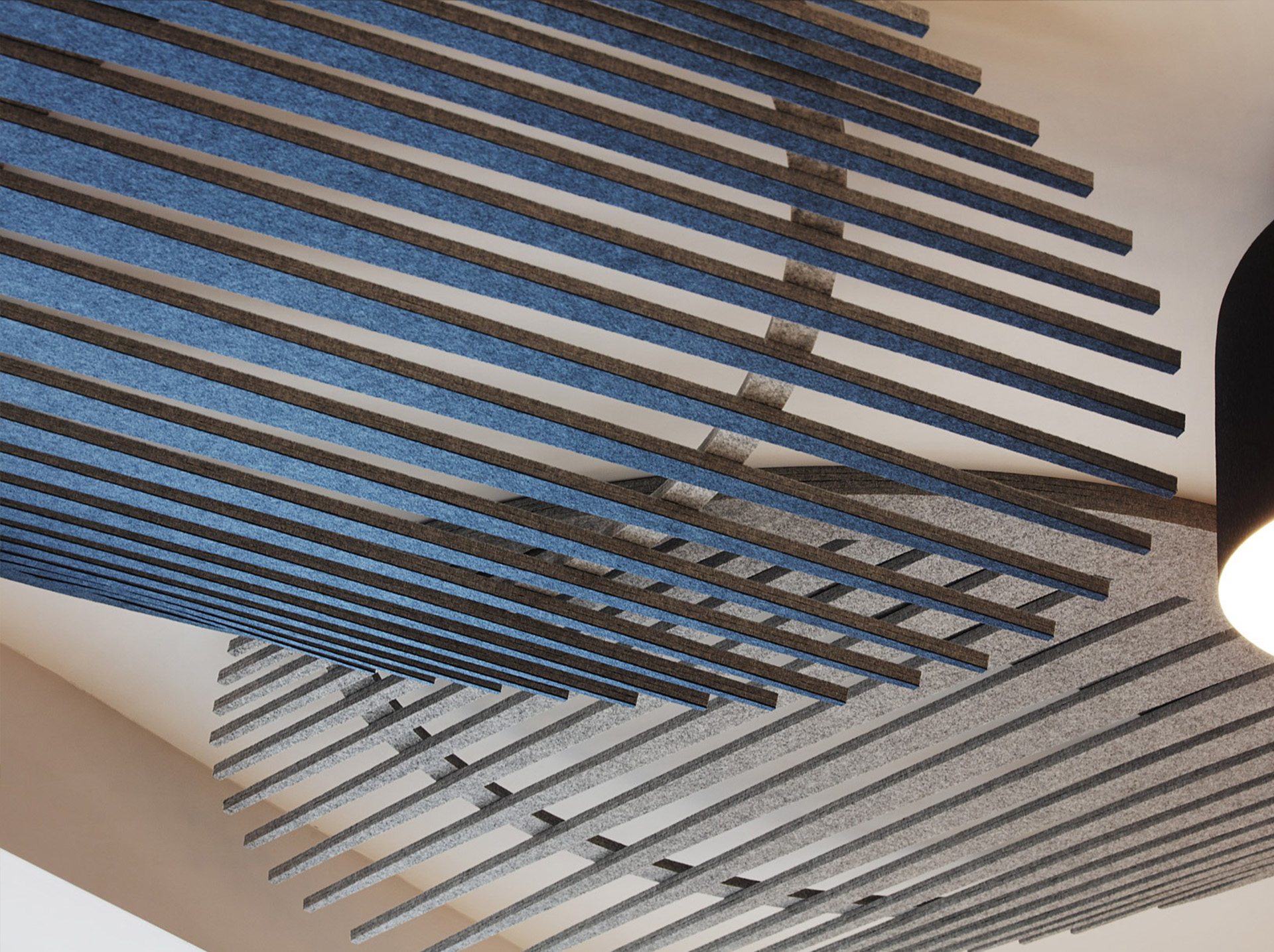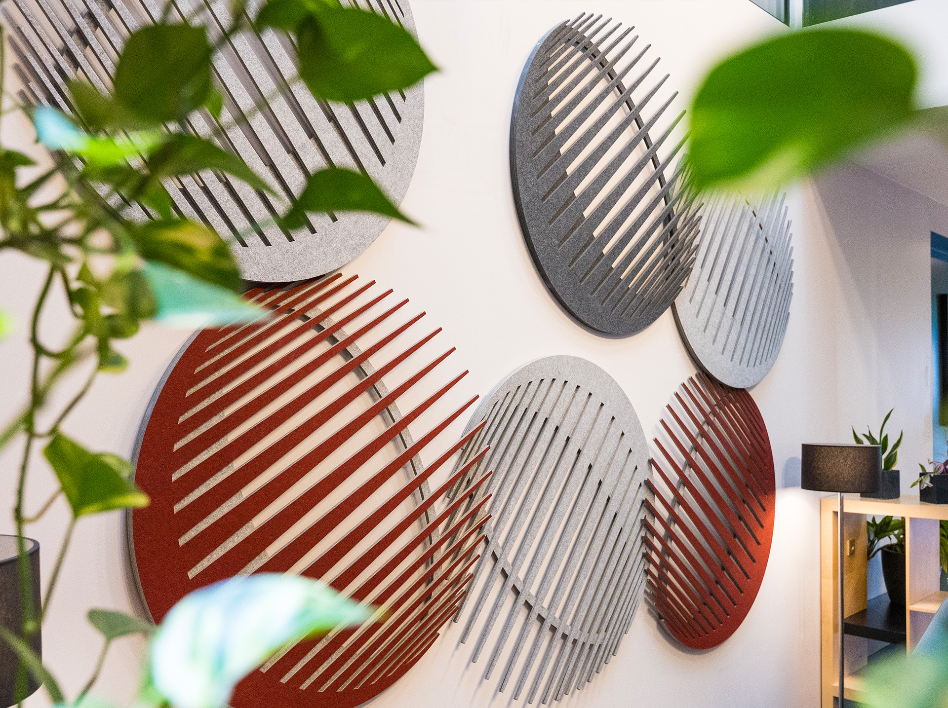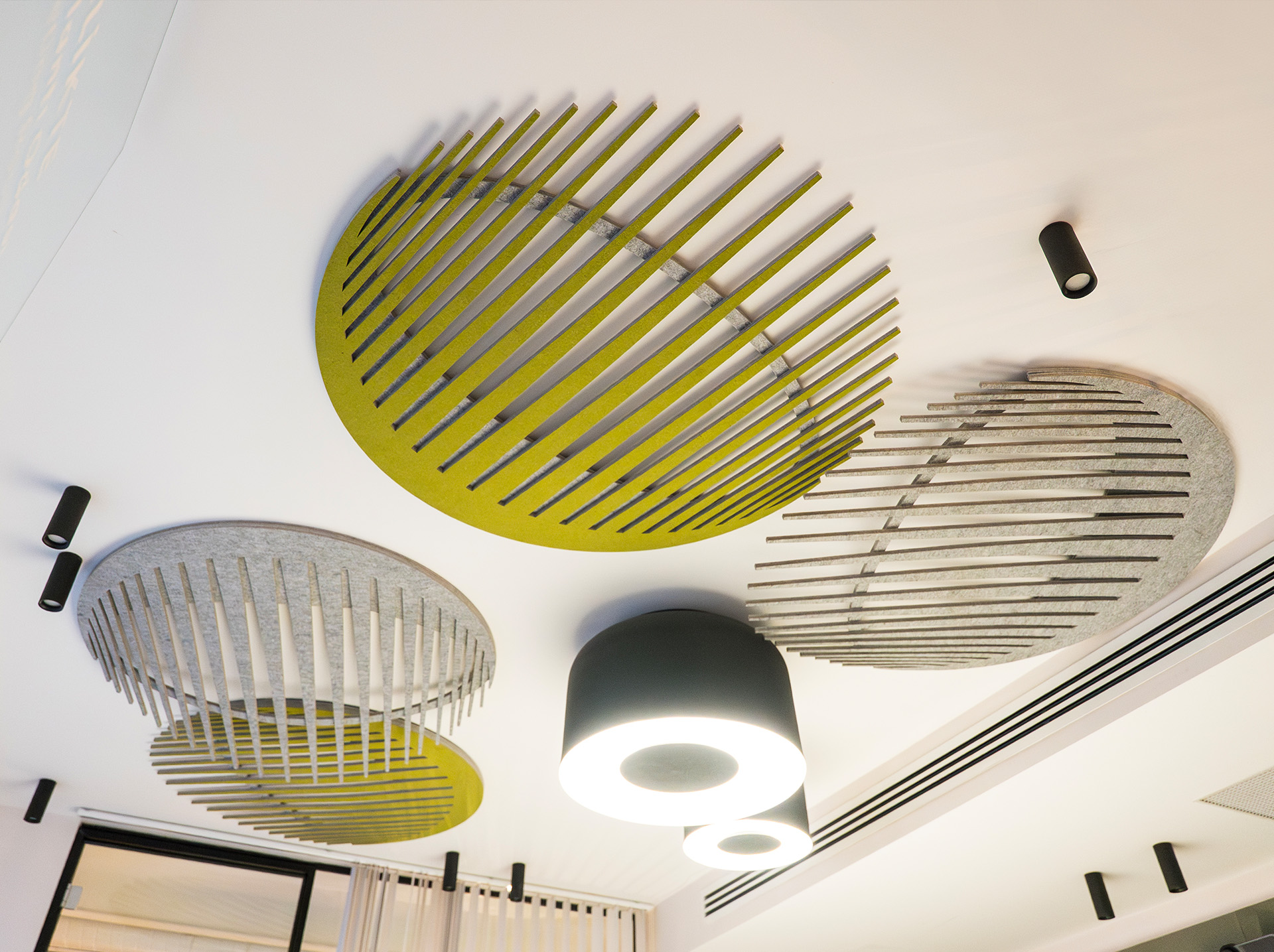 The Moon panel features a structure formed by interlocking felt plates, creating depth and rhythm within the space. This layered form language provides a strong visual identity while increasing surface area. By breaking up sound waves, the panel helps reduce reverberation time and improve overall acoustic performance.