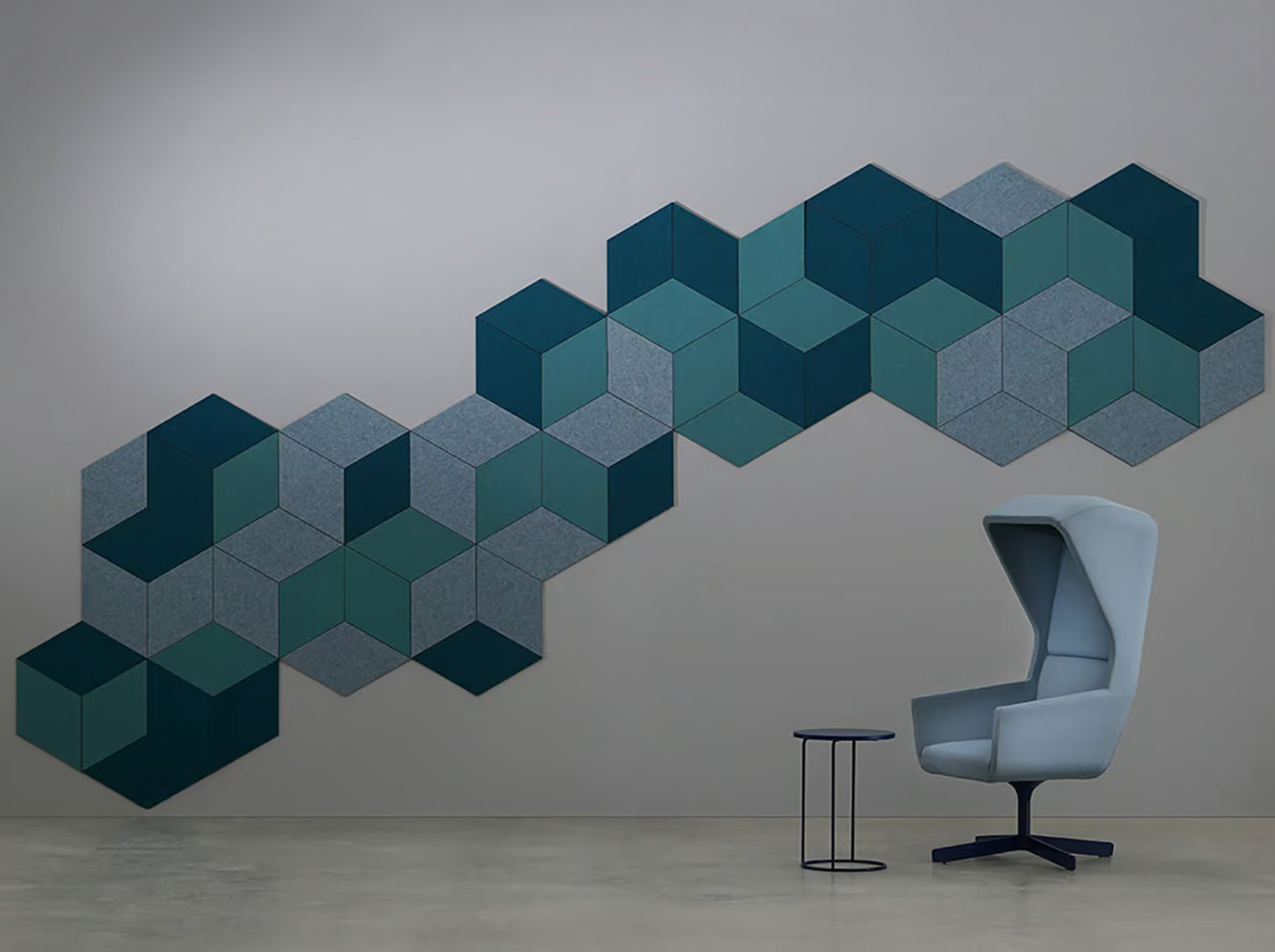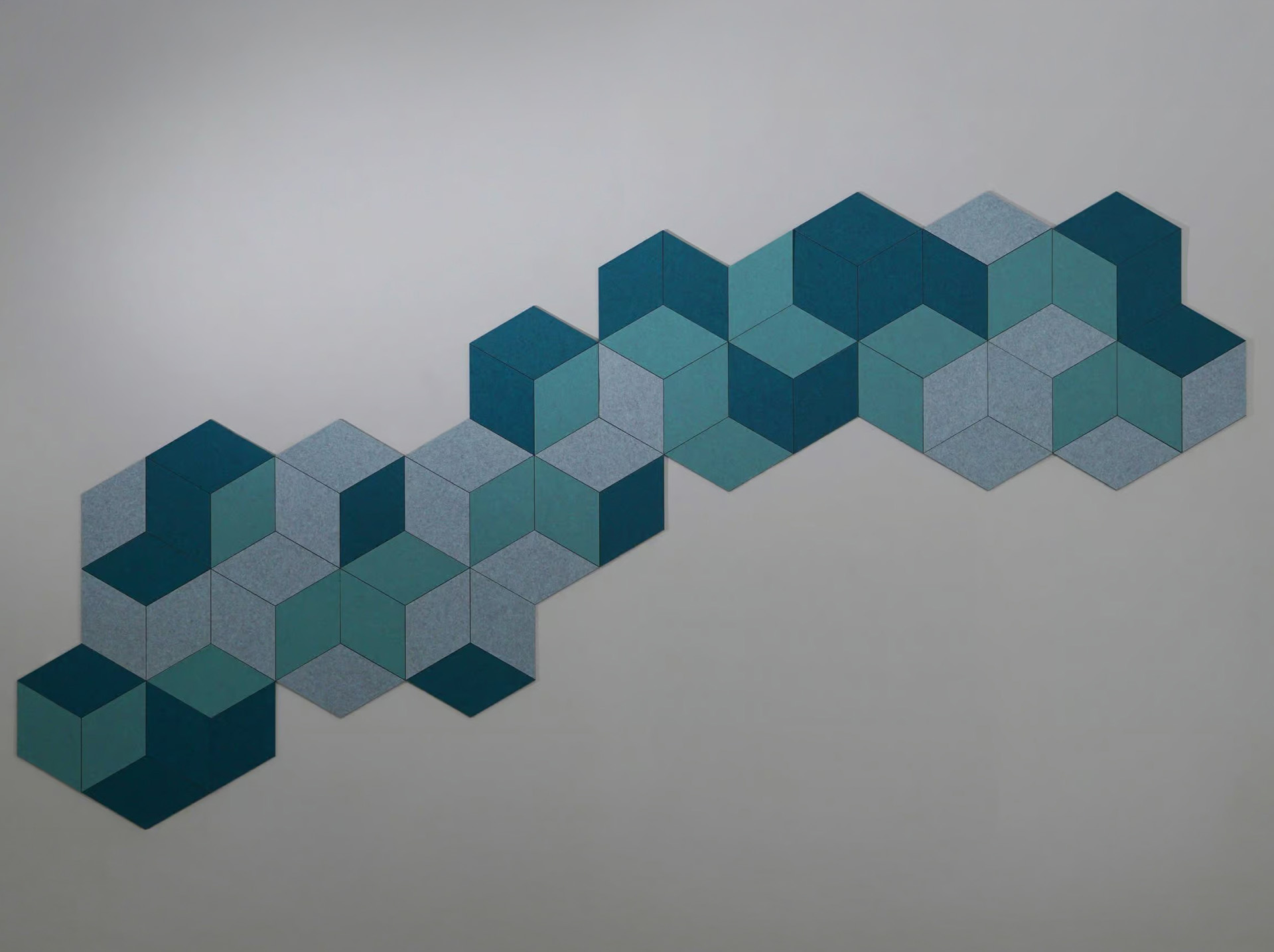 Rombus panels use PET felt produced from 50% recycled material. The material helps reduce sound reflections and supports better acoustic performance in interior spaces. Designers often use Rombus panels in offices, meeting rooms, education spaces, hospitality interiors, and social areas. The rhombus form allows different panel orientations. Designers can rotate and combine panels to create various geometric layouts and continuous wall patterns. This flexibility enables unique graphic compositions on interior walls.