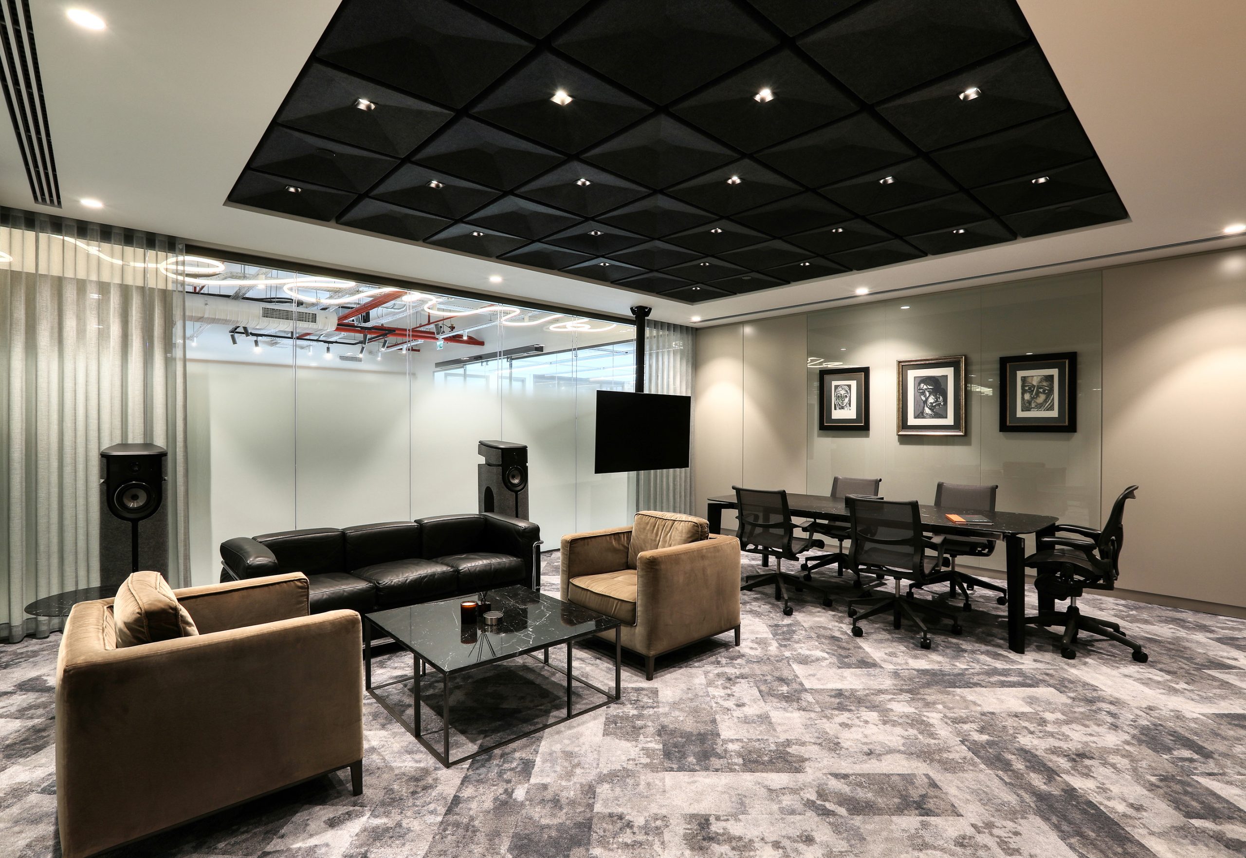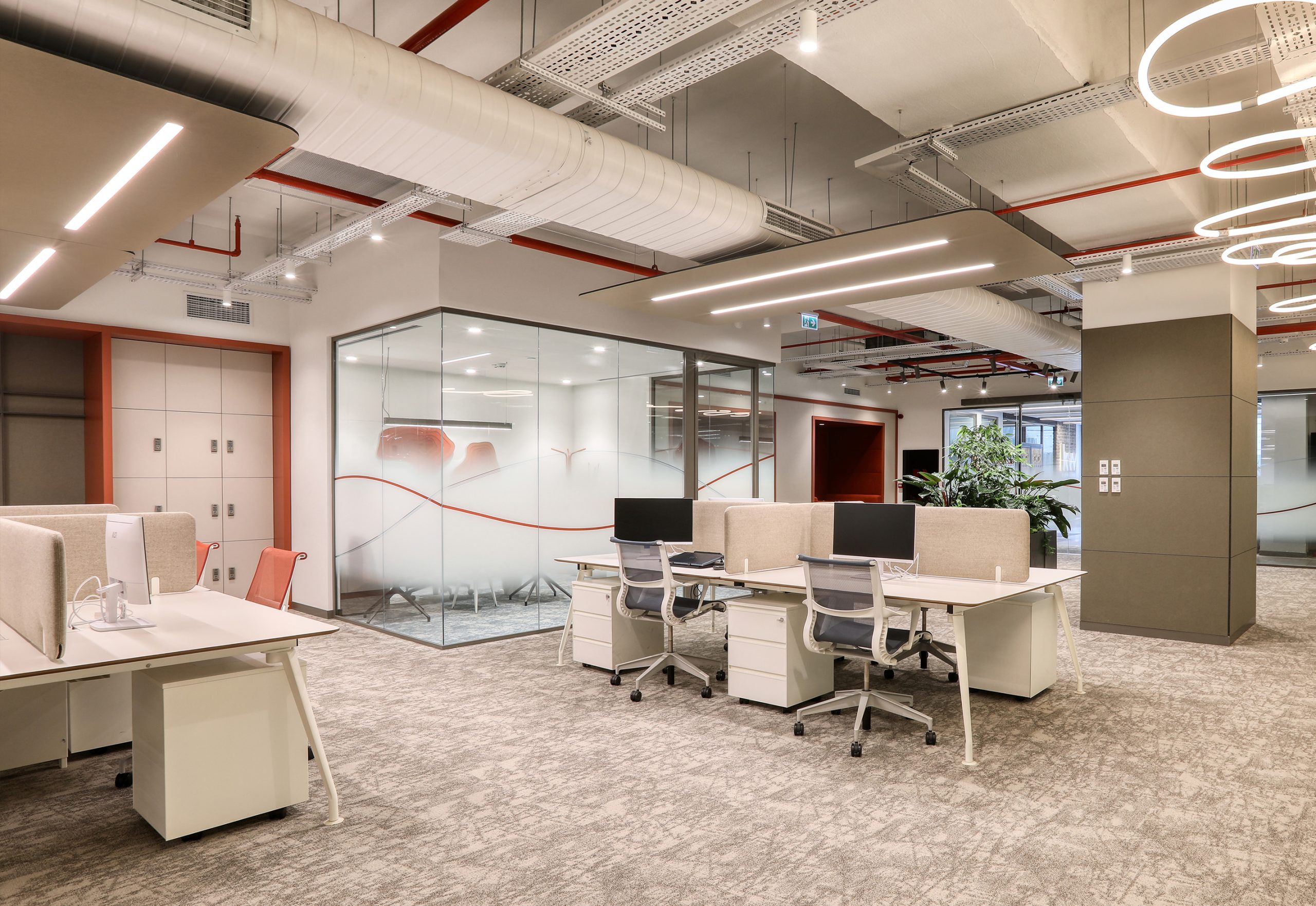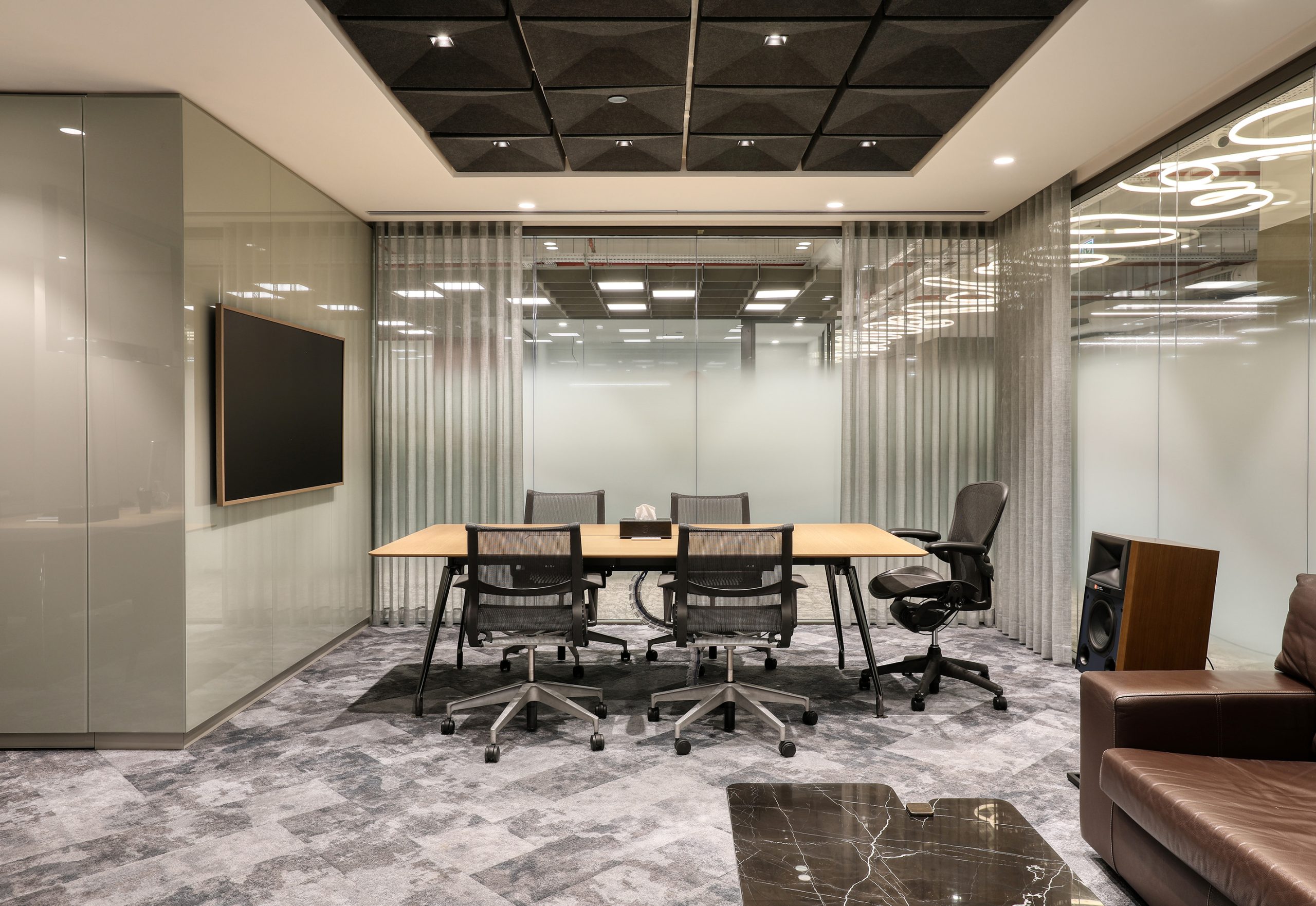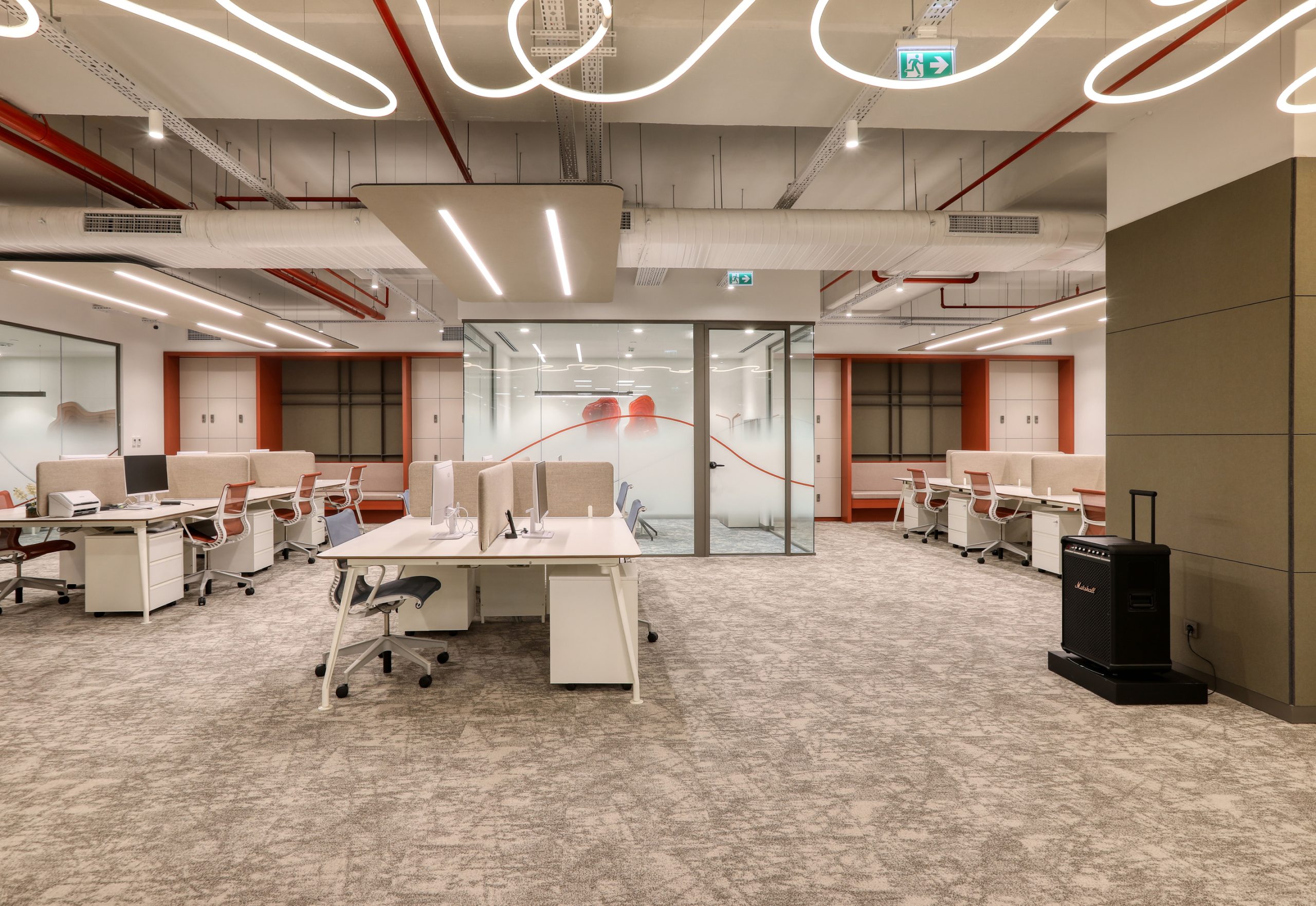 The office includes work areas, meeting rooms, circulation zones and a central info desk. Because of this, room acoustics help to reduce noise and support focus.
