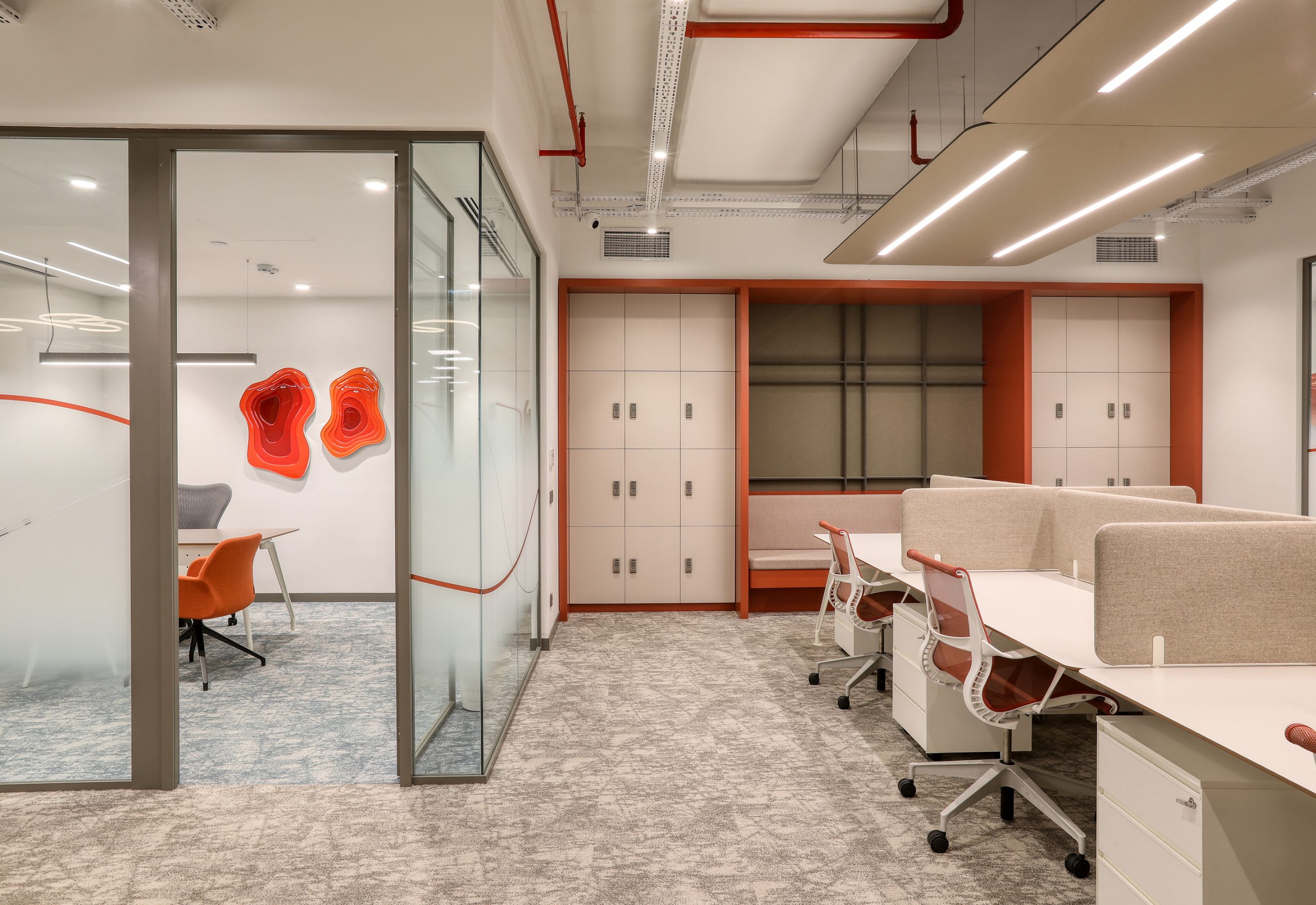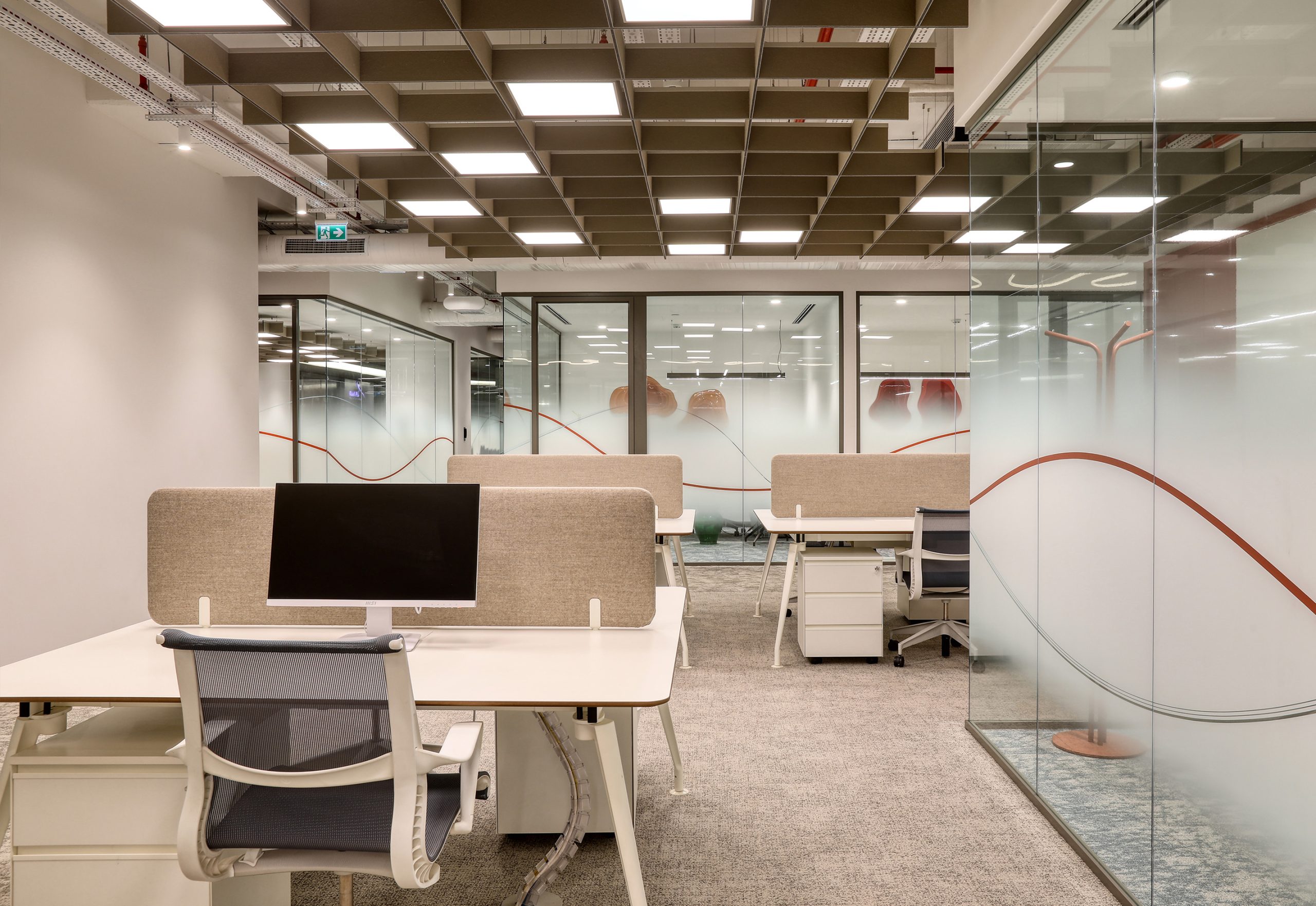 To improve sound comfort, Feltouch used different acoustic systems throughout the office. First, Flat Cloud panels were hanged from the ceilings to support volume acoustics. They also create a strong ceiling rhythm. Next, Plate panels covering the columns in circulation areas reduced sound reflection. Behind the info desk, Octopus panels created a visual highlight and improved sound absorption. In addition, Grid ceiling panels in meeting rooms and above worktables helped to control sound levels and improved speech clarity.
