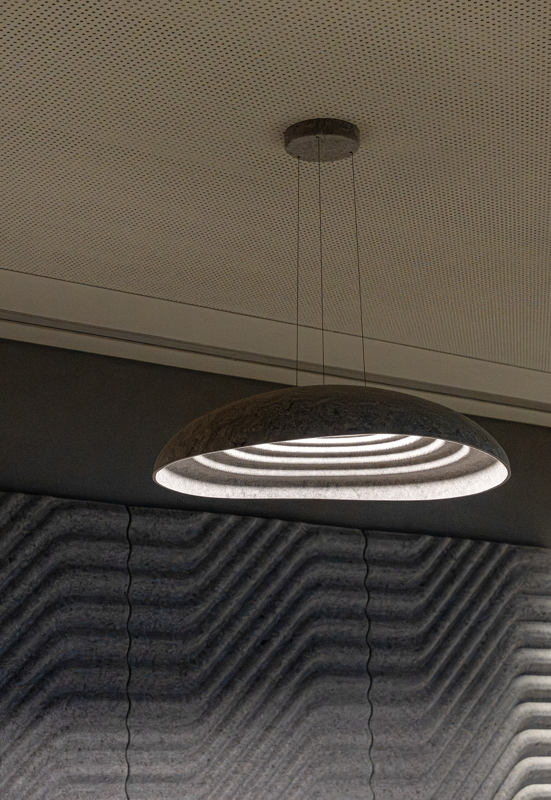 Within the open office areas, Make Up Lighting elements introduce an additional acoustic layer to the workspace. In this way, they help regulate sound reflections in large shared environments and contribute to a calmer working atmosphere.
