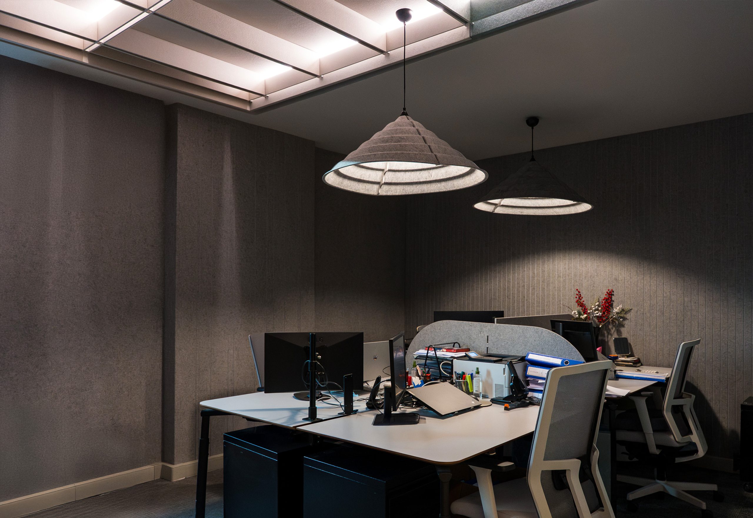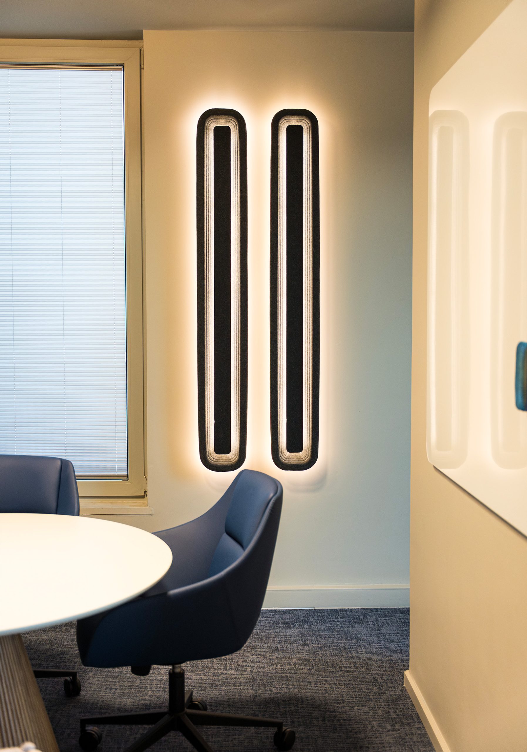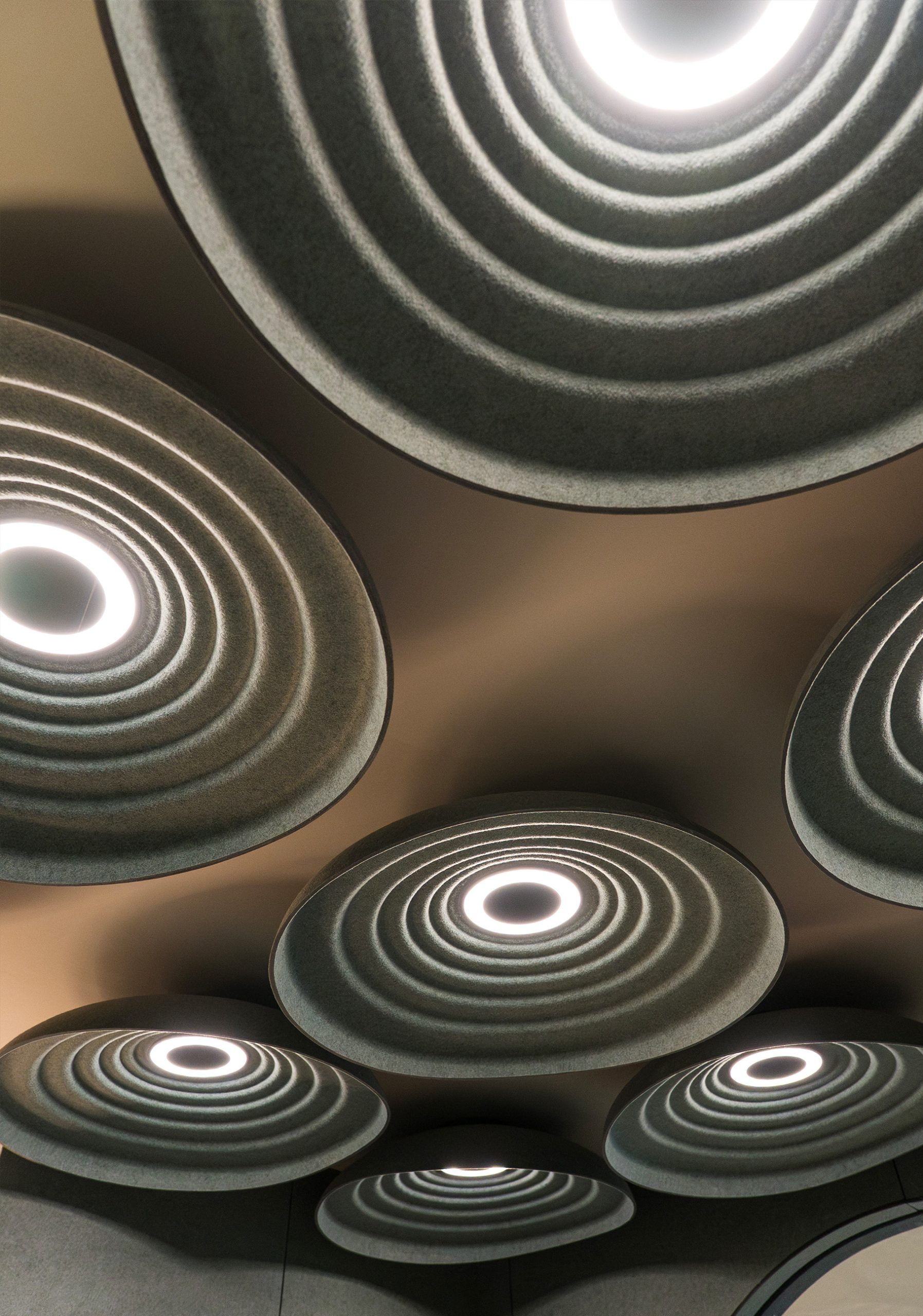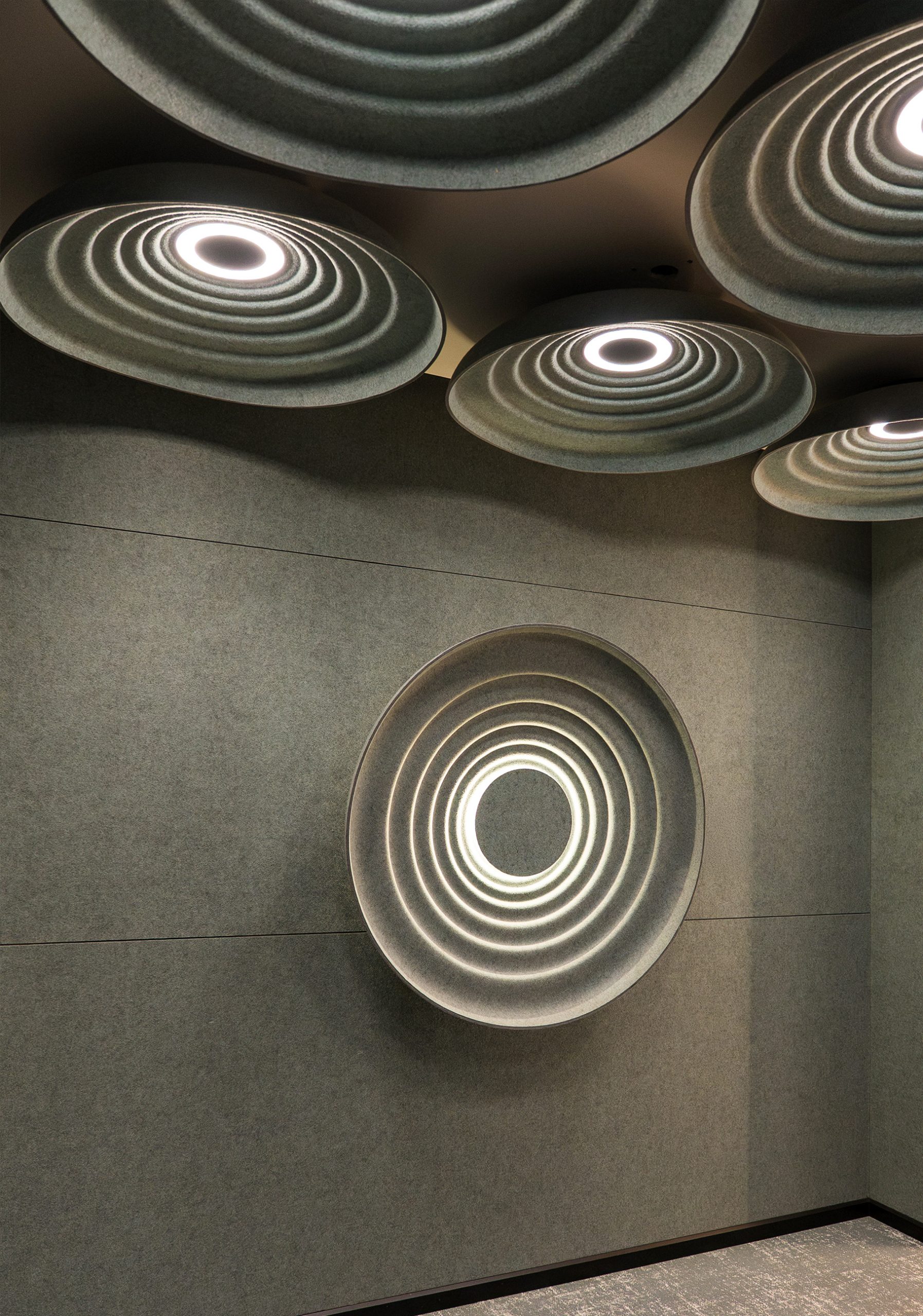 Lighting elements also play an active role in the acoustic concept. The Ra Circle Wall Lamp combines lighting with acoustic felt surfaces, enhancing both visual comfort and sound absorption while reinforcing a cohesive interior language.