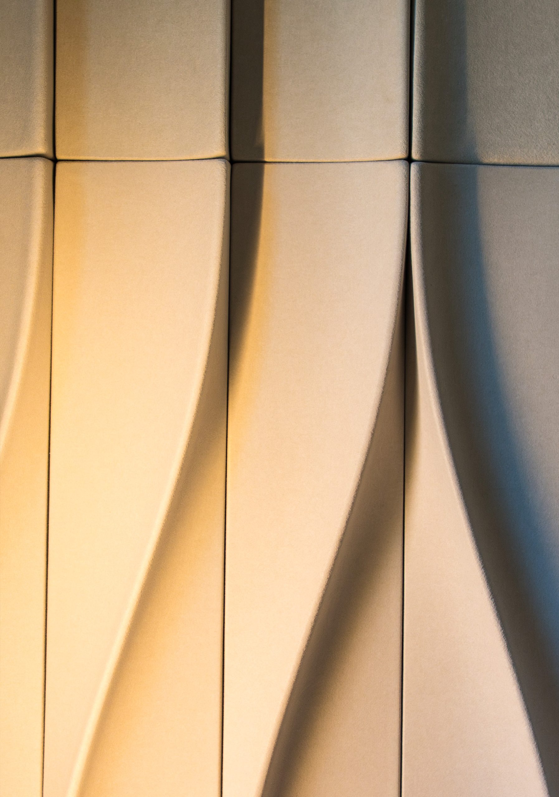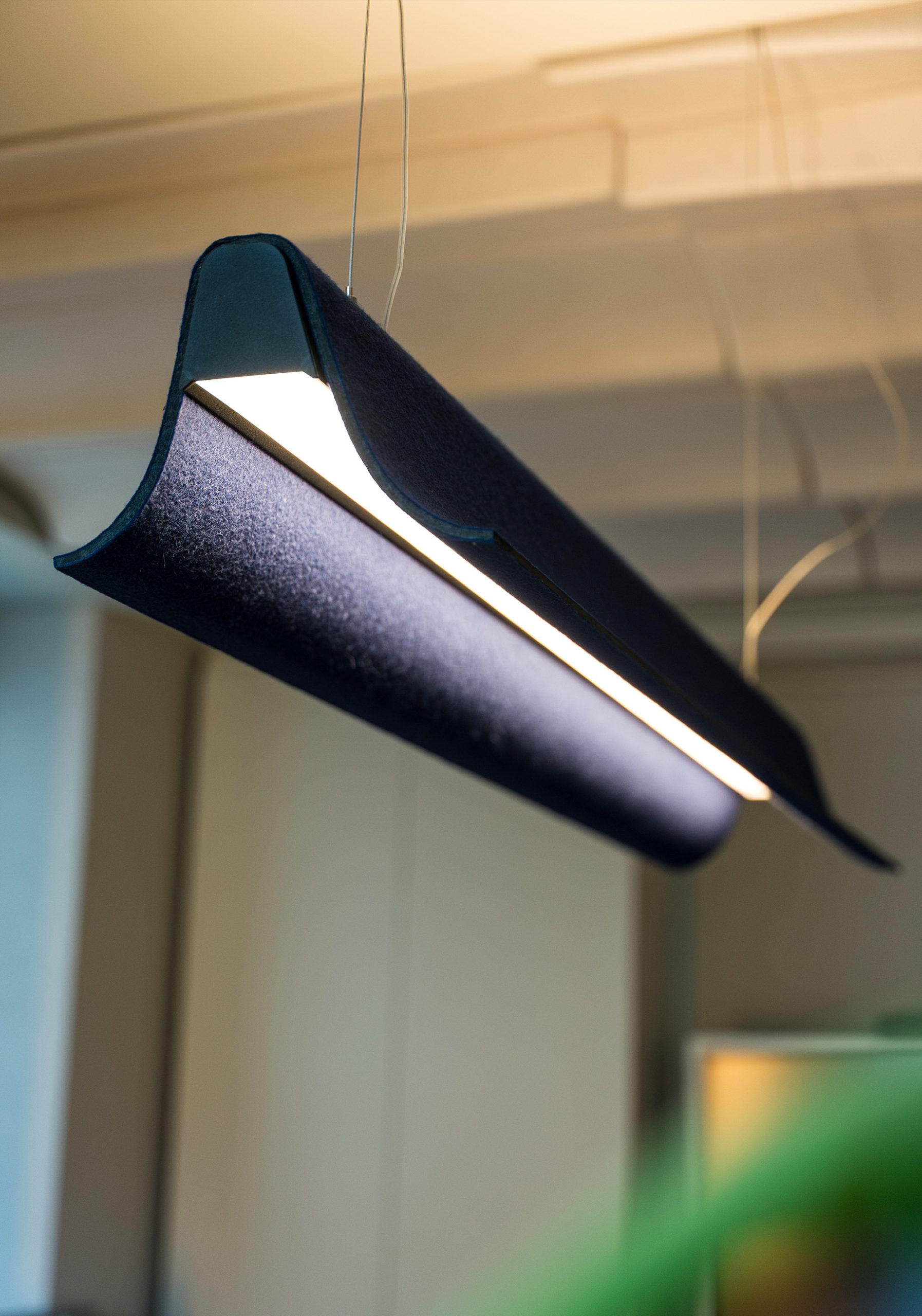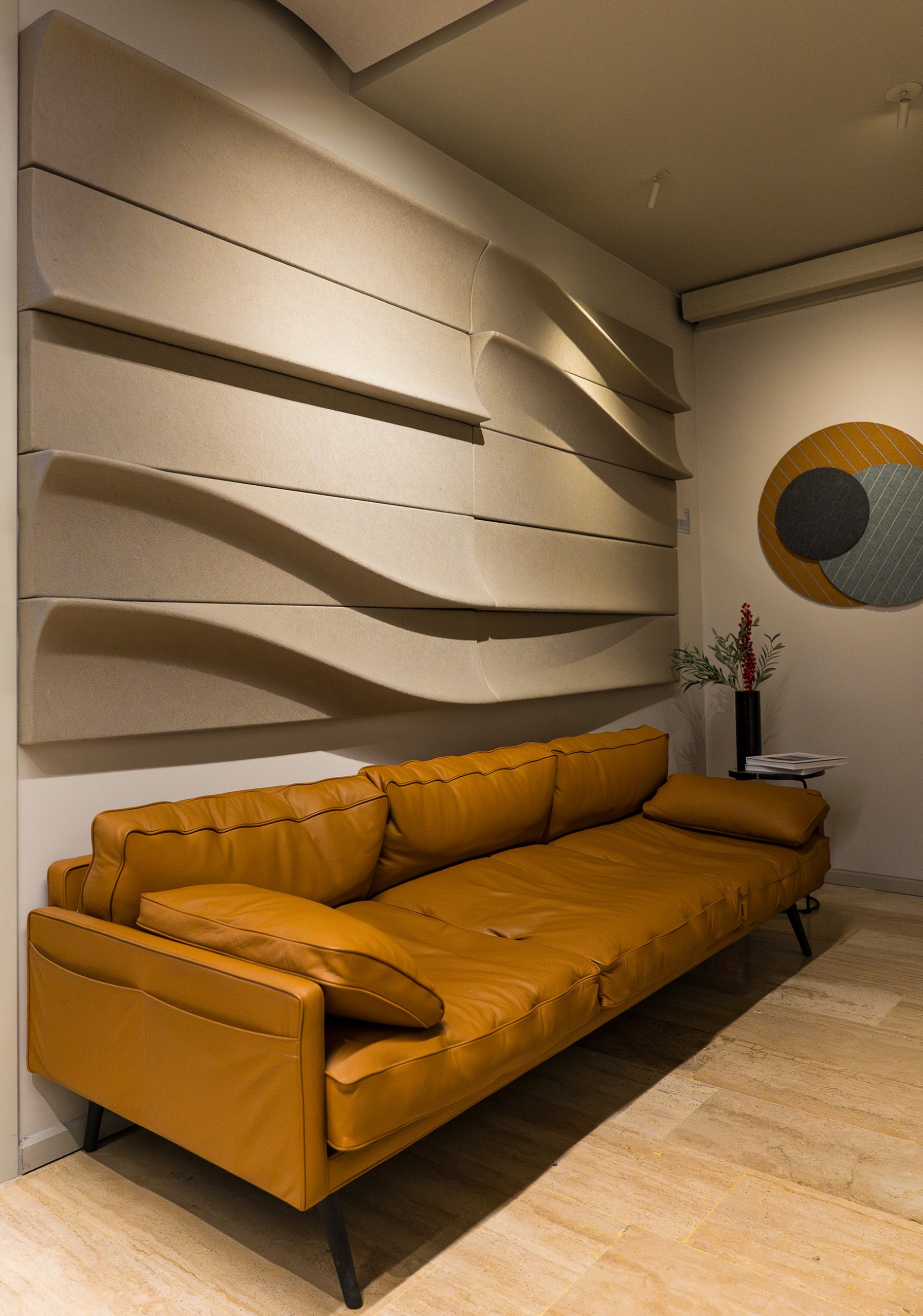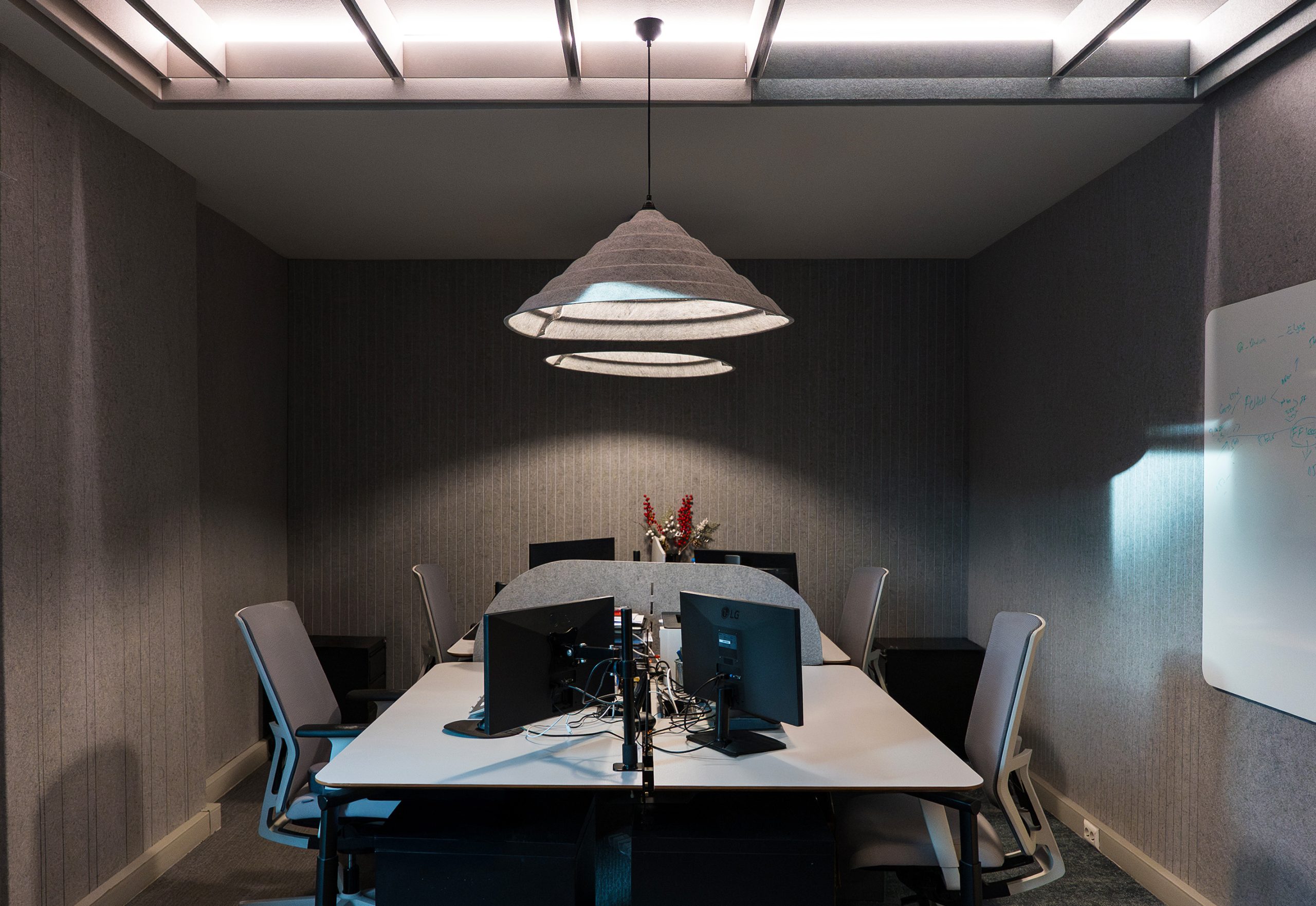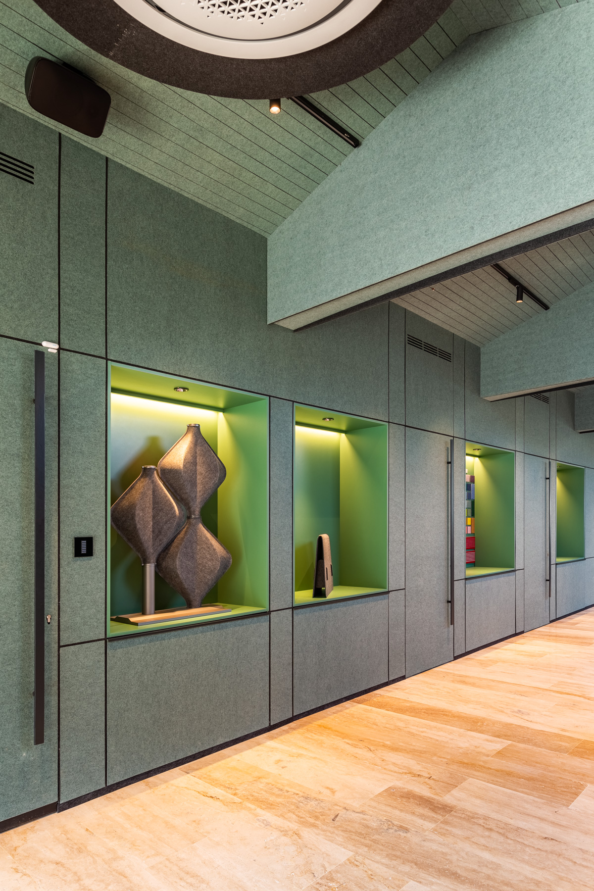 Lighting elements also play an active role in the acoustic concept. The Ra Circle Wall Lamp combines lighting with acoustic felt surfaces, enhancing both visual comfort and sound absorption while reinforcing a cohesive interior language.