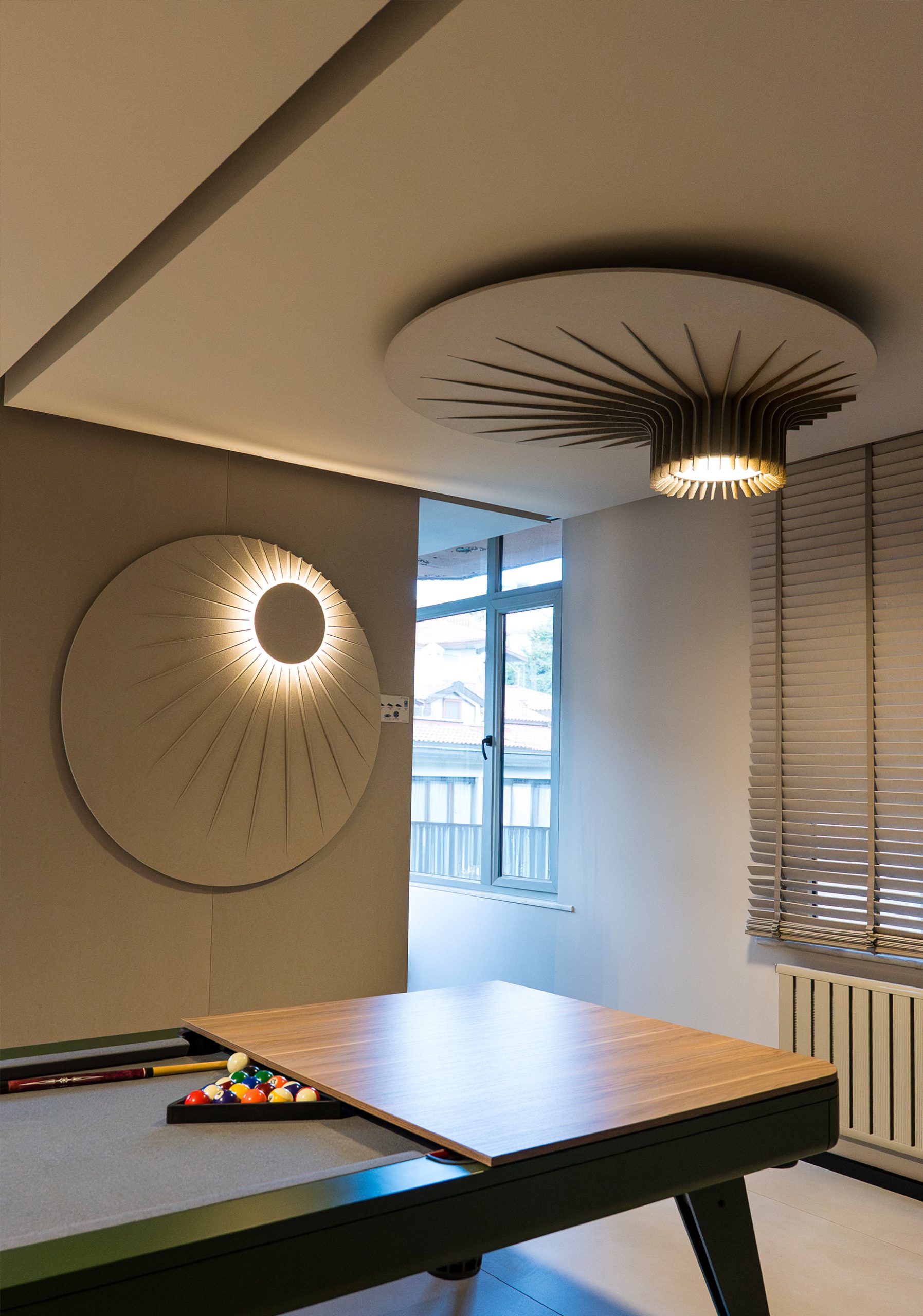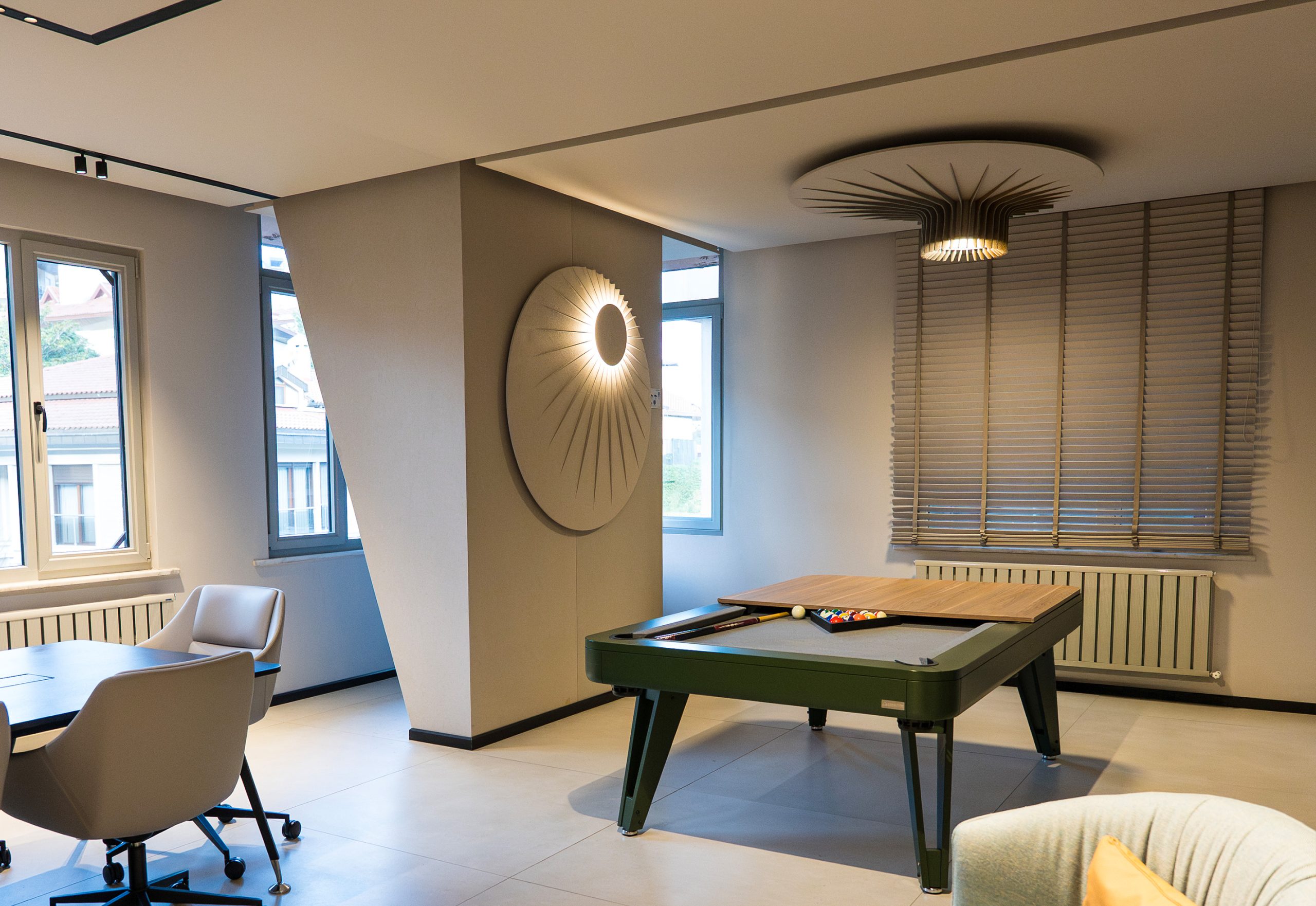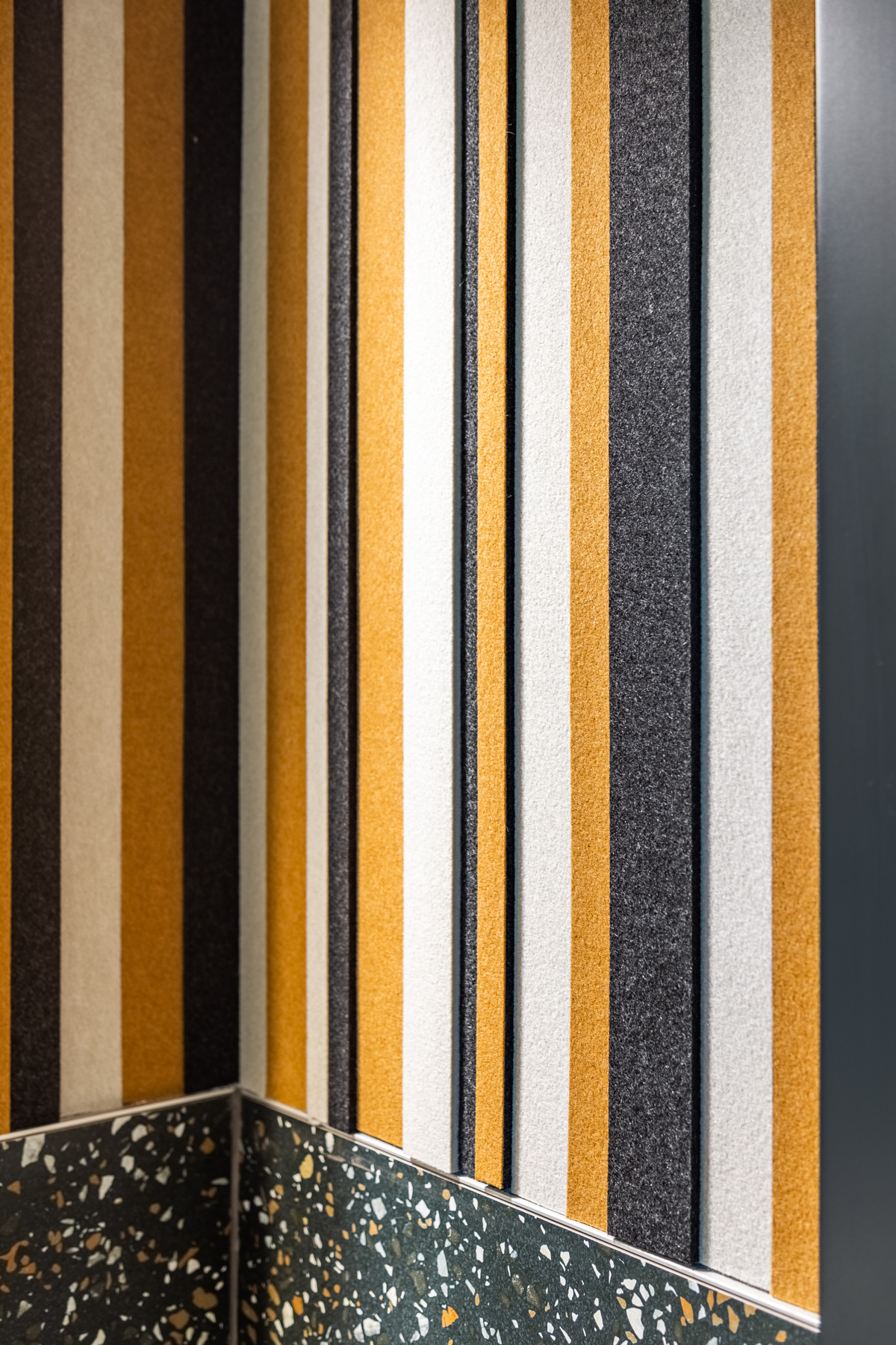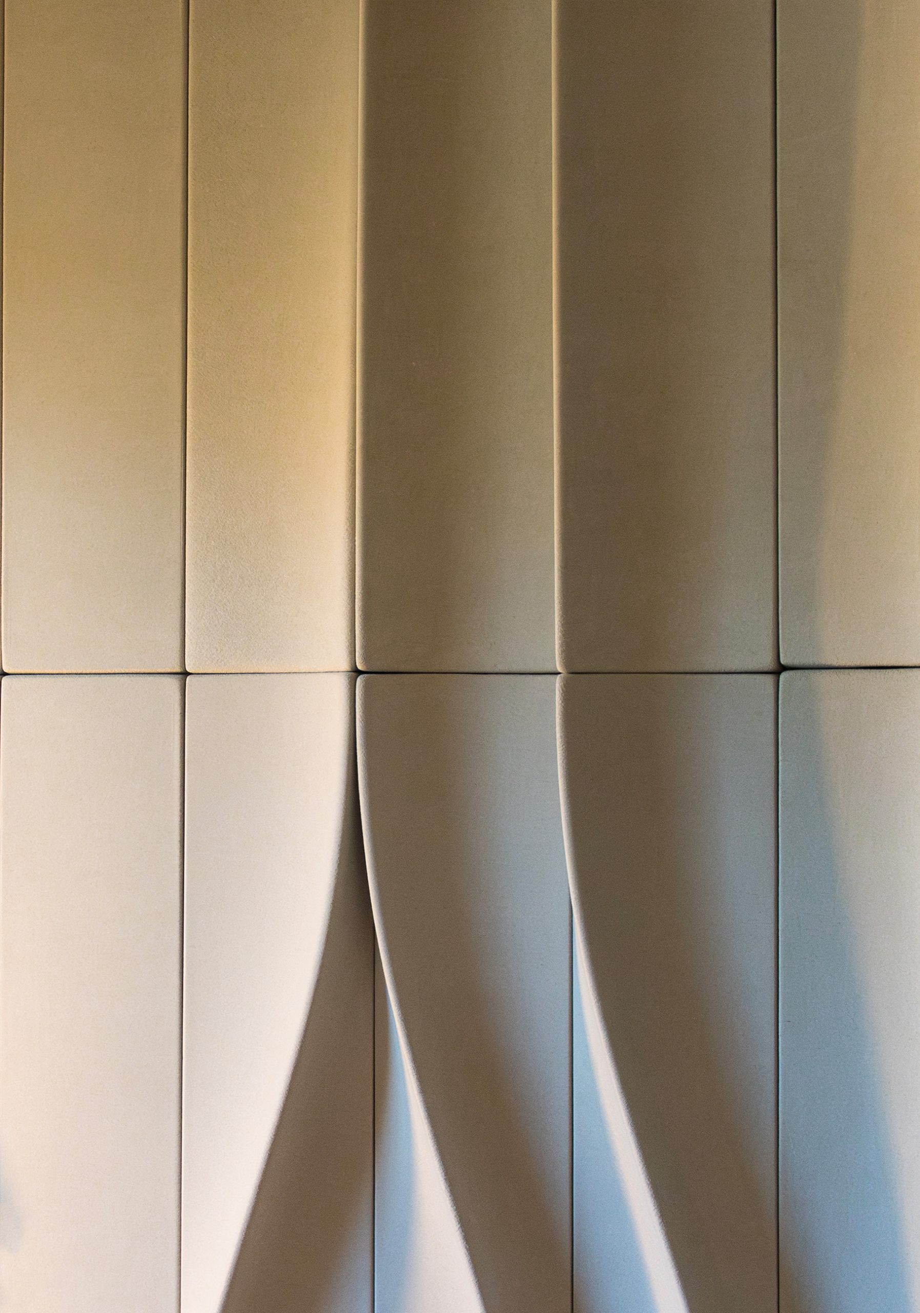 Lighting elements also play an active role in the acoustic concept. The Ra Circle Wall Lamp combines lighting with acoustic felt surfaces, enhancing both visual comfort and sound absorption while reinforcing a cohesive interior language.