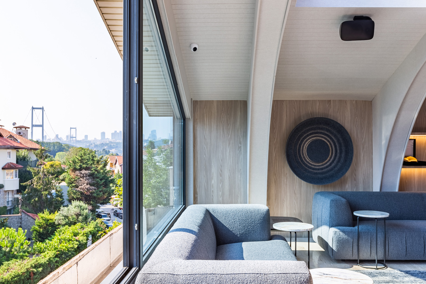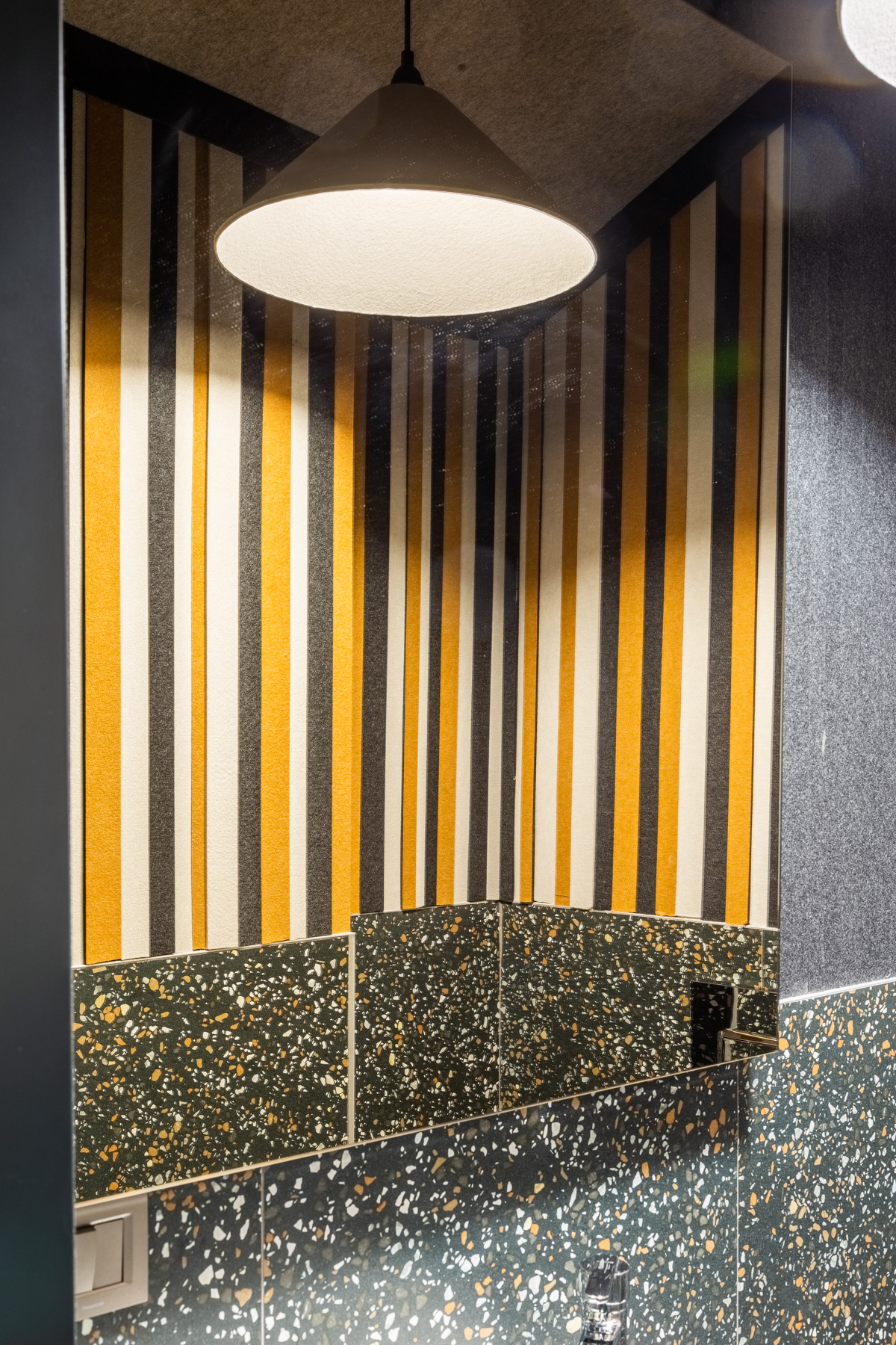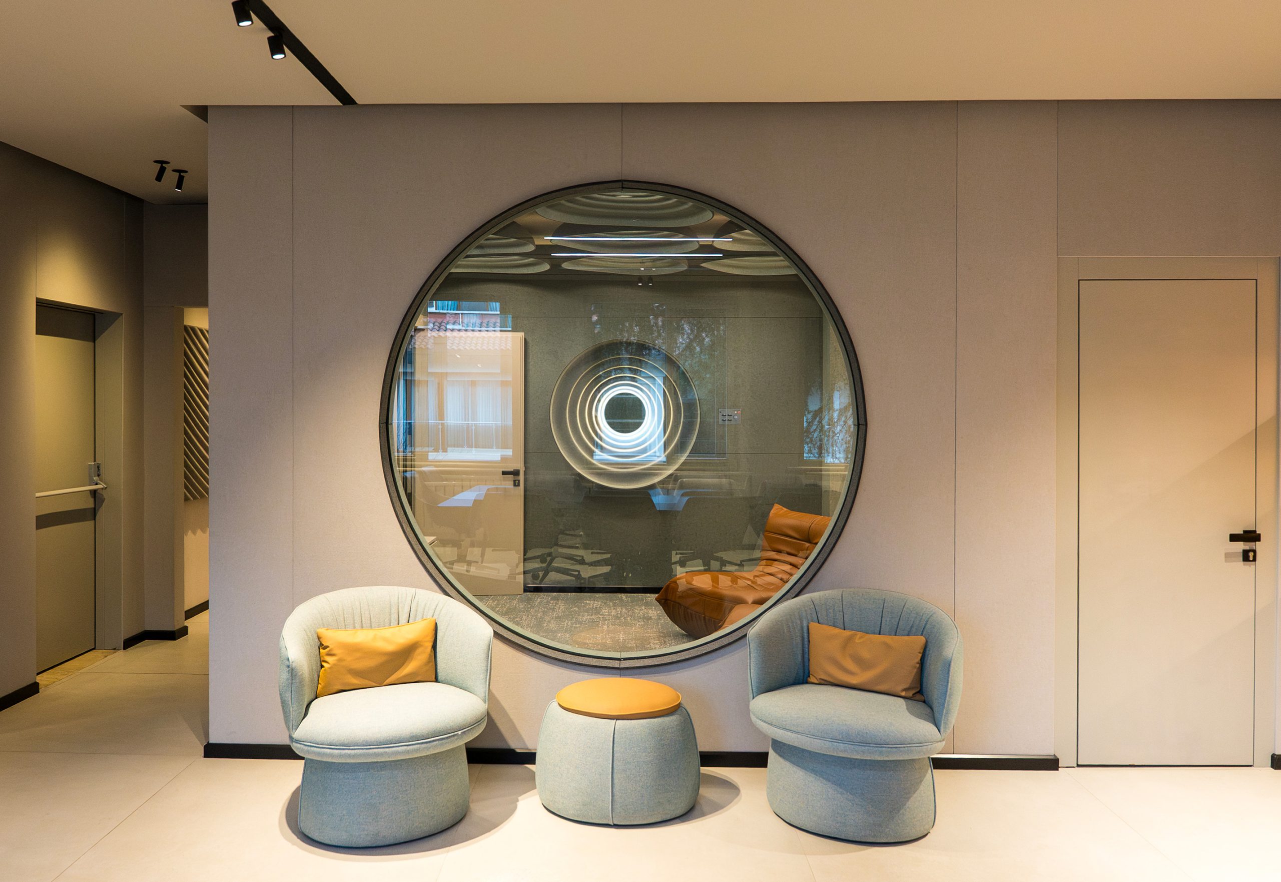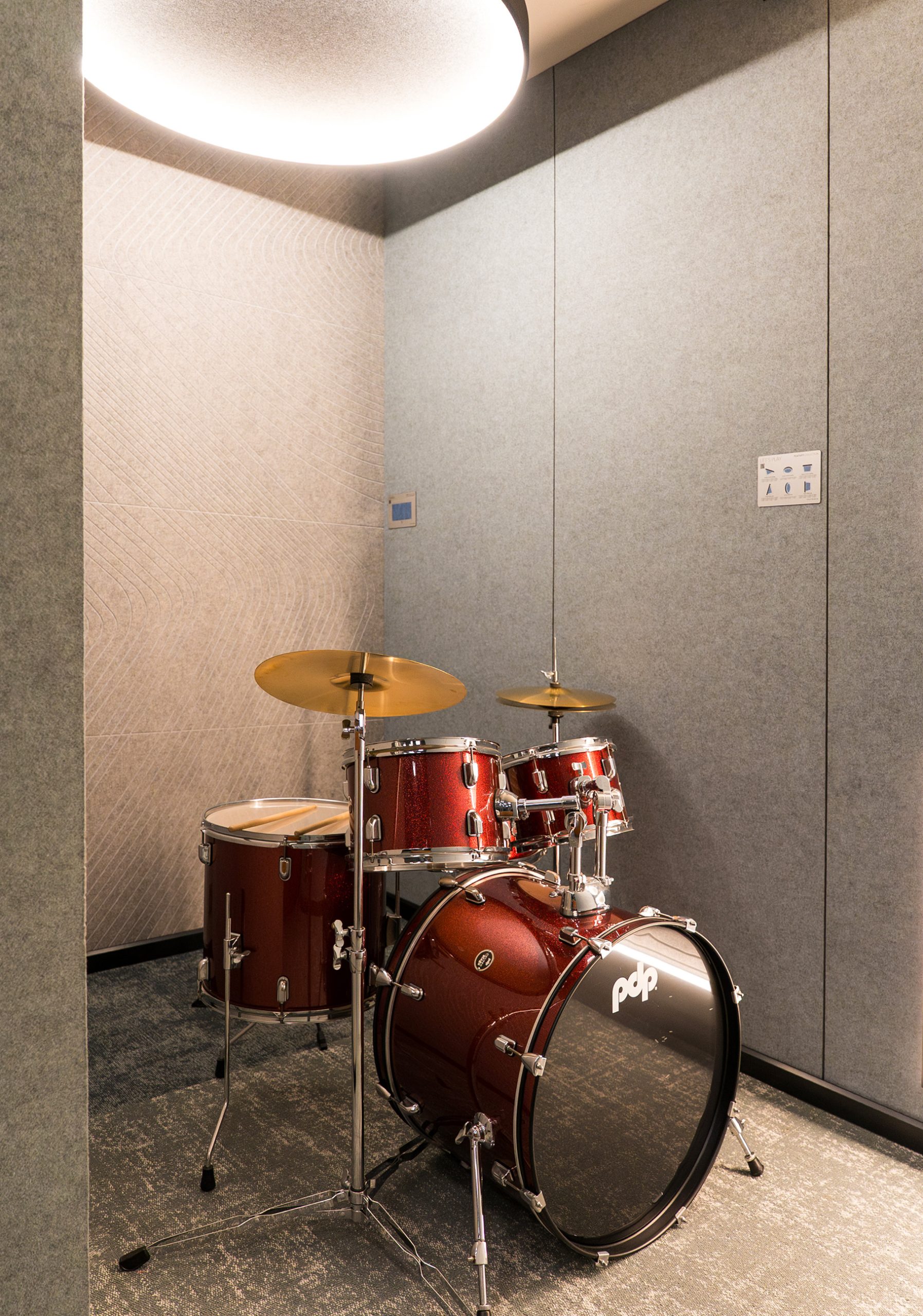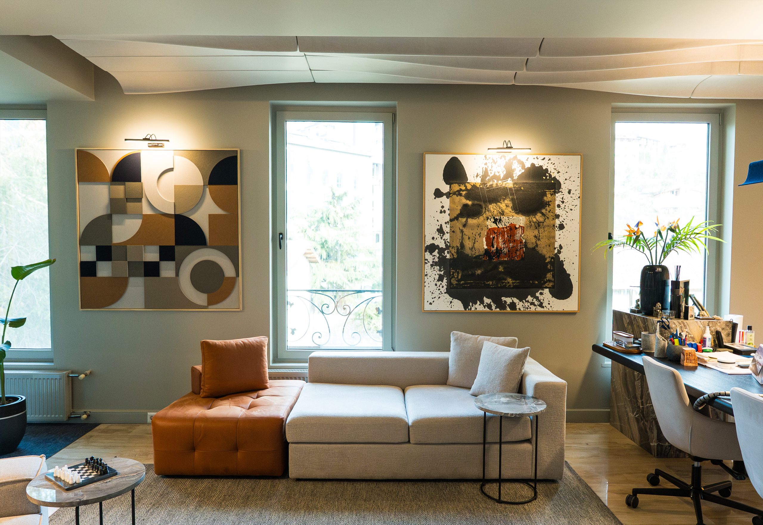 Lighting elements also play an active role in the acoustic concept. The Ra Circle Wall Lamp combines lighting with acoustic felt surfaces, enhancing both visual comfort and sound absorption while reinforcing a cohesive interior language.