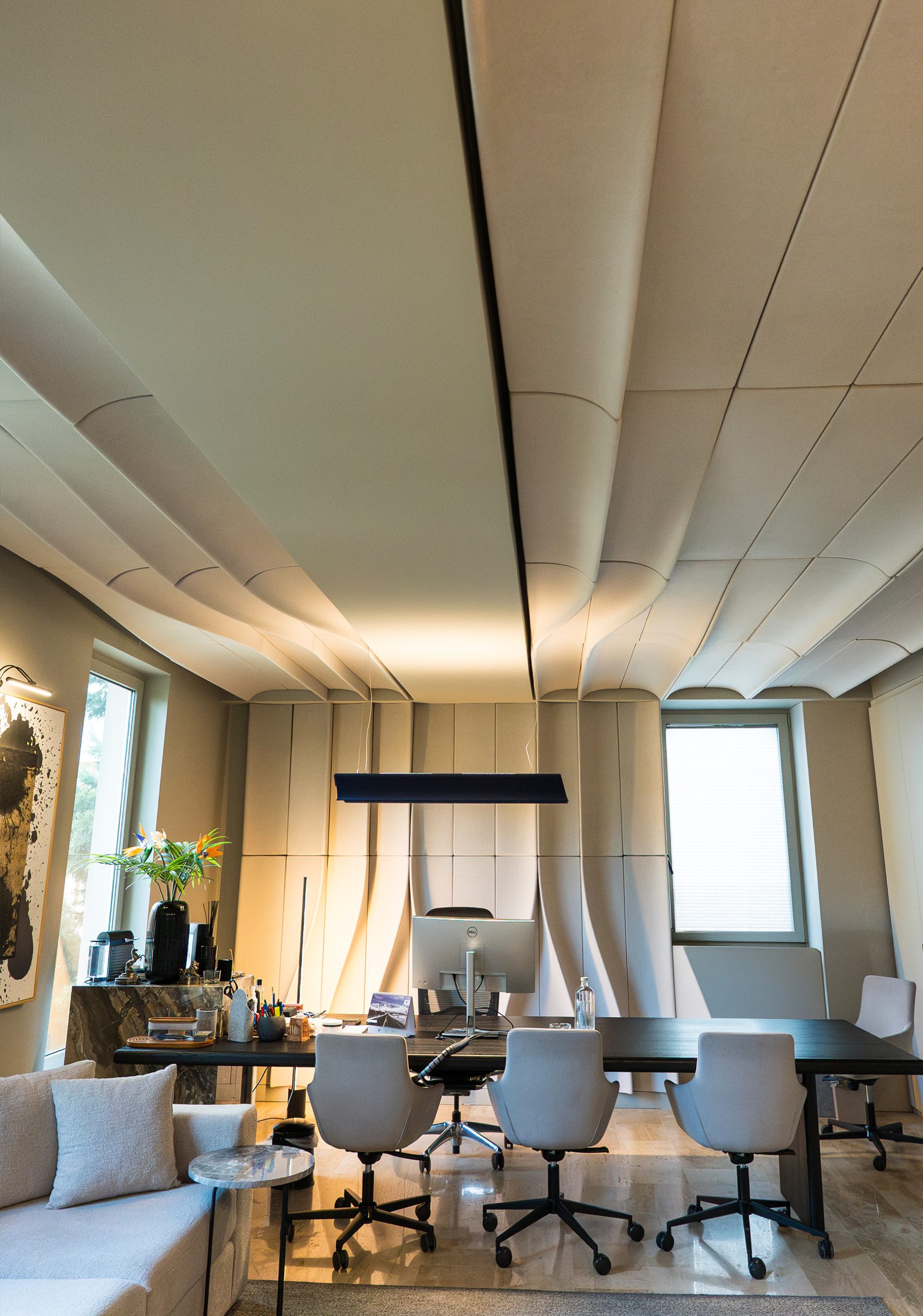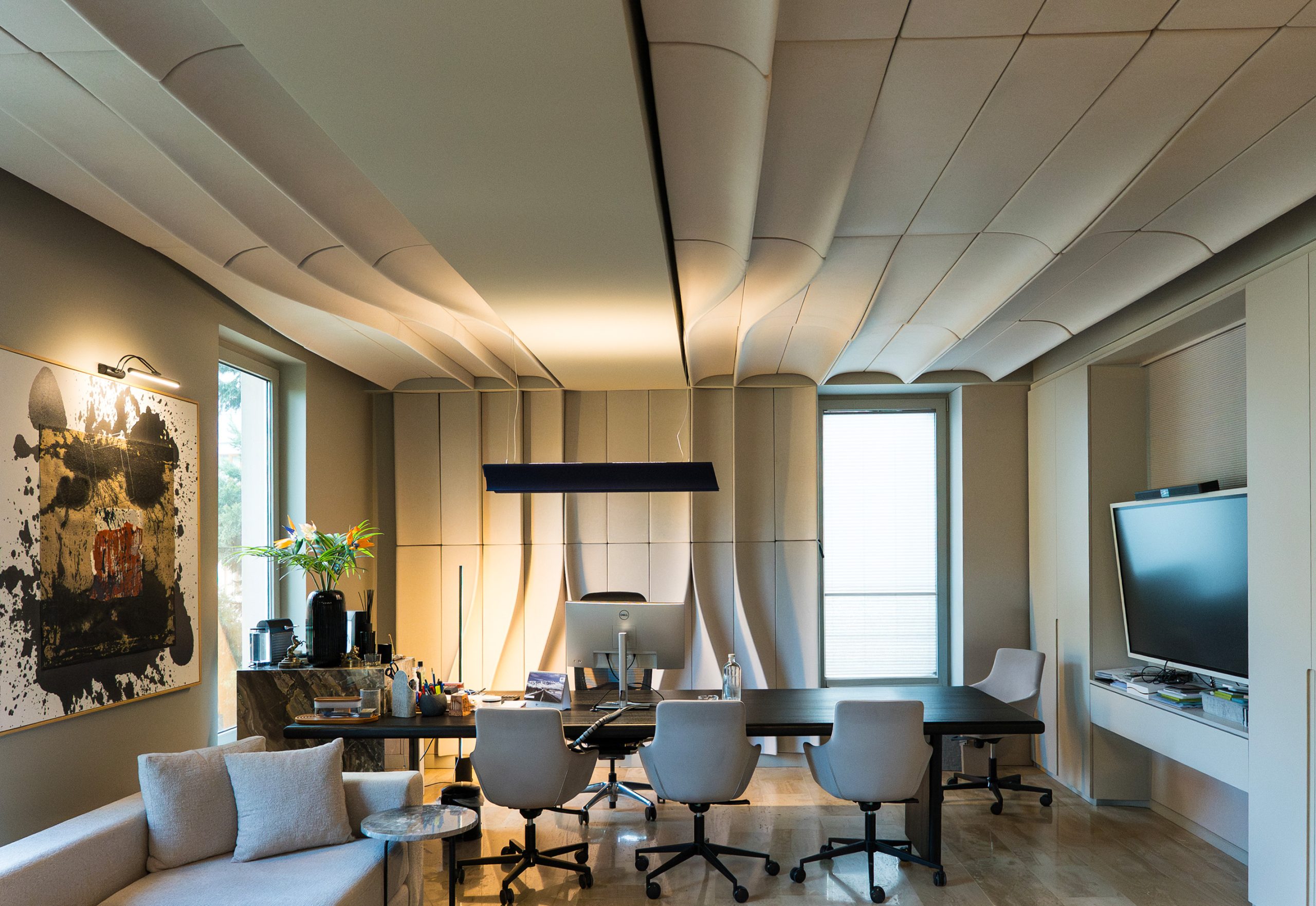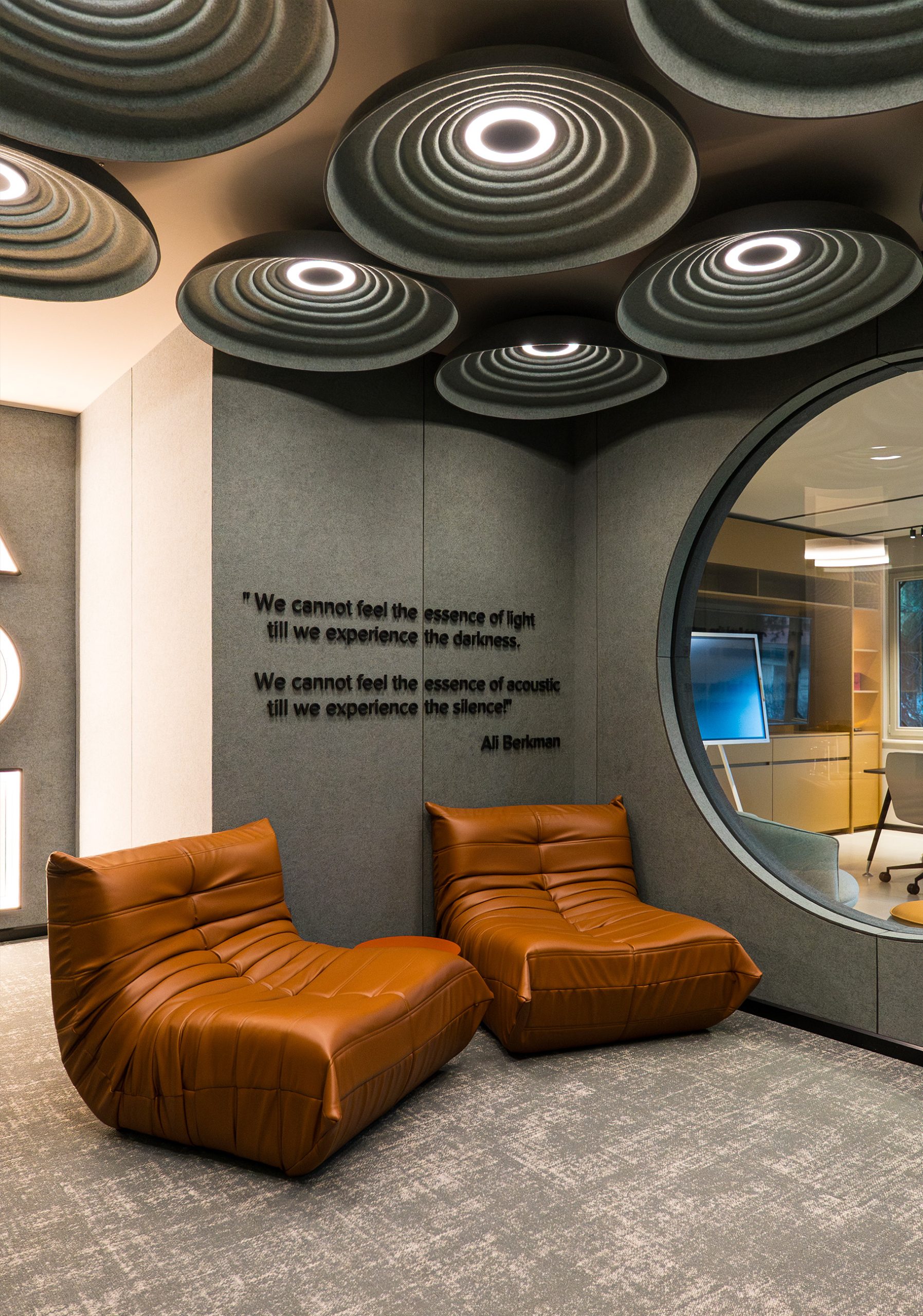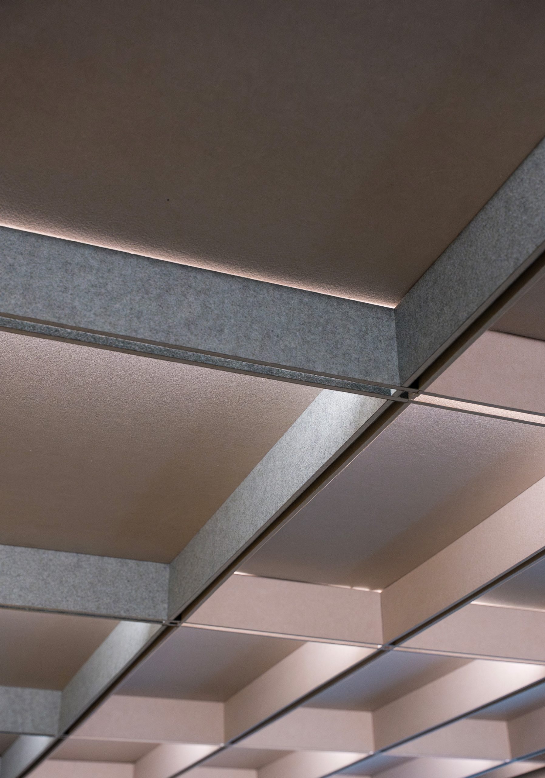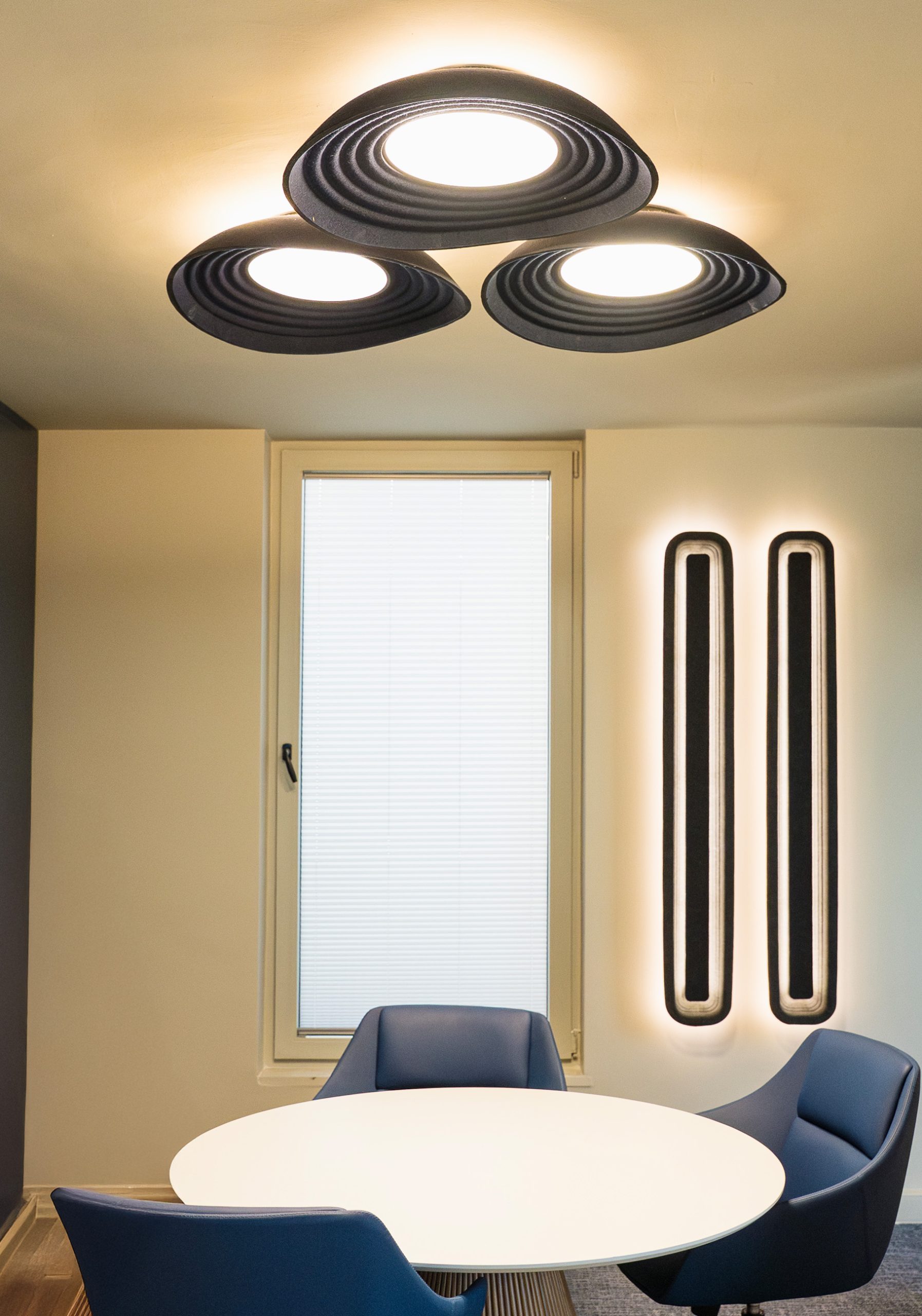 The project integrates acoustic solutions as an essential part of the spatial design. Ceiling, wall, and lighting elements are used to control sound reflections and improve overall acoustic comfort. Products such as Plate, Ripple, Line, Flux, Sparkle Line, Flow, Step, and Volta Lay-in contribute to reducing reverberation while supporting clear communication across shared and focused areas.