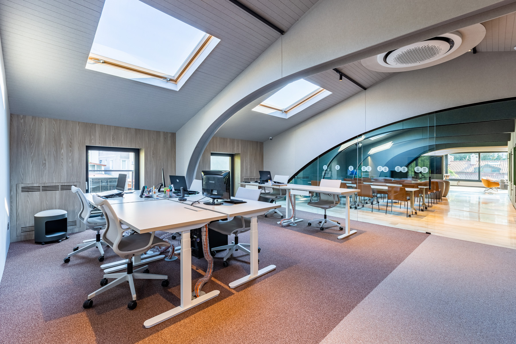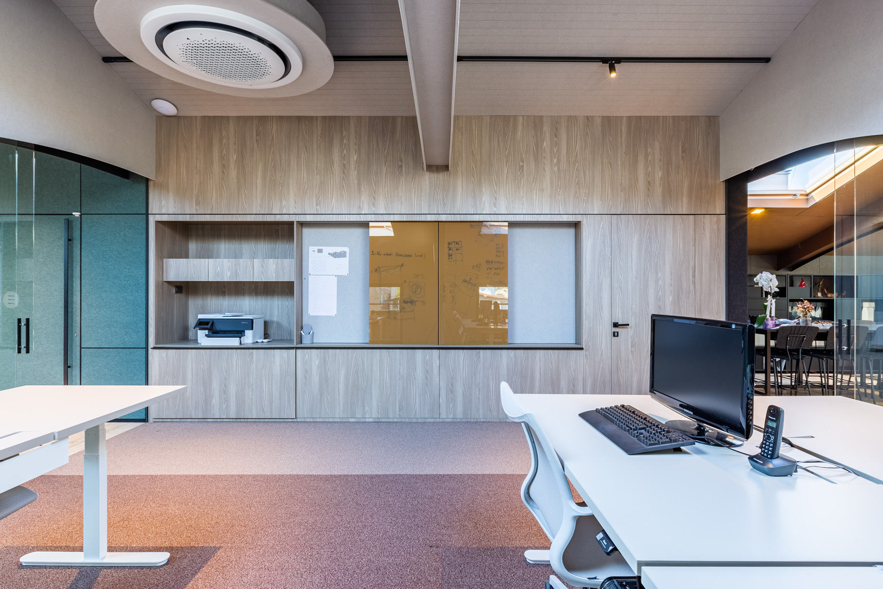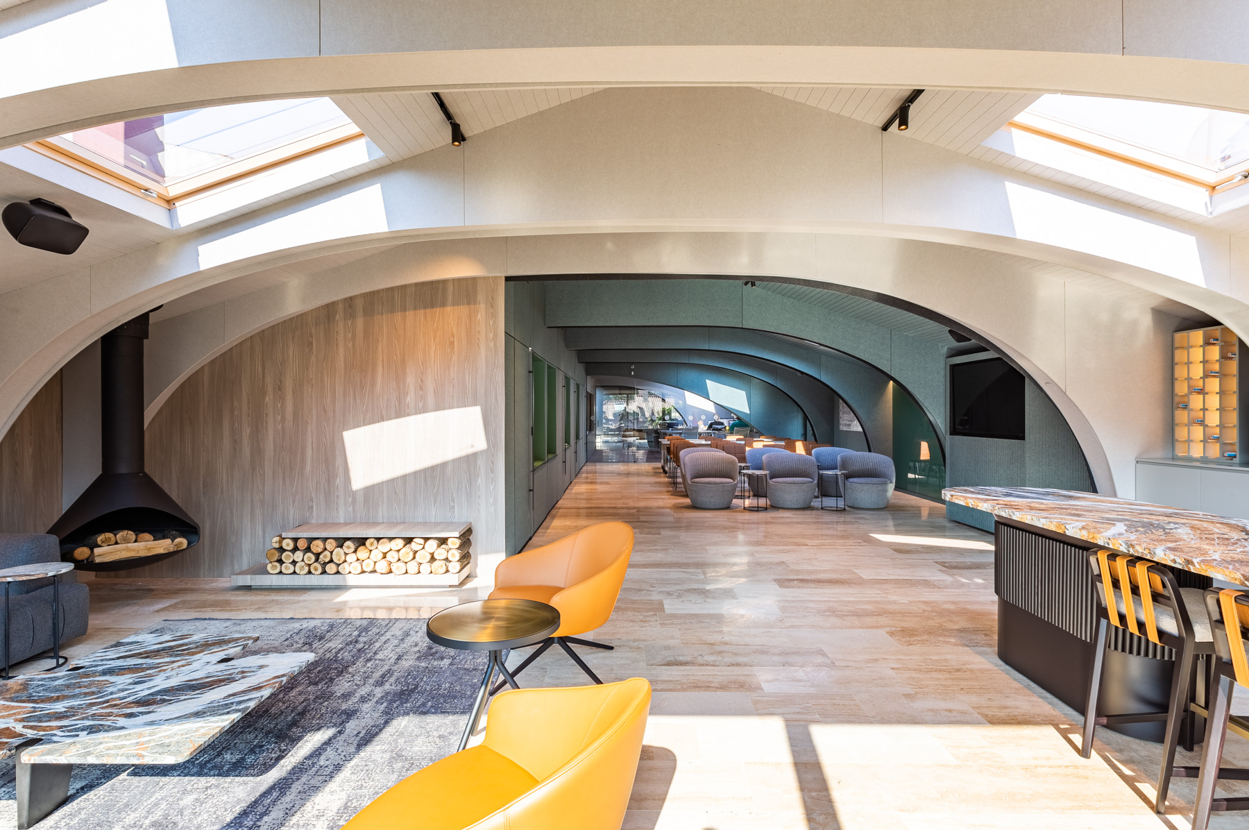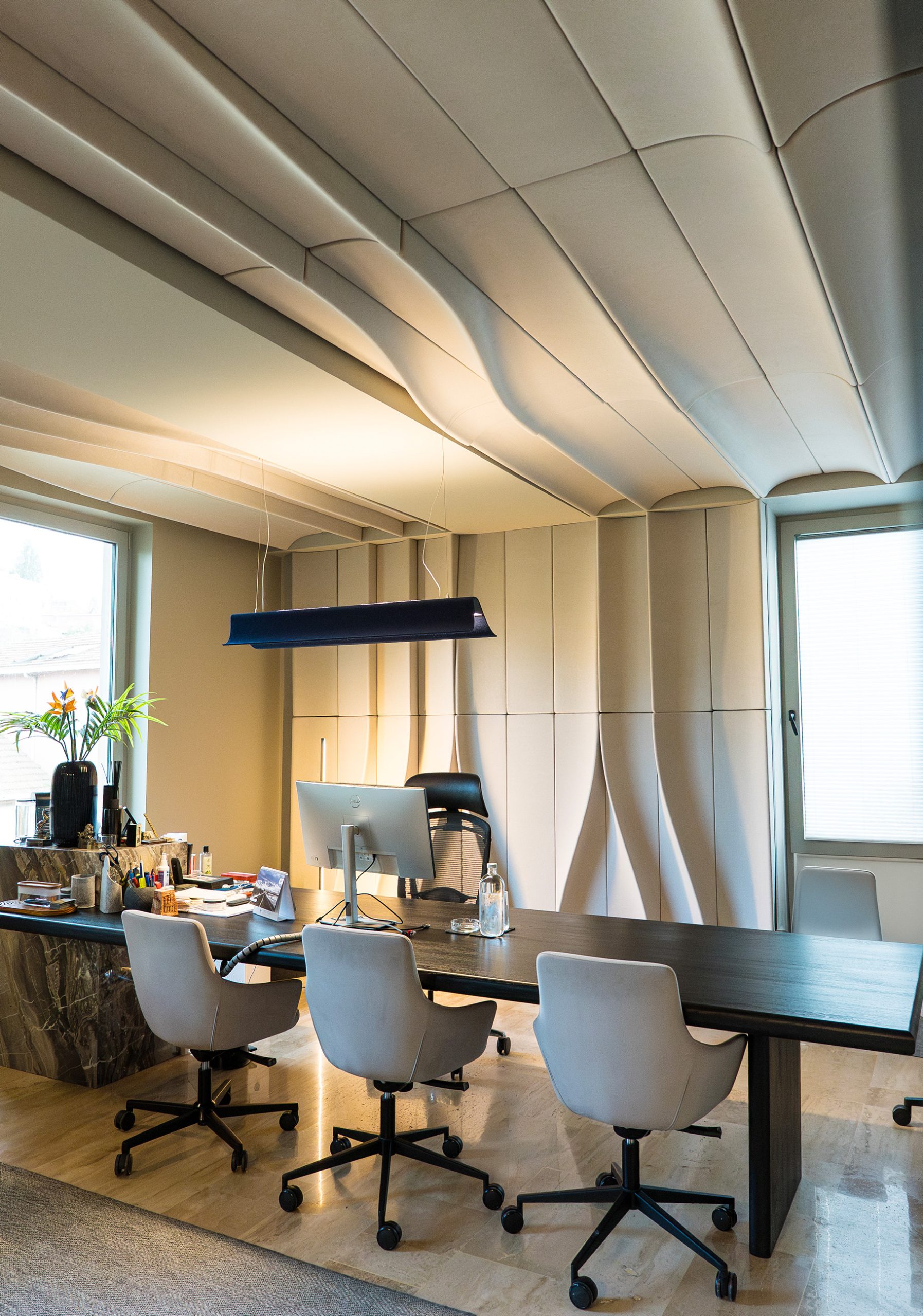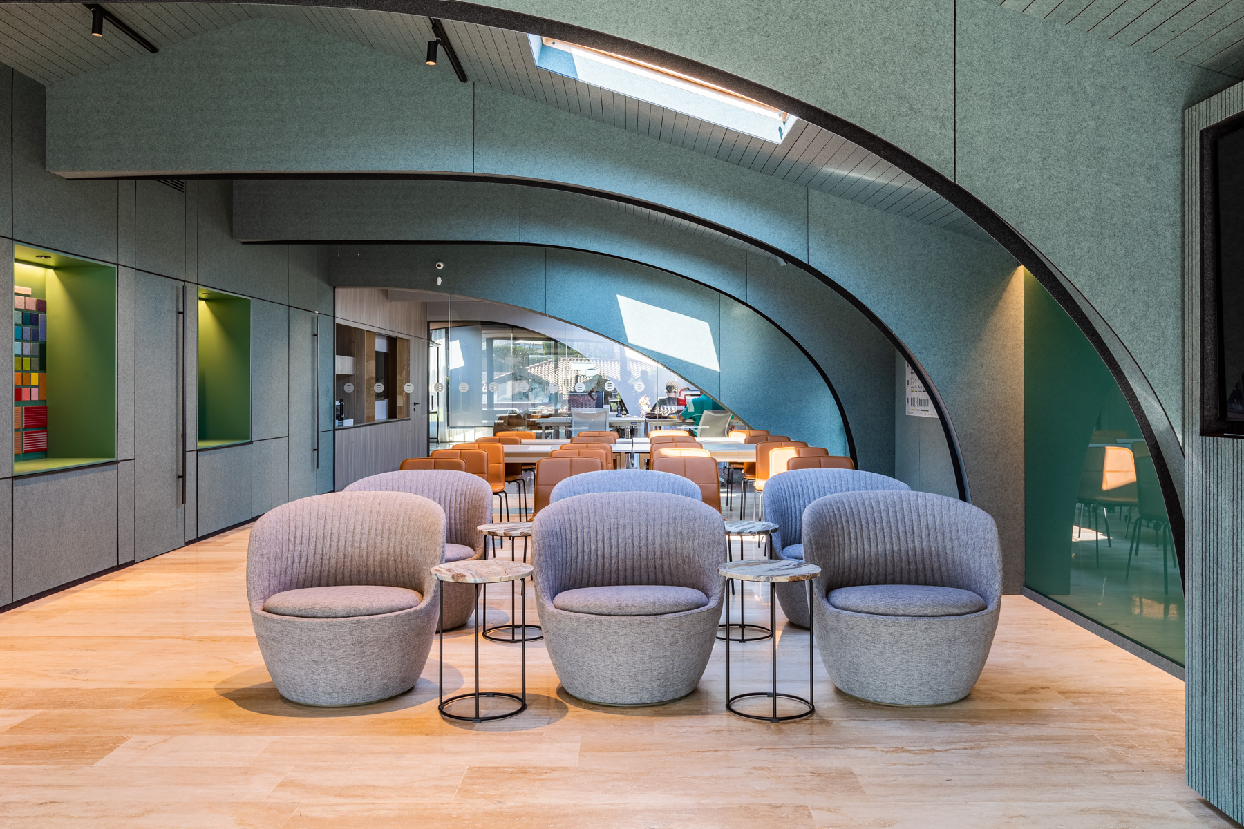 The project integrates acoustic solutions as an essential part of the spatial design. Ceiling, wall, and lighting elements are used to control sound reflections and improve overall acoustic comfort. Products such as Plate, Ripple, Line, Flux, Sparkle Line, Flow, Step, and Volta Lay-in contribute to reducing reverberation while supporting clear communication across shared and focused areas.