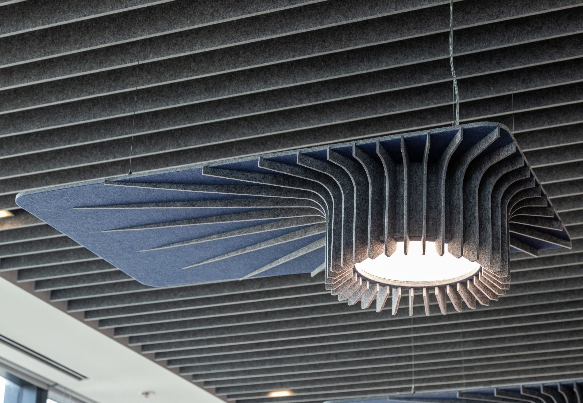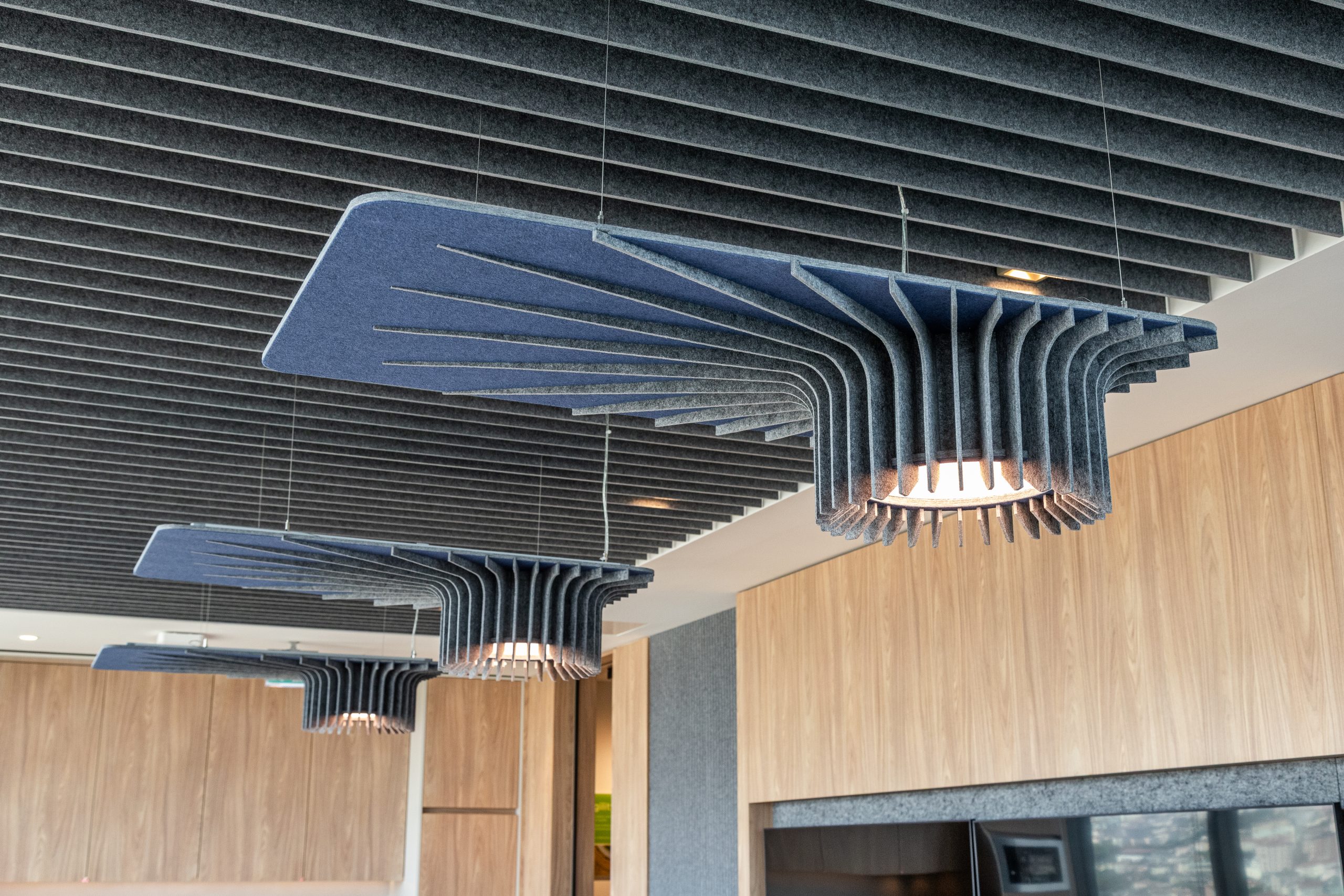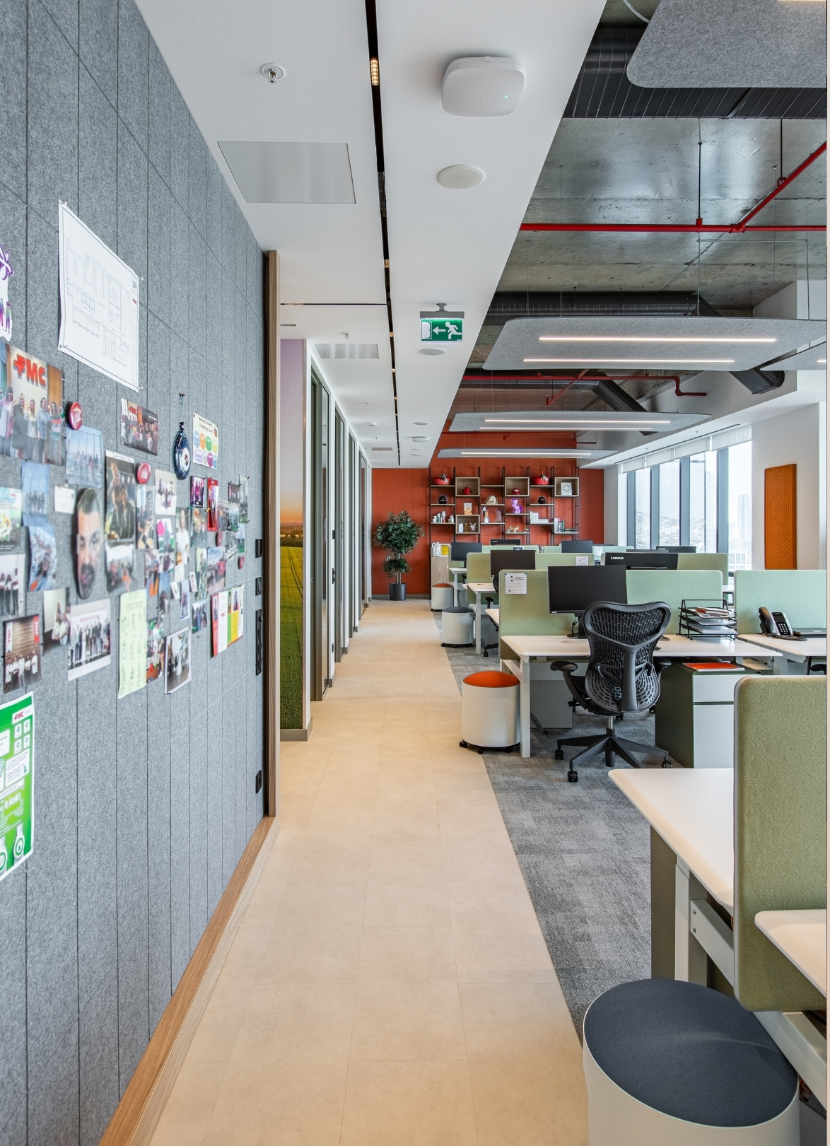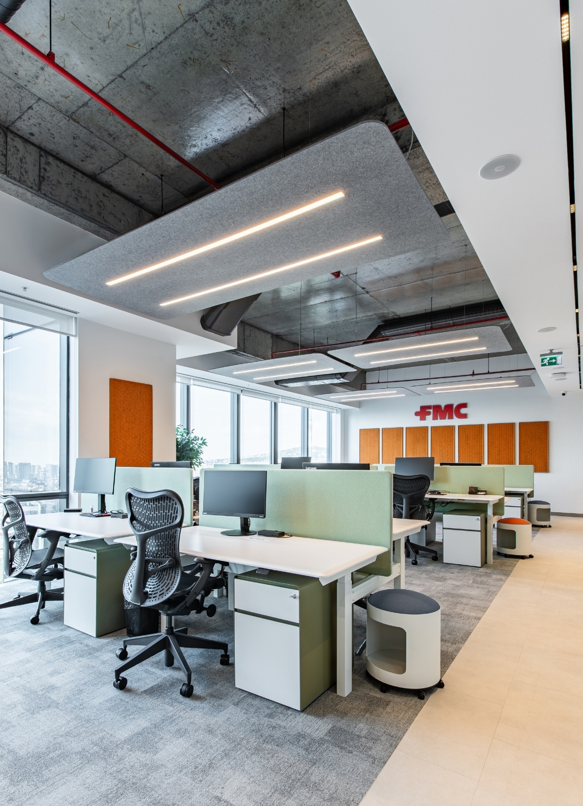 Feltouch provided customized acoustic solutions for the FMC Office project, designed by Goconcept, combining aesthetics and functionality in harmony. The project reflects Feltouch’s approach to innovation and design excellence through the seamless integration of acoustic performance and visual expression. It features Flat Cloud Lighting, Ra Task Lighting, Batura, Honeycomb, and Line claddings applied across walls, ceilings, and lighting elements to ensure optimal acoustic balance and visual harmony.