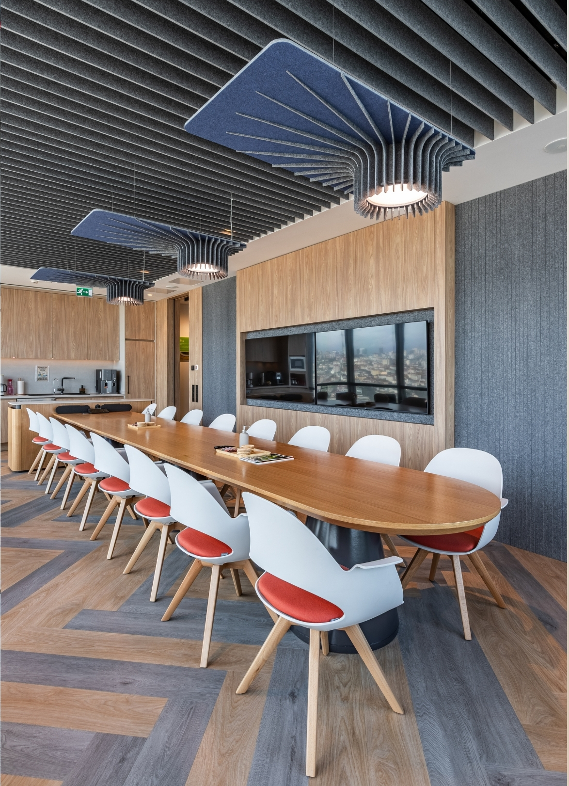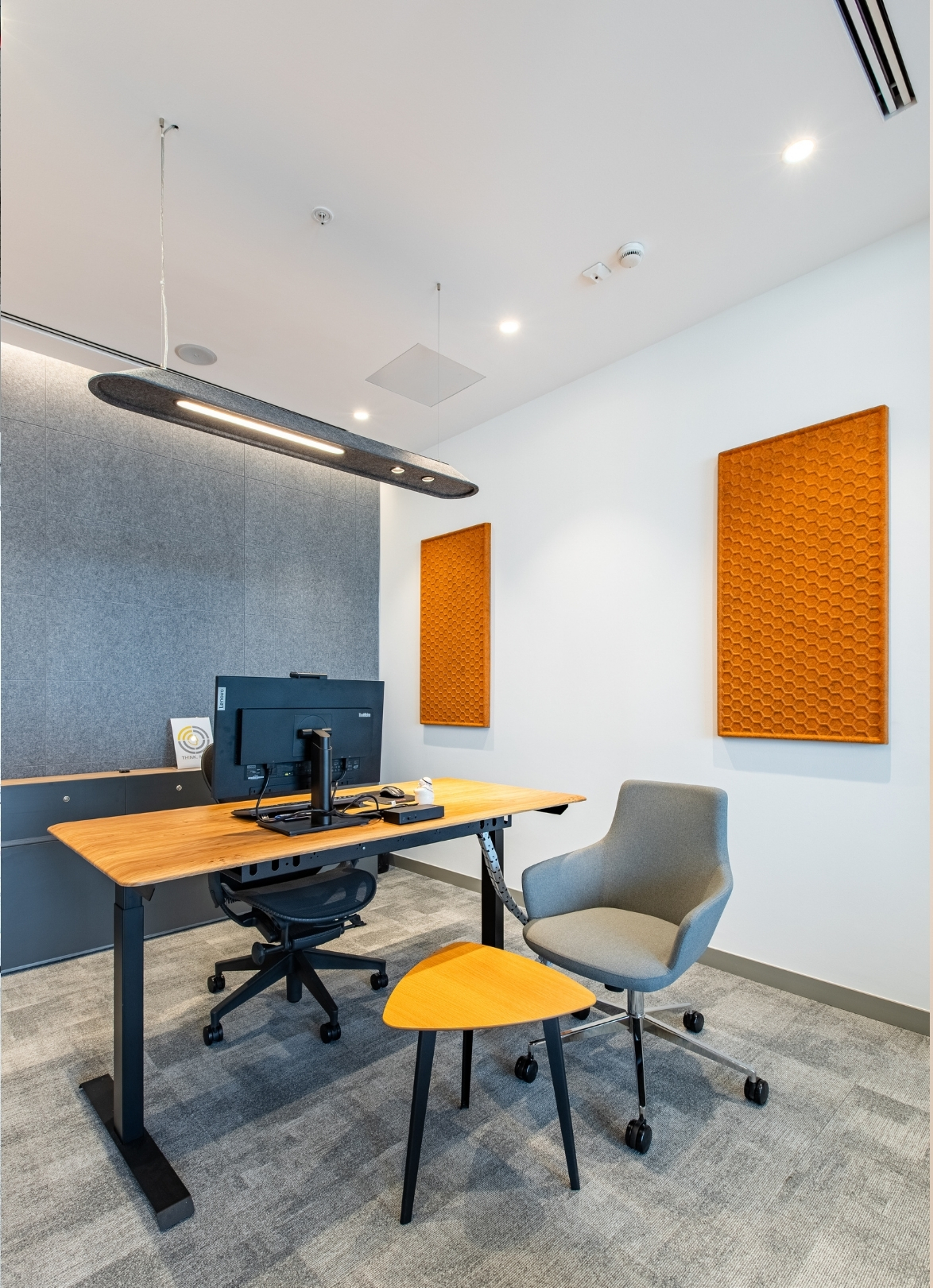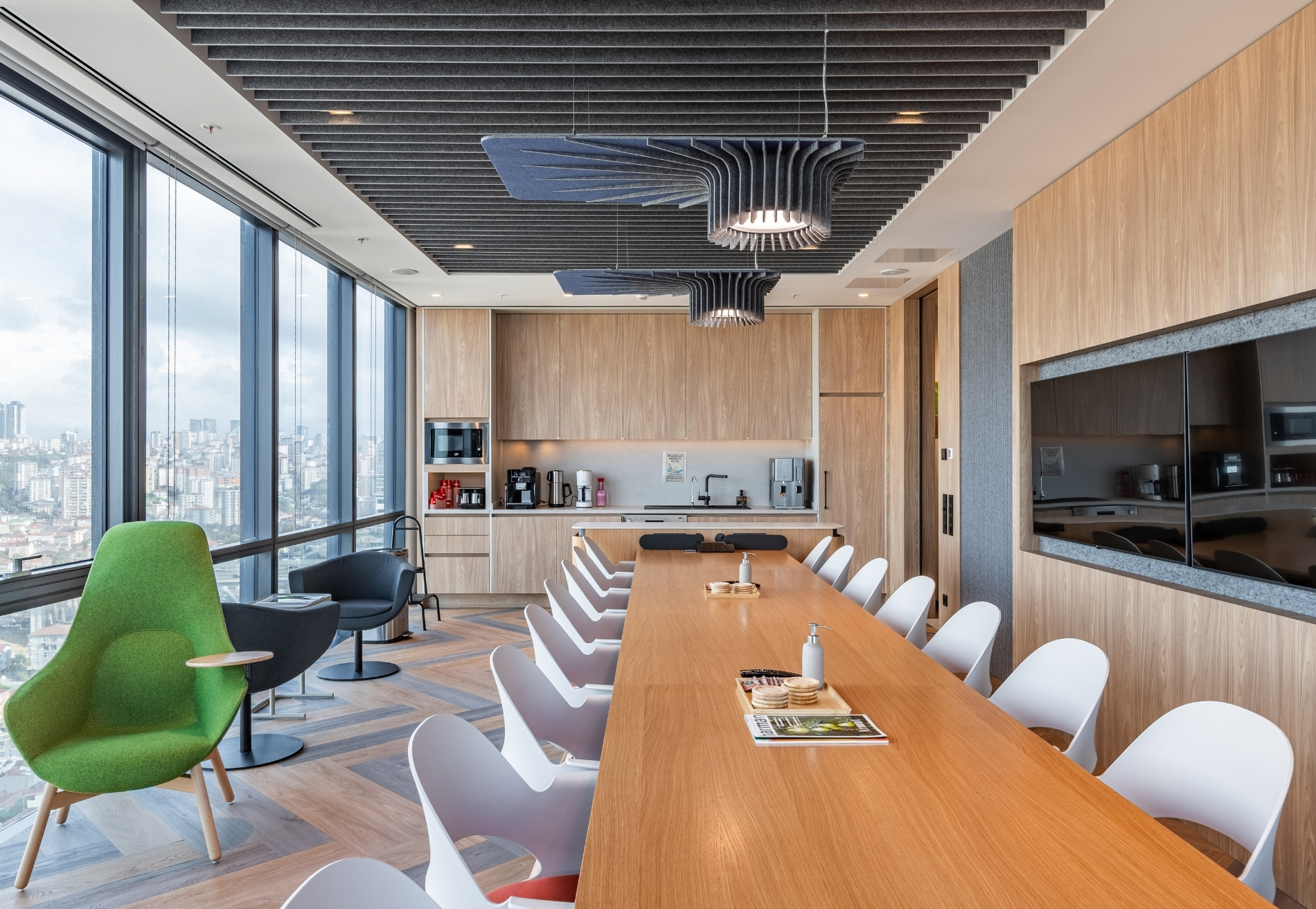 Feltouch provided customized acoustic solutions for the FMC Office project, designed by Goconcept, combining aesthetics and functionality in harmony. The project reflects Feltouch’s approach to innovation and design excellence through the seamless integration of acoustic performance and visual expression. It features Flat Cloud Lighting, Ra Task Lighting, Batura, Honeycomb, and Line claddings applied across walls, ceilings, and lighting elements to ensure optimal acoustic balance and visual harmony.