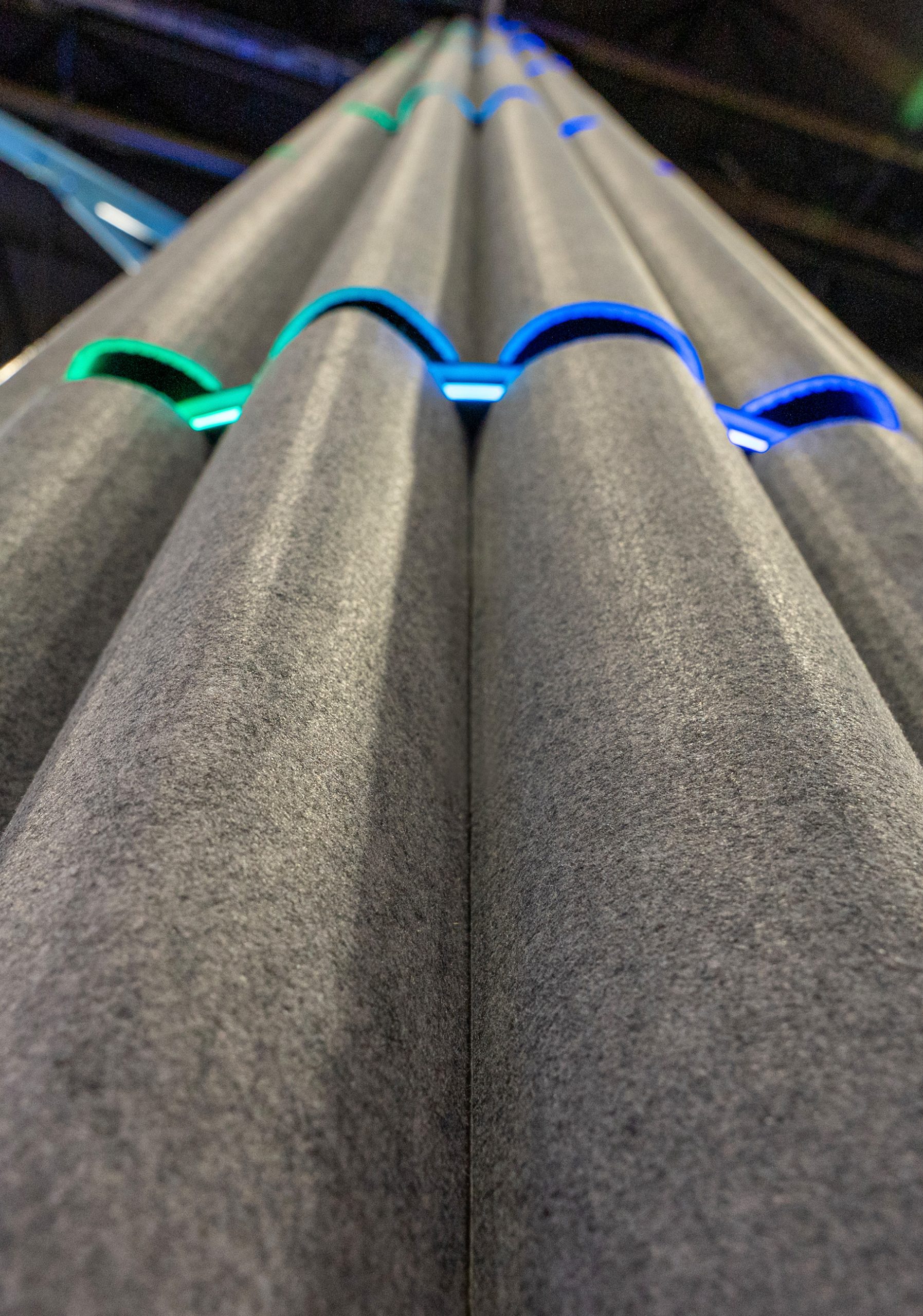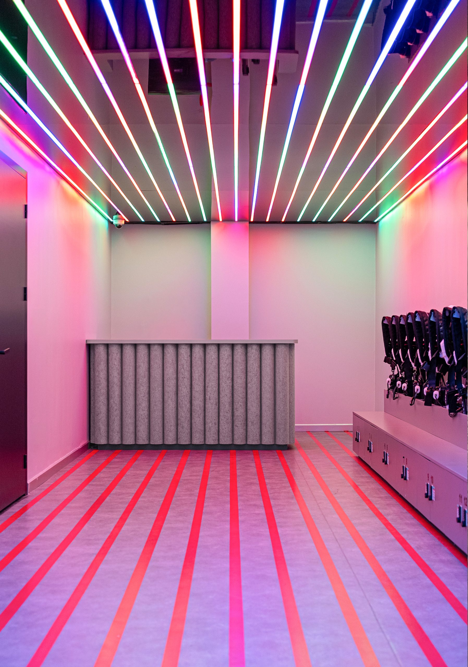 In the gaming rooms, Cracker panels cover the walls. They help control sound and reduce noise in enclosed, high-activity areas. At the same time, Flat Cloud elements hang from the ceiling and regulate reverberation from above.