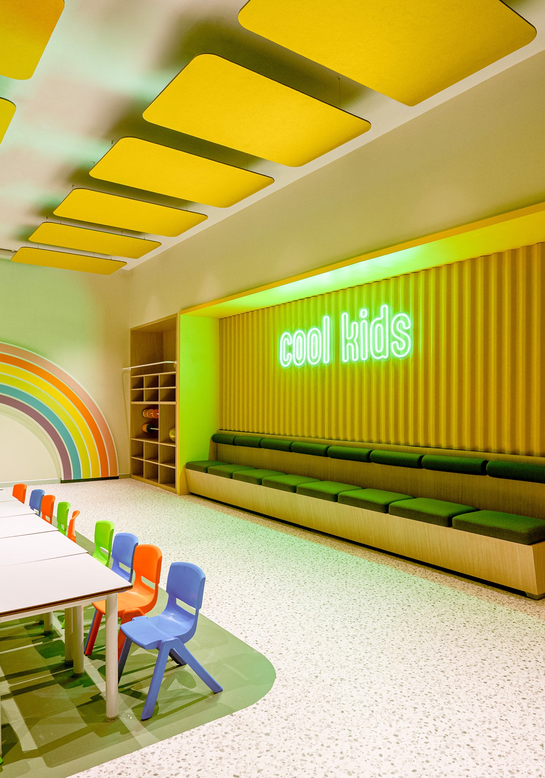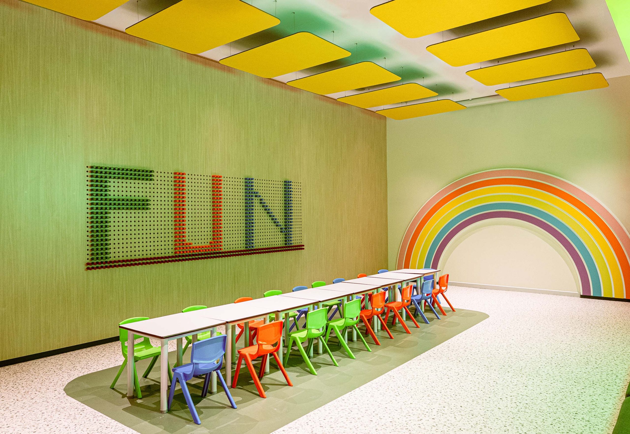 As an entertainment space, it requires strong acoustic control. Multiple activities happen at the same time, so sound levels quickly increase. In addition, the space features high ceilings, which allow sound to travel and reverberate more easily. Therefore, the design must control reverberation and prevent sound overlap between zones.