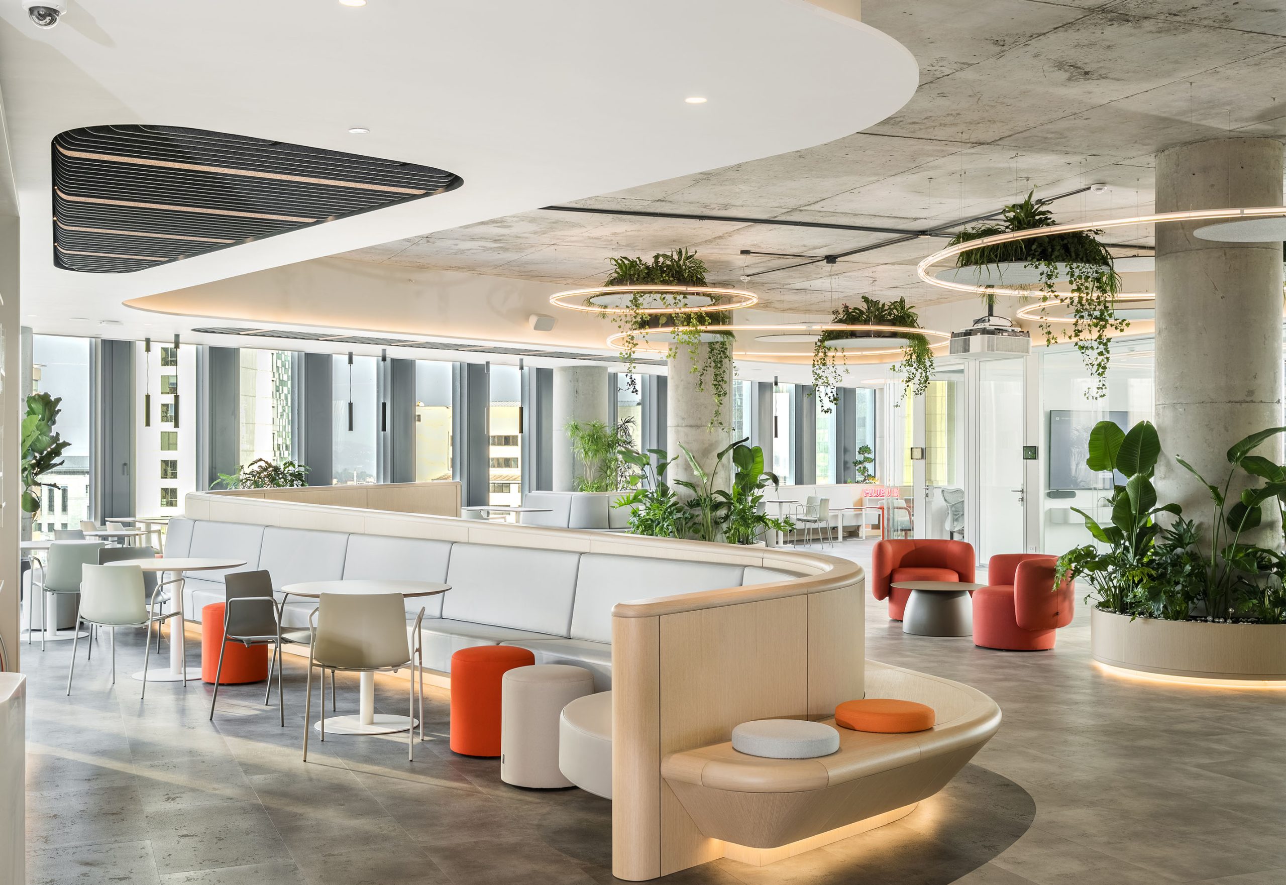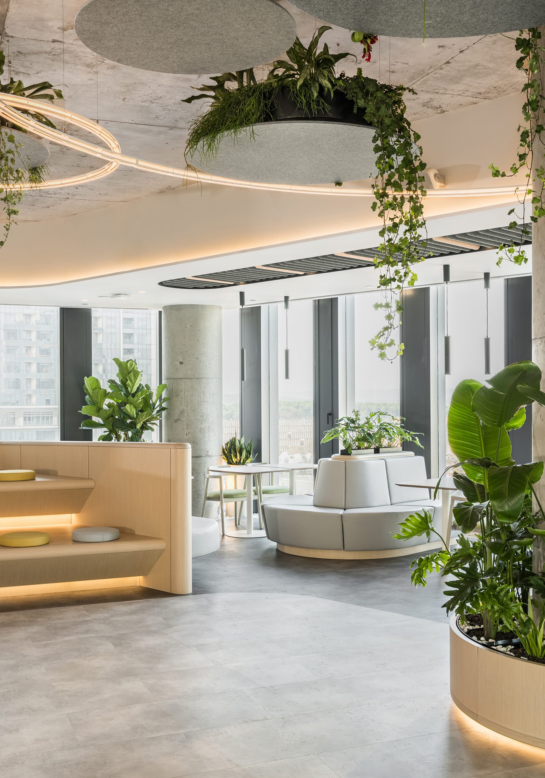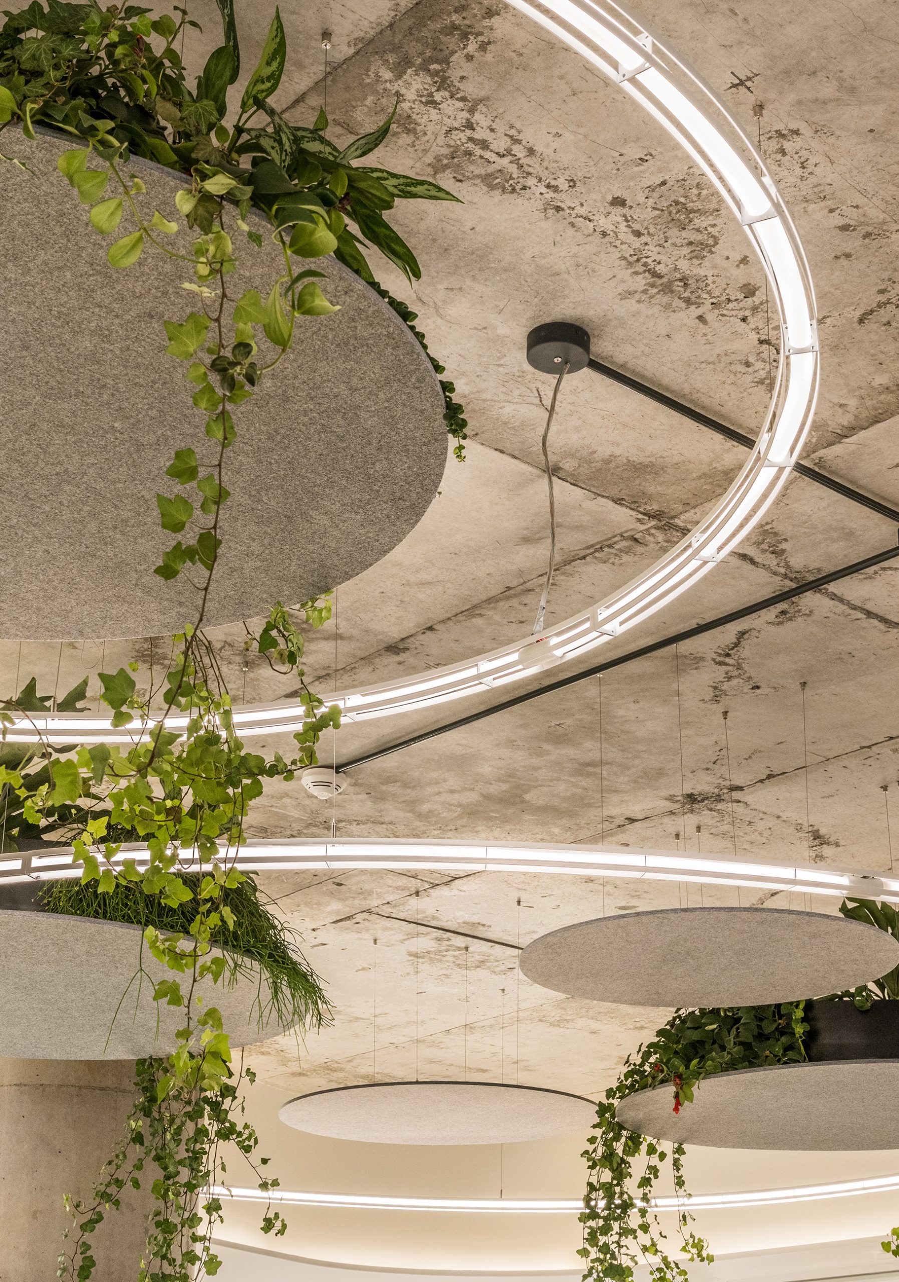 To achieve balanced acoustic performance, the project team applied a combination of ceiling-based acoustic systems. Straight Baffle elements absorb sound and help control noise levels in open office areas. They improve speech intelligibility while reducing echo. In selected zones, Circles Flat Cloud and Cracker wall panels enhance sound absorption . These elements help break sound reflections in large volumes and create a calmer acoustic atmosphere without closing the space.