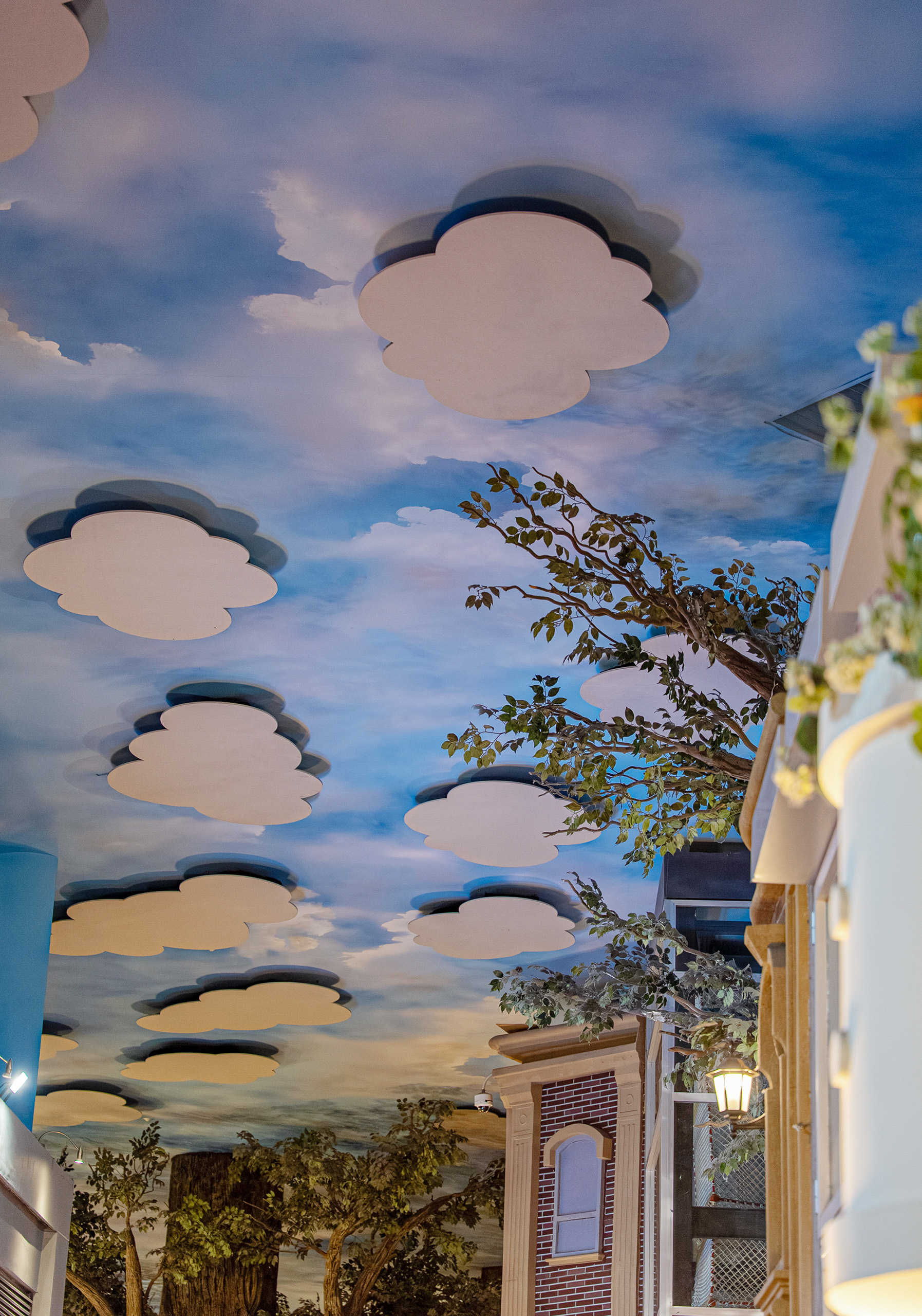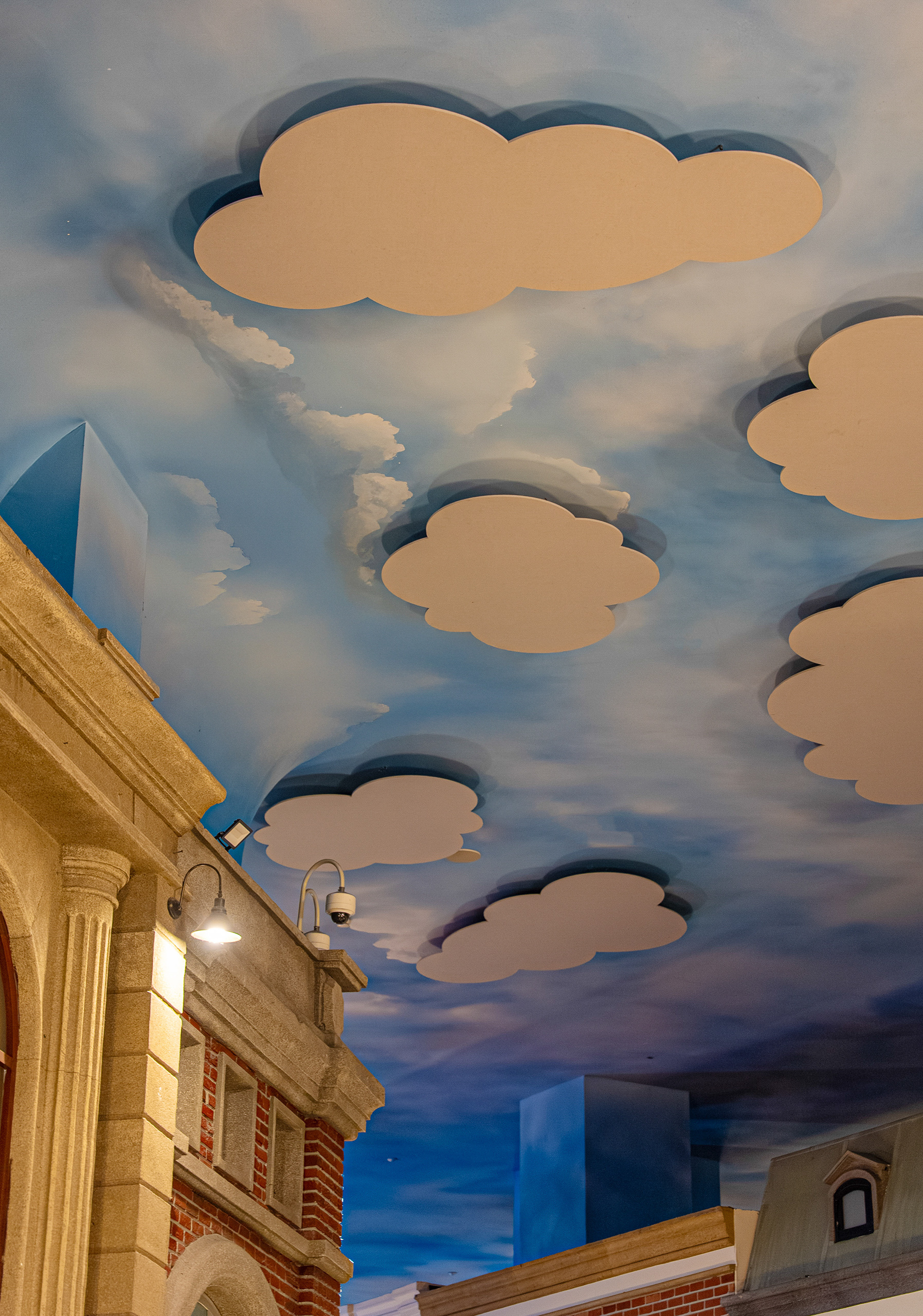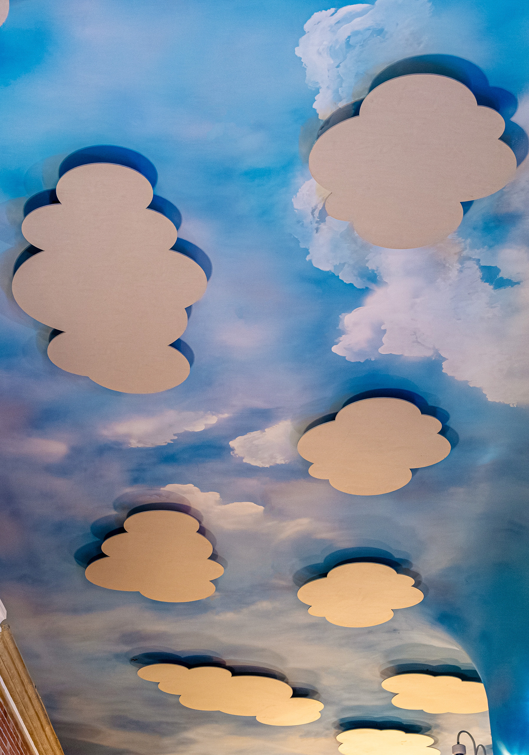 Feltouch installs Flat Cloud panels in cloud shapes that match the playful design concept. These suspended panels absorb sound from above and help control noise throughout the space. As a result, the interior feels more balanced and acoustically stable.