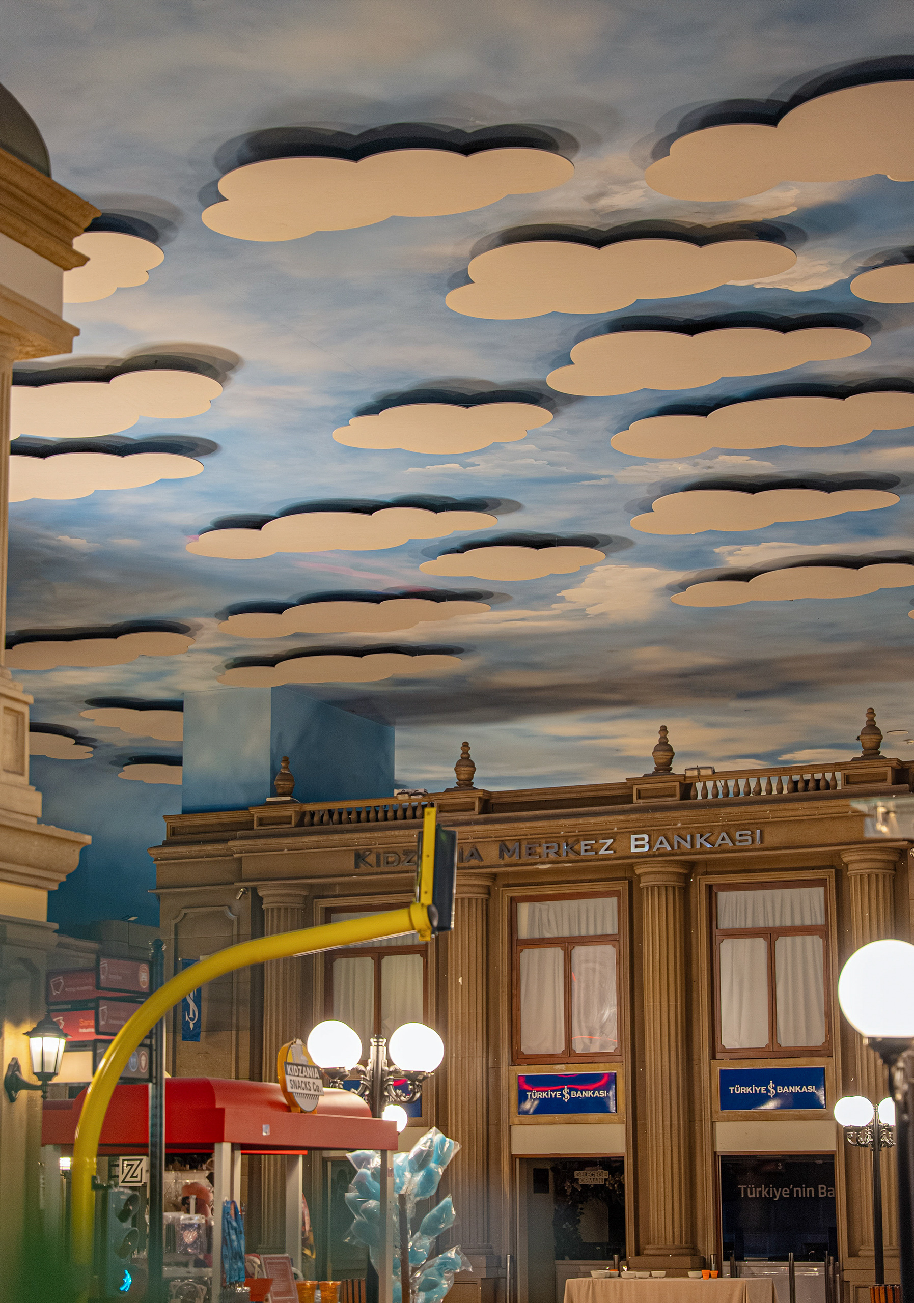 The KidZania project features very high ceilings and active zones. Constant movement and high noise levels increase the need for strong acoustic control. Therefore, the ceiling system plays a key role in maintaining comfort and clear communication.