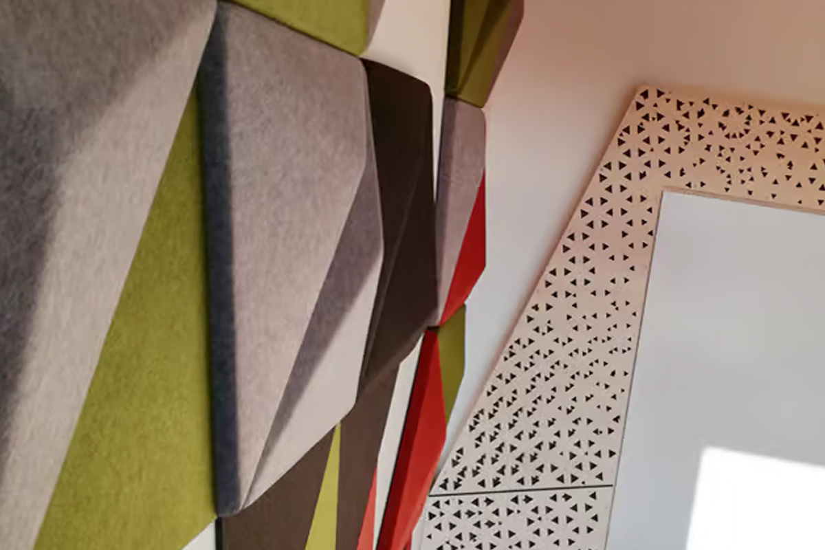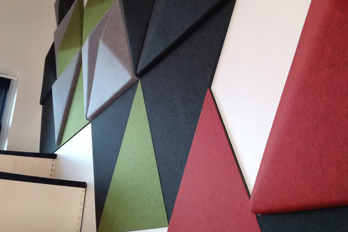 The acoustic strategy focuses on controlling reverberation while creating a strong visual identity. Rhino Triangle panels are applied as wall panels, forming a dynamic geometric surface that absorbs sound reflections. Plate panels are used alongside Rhino Triangle, with custom triangular cuts that align with the geometry of the design and ensure visual continuity.