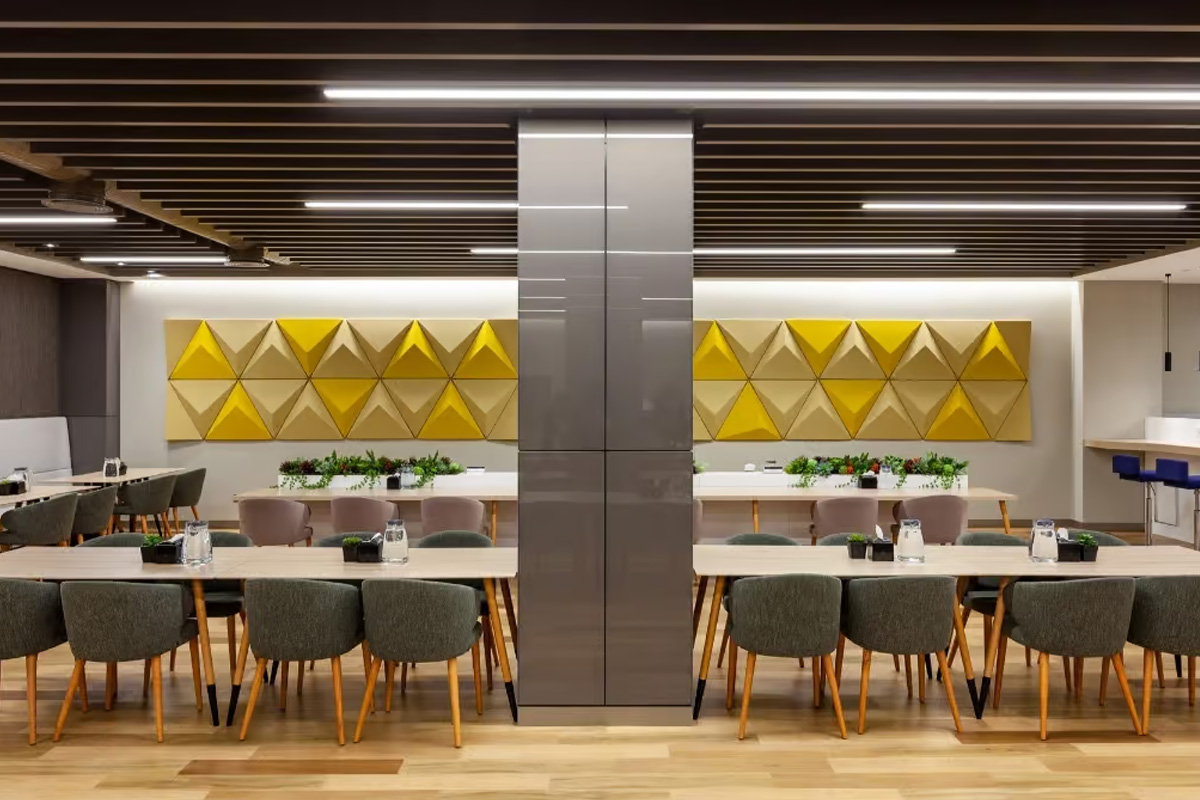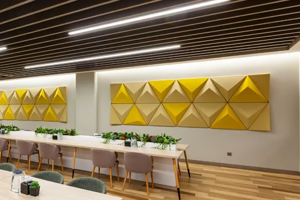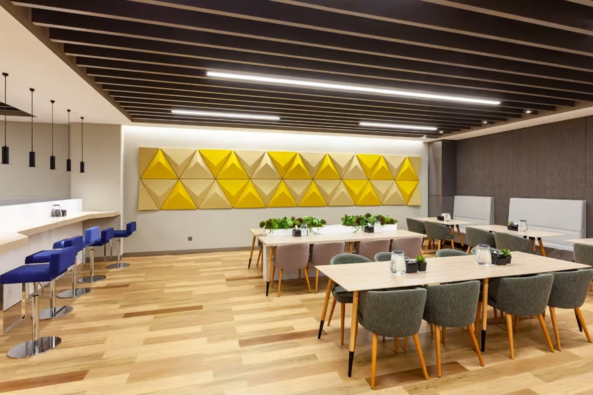 The acoustic strategy focuses on controlling reverberation while maintaining a strong visual identity. Rhino Triangle panels are applied as wall panels across the restaurant area, absorbing sound reflections and reducing background noise. These geometric panels not only support acoustic performance but also add a distinctive visual character to the space.