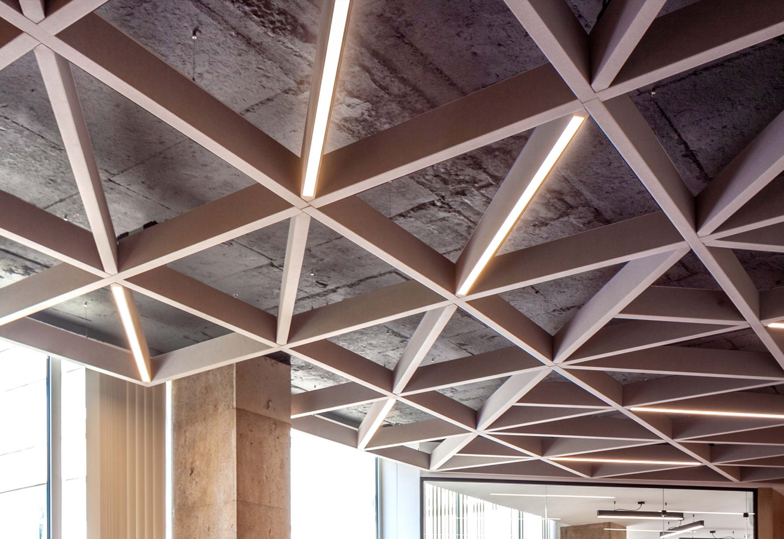 To achieve this goal, the project team applied custom acoustic ceiling elements with integrated lighting. Feltouch selected Custom Air Grid systems because they combine sound absorption and lighting in a single ceiling solution. This approach helps control reverberation while maintaining a clean and organized ceiling design.