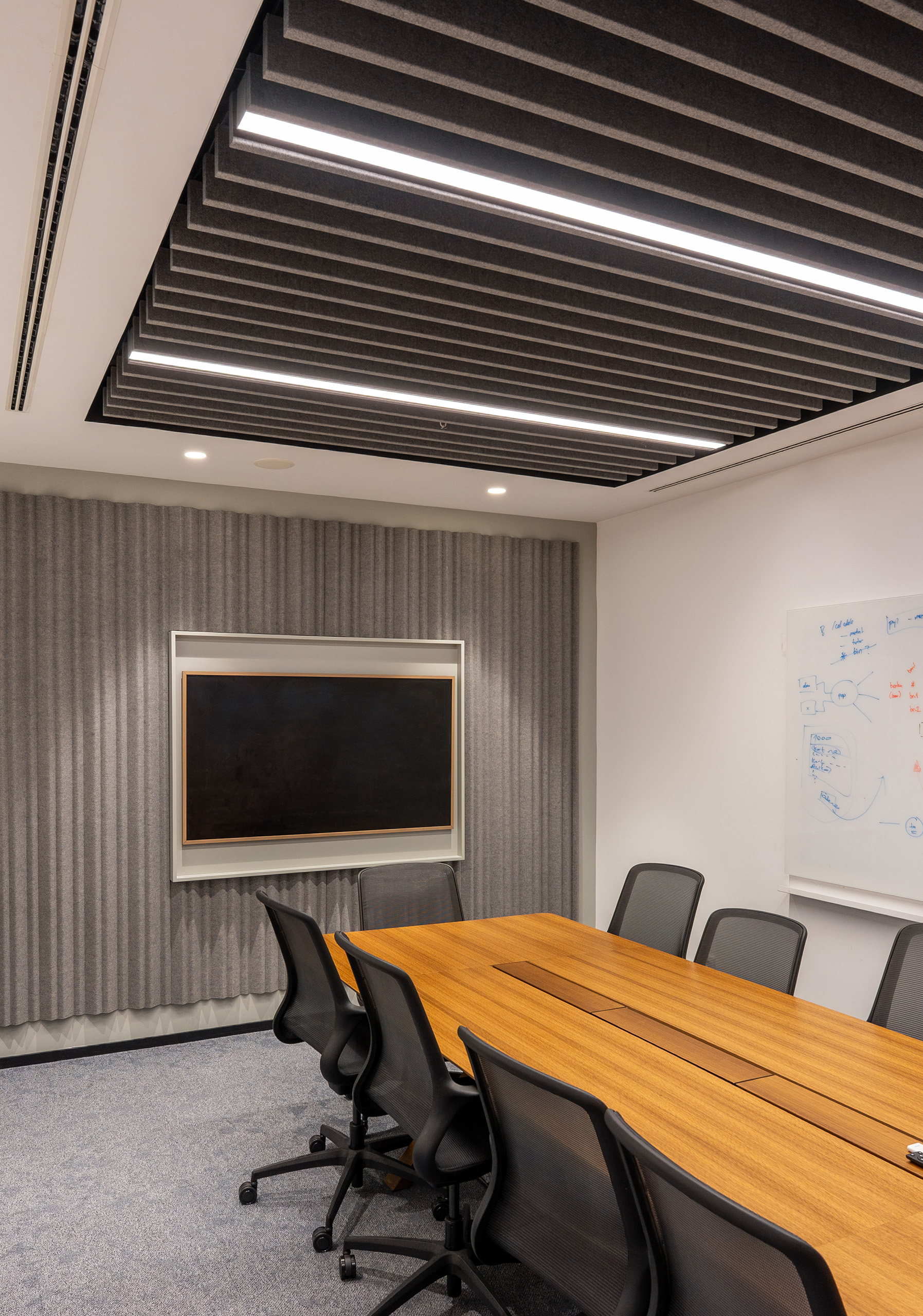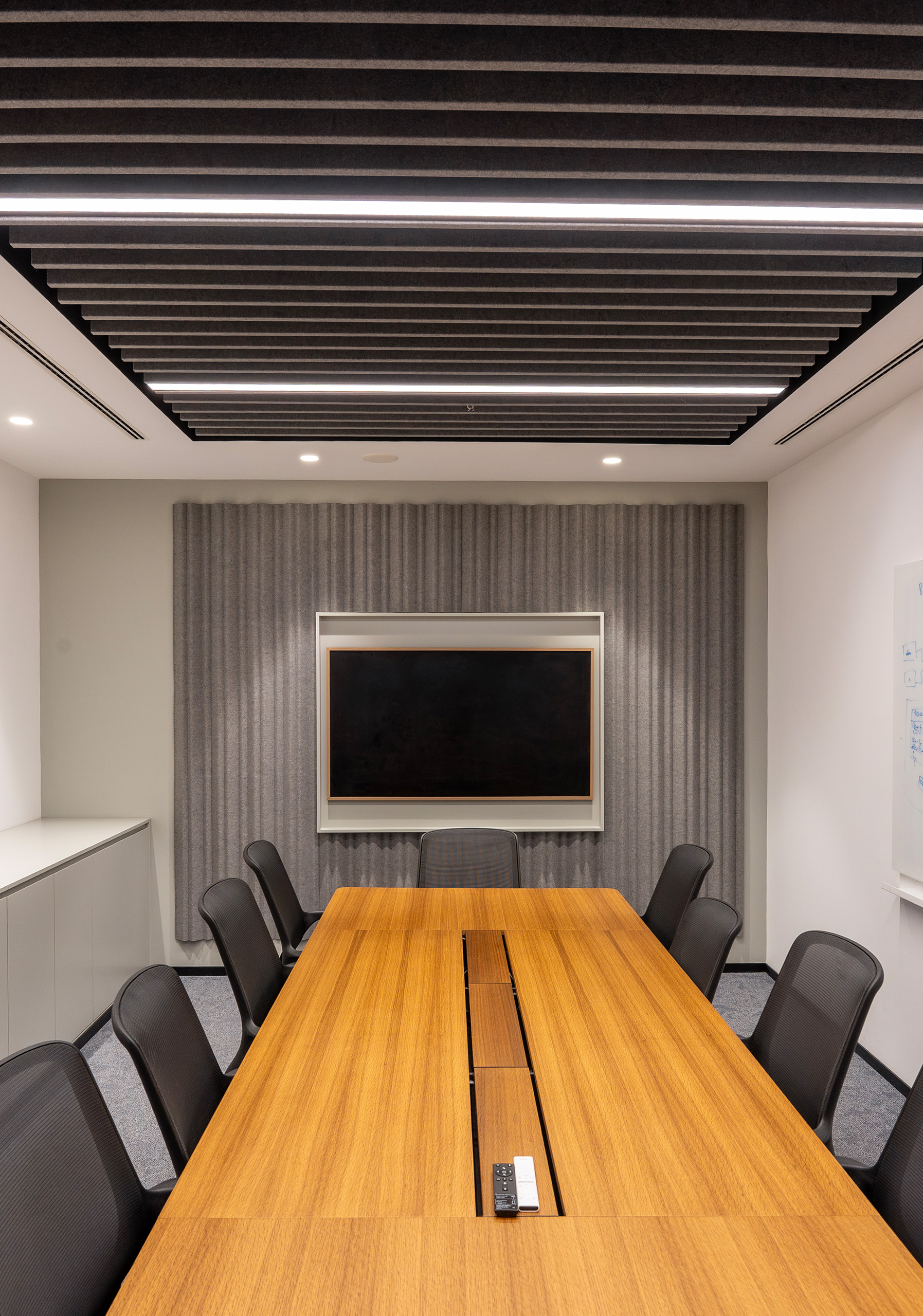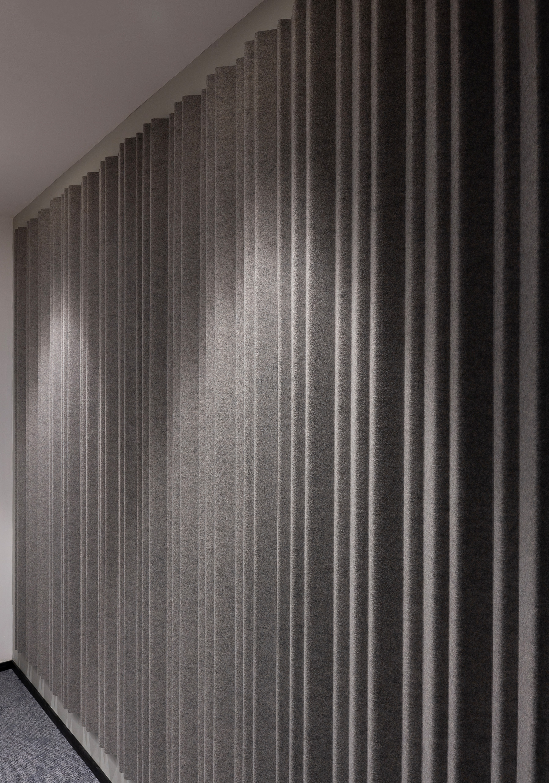 In addition, Air Felt Baffle and Flat Cloud panels are applied on the ceiling in selected areas. These ceiling-mounted panels reduce reverberation time in large and high volumes. At the same time, they preserve spatial rhythm and balance.