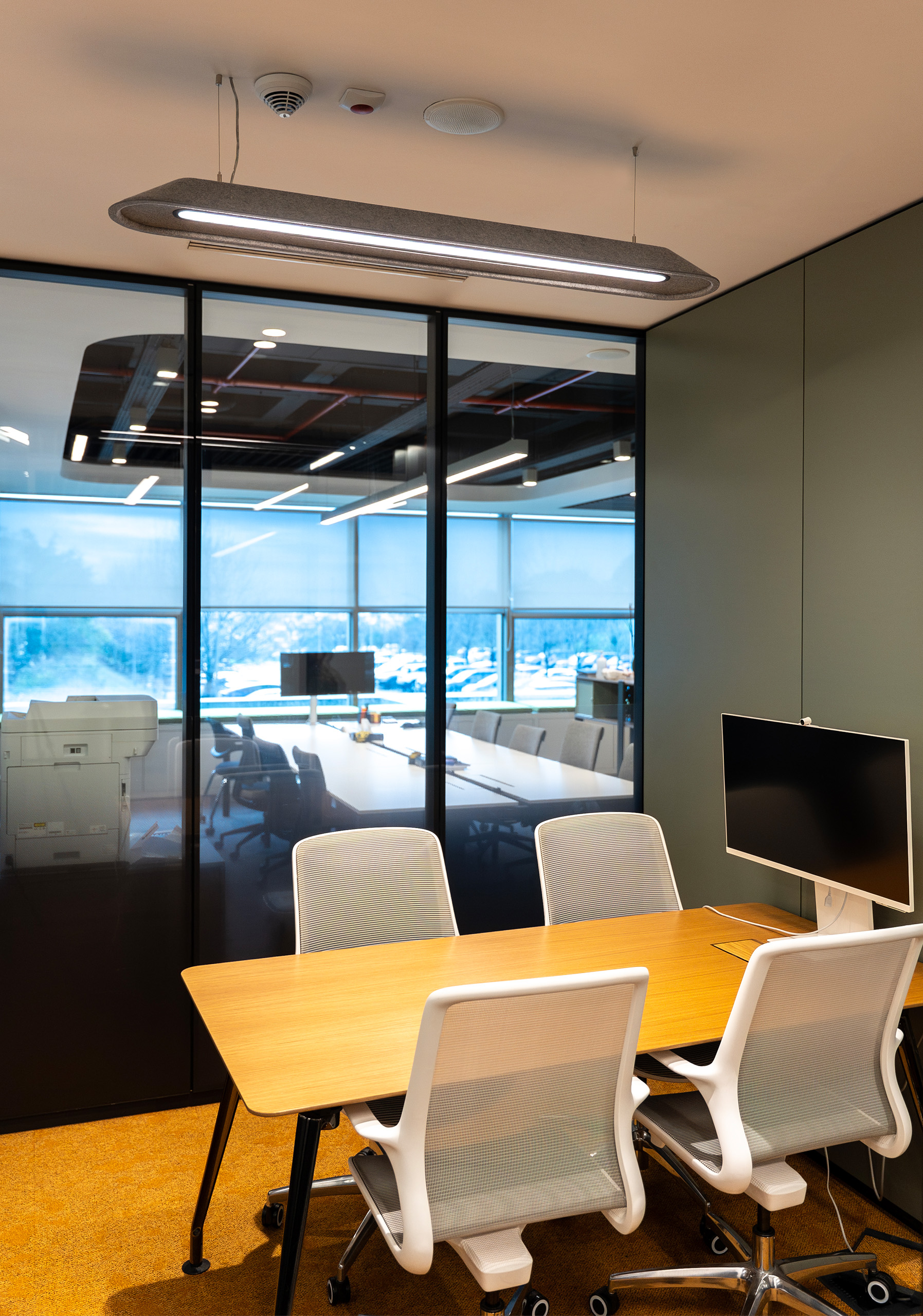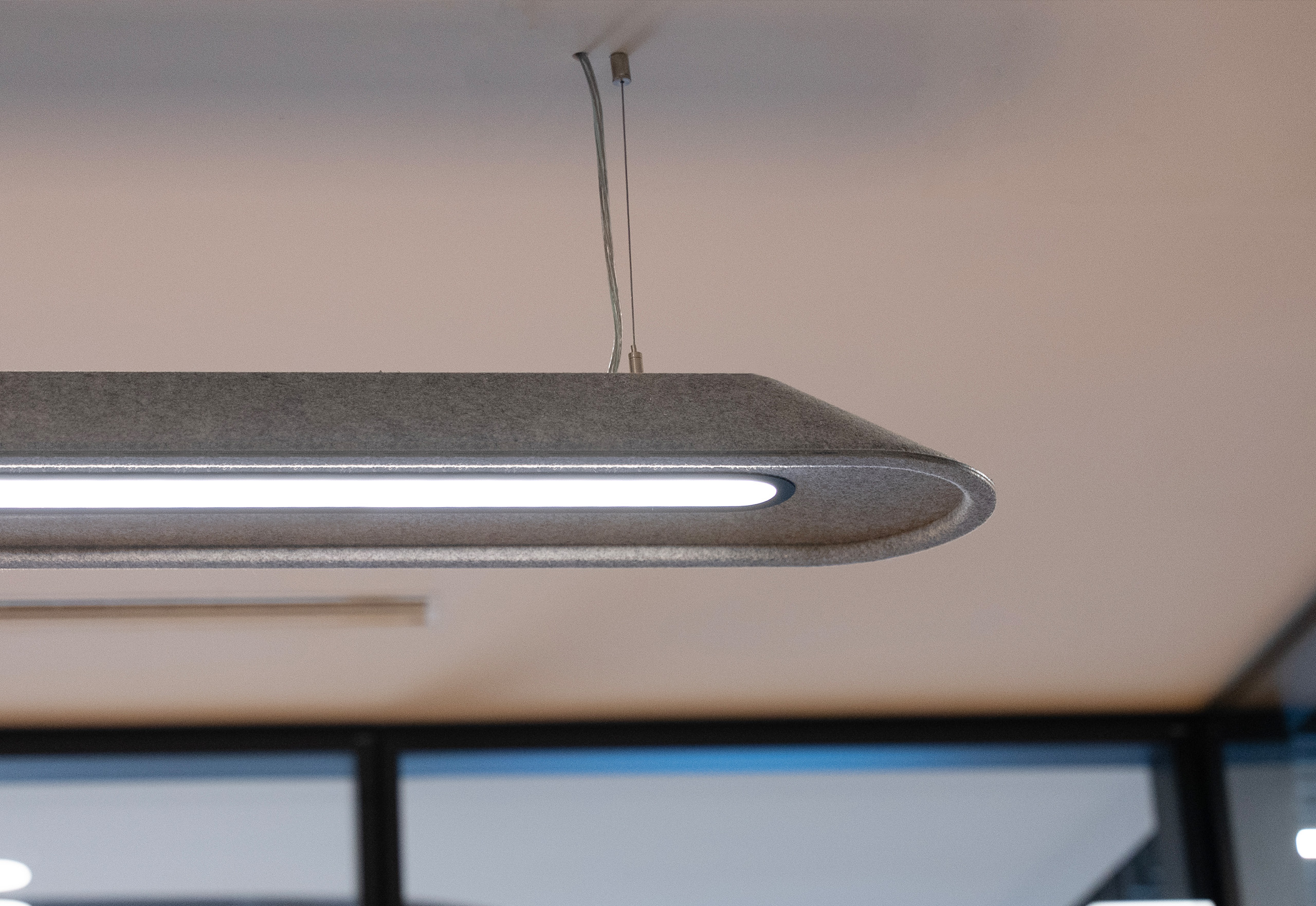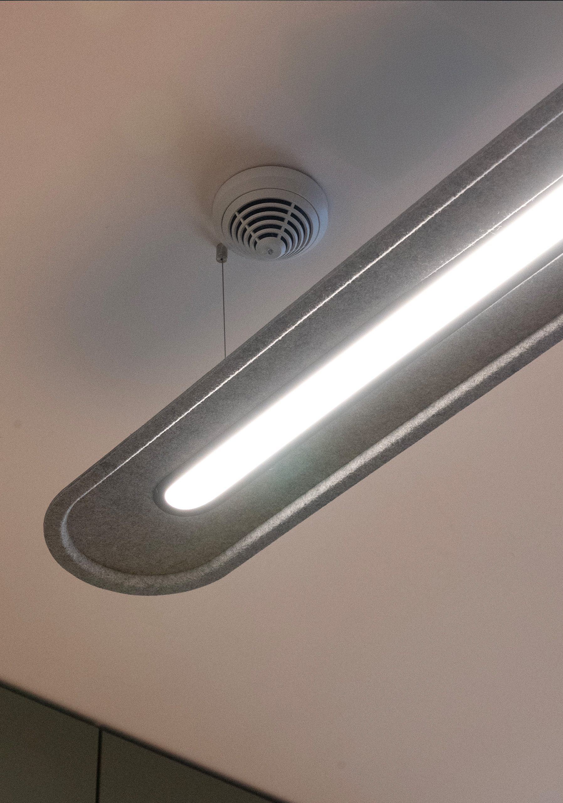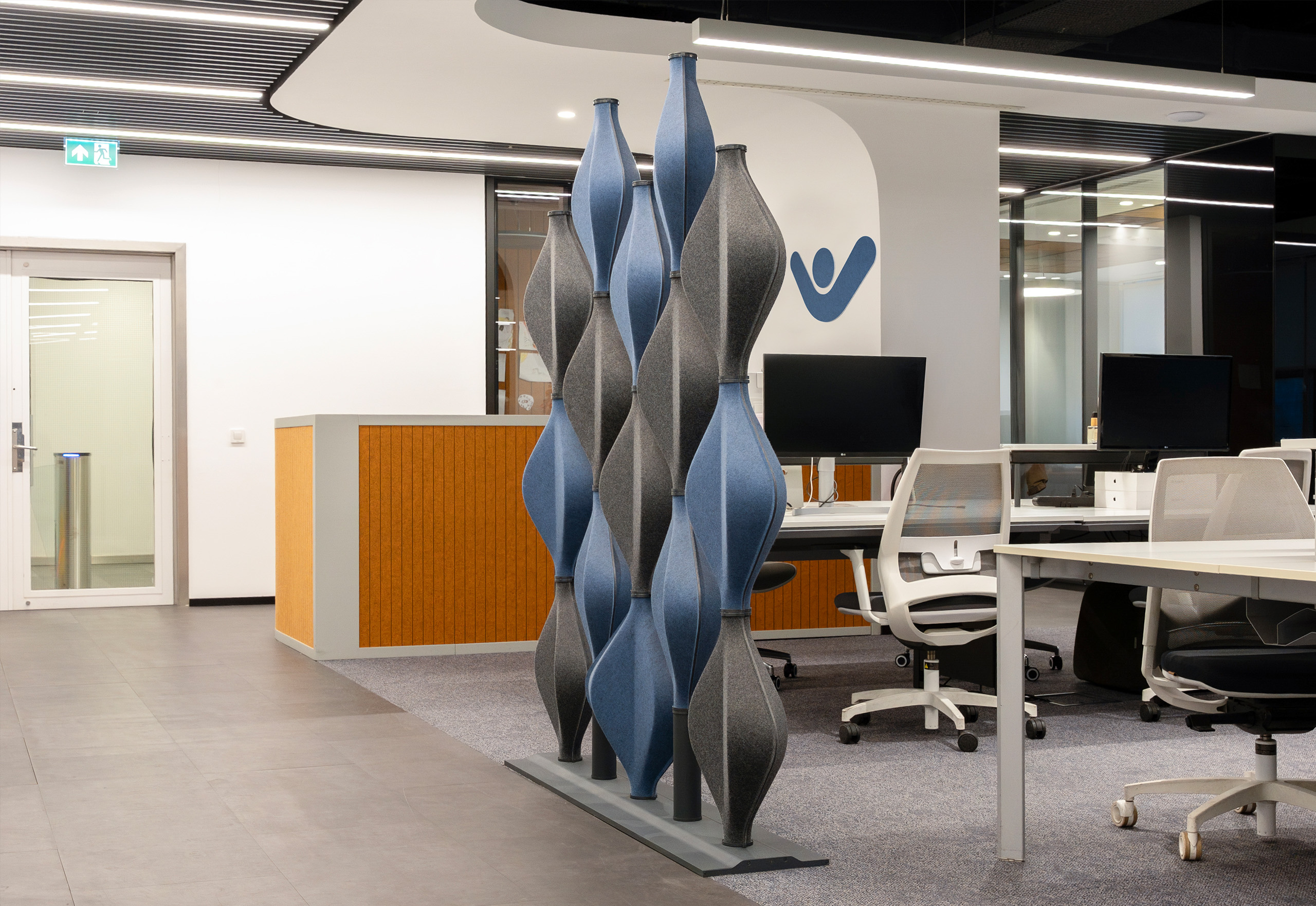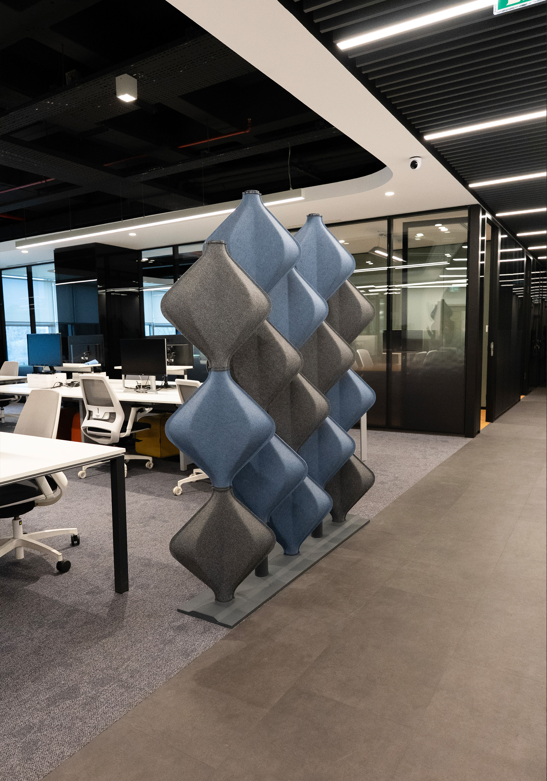 For this reason, the project integrates different Feltouch solutions across the interior. In circulation and shared areas, Make Up suspended lighting is installed on the ceiling. This solution supports both lighting and acoustic comfort. Additionally, Diagon dividers define work zones and limit sound transfer between nearby spaces. At the same time, they maintain visual openness.
