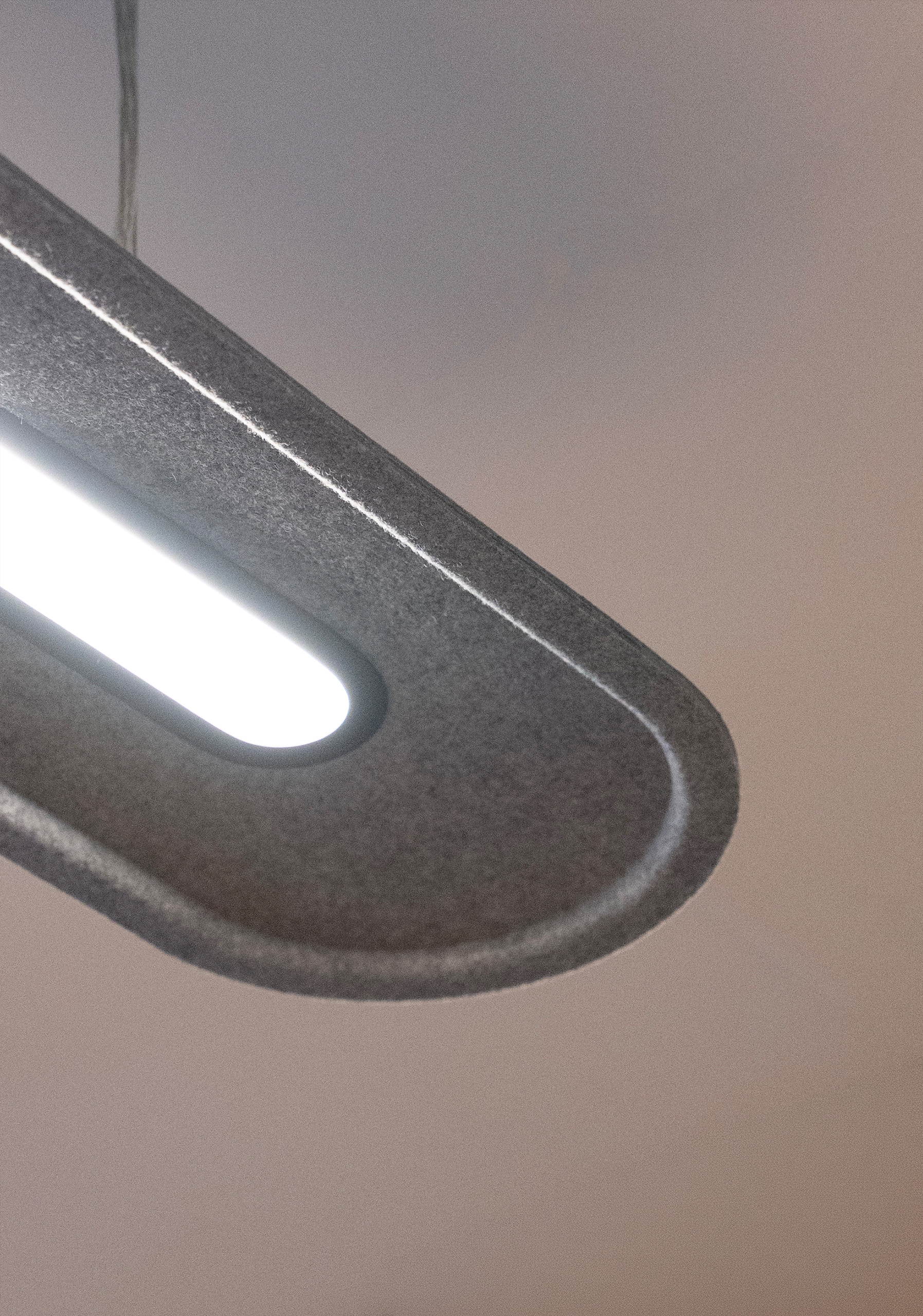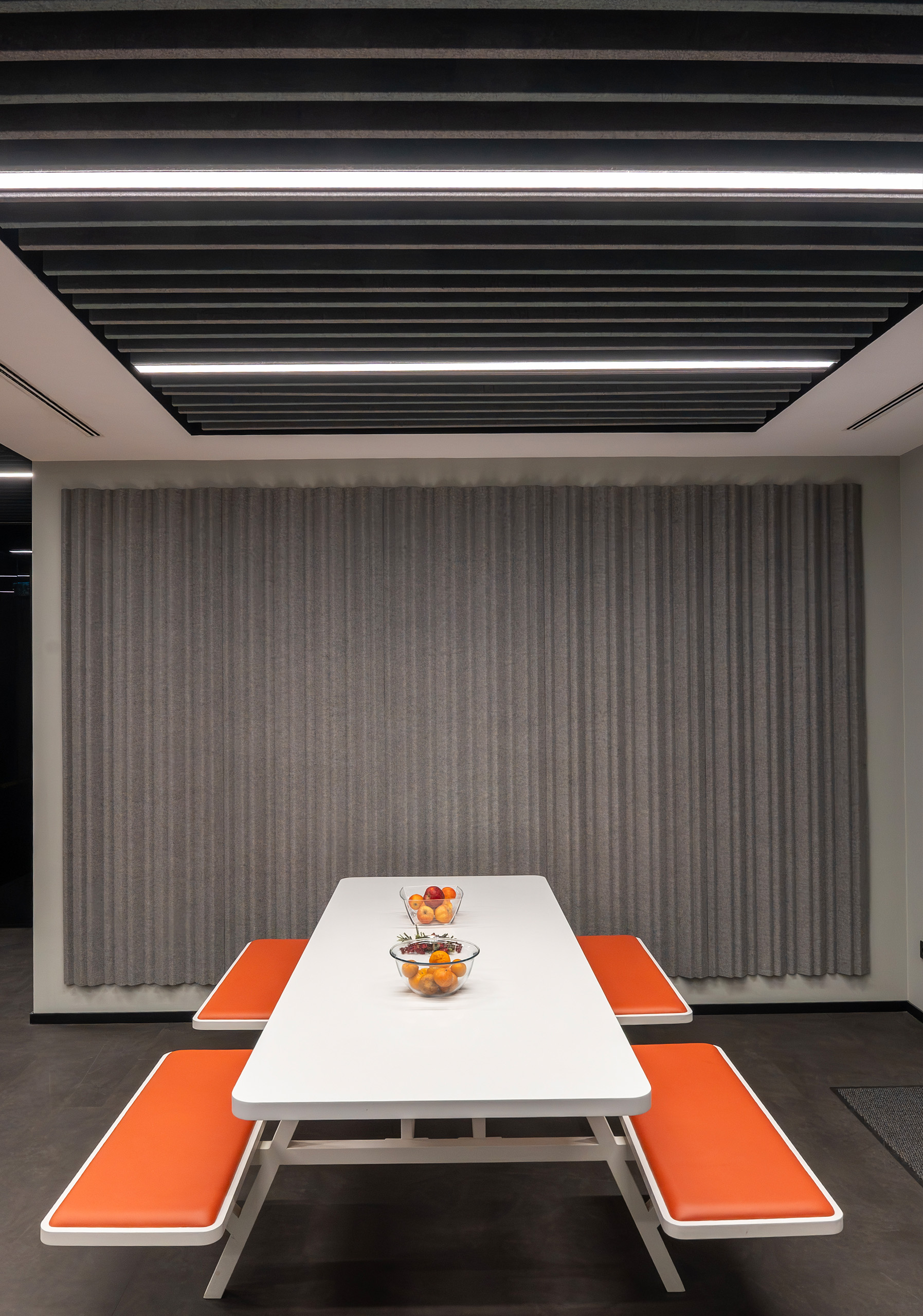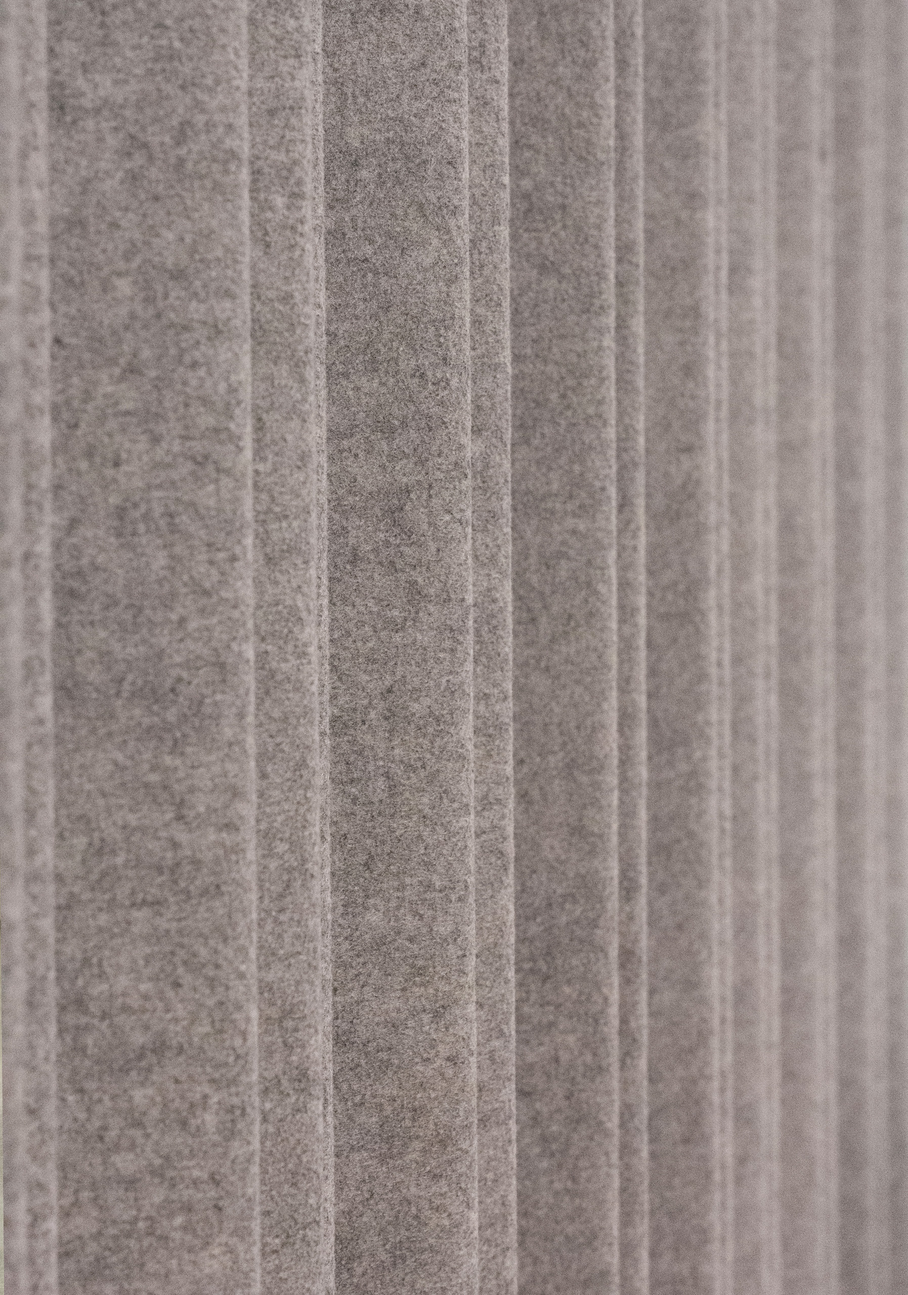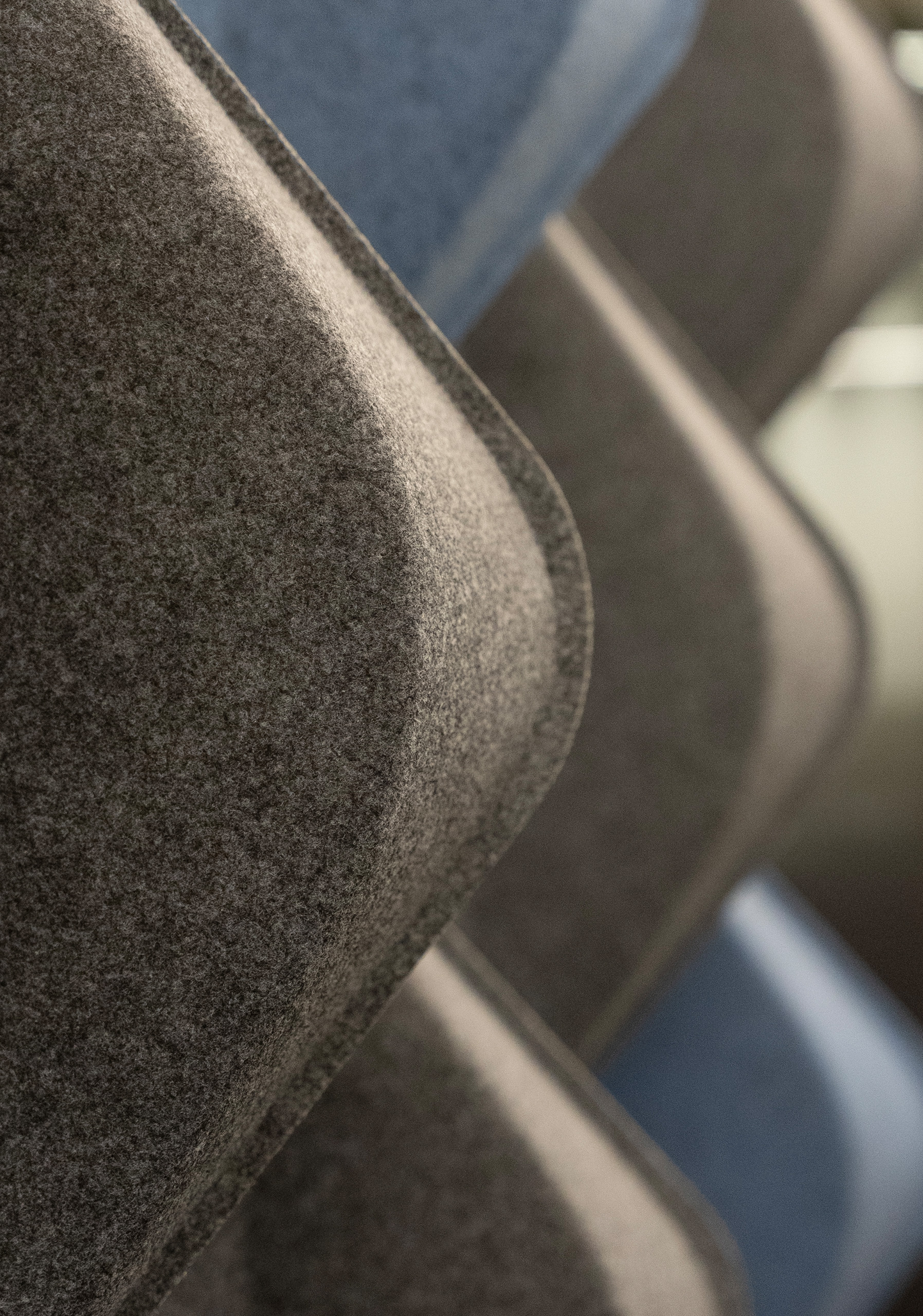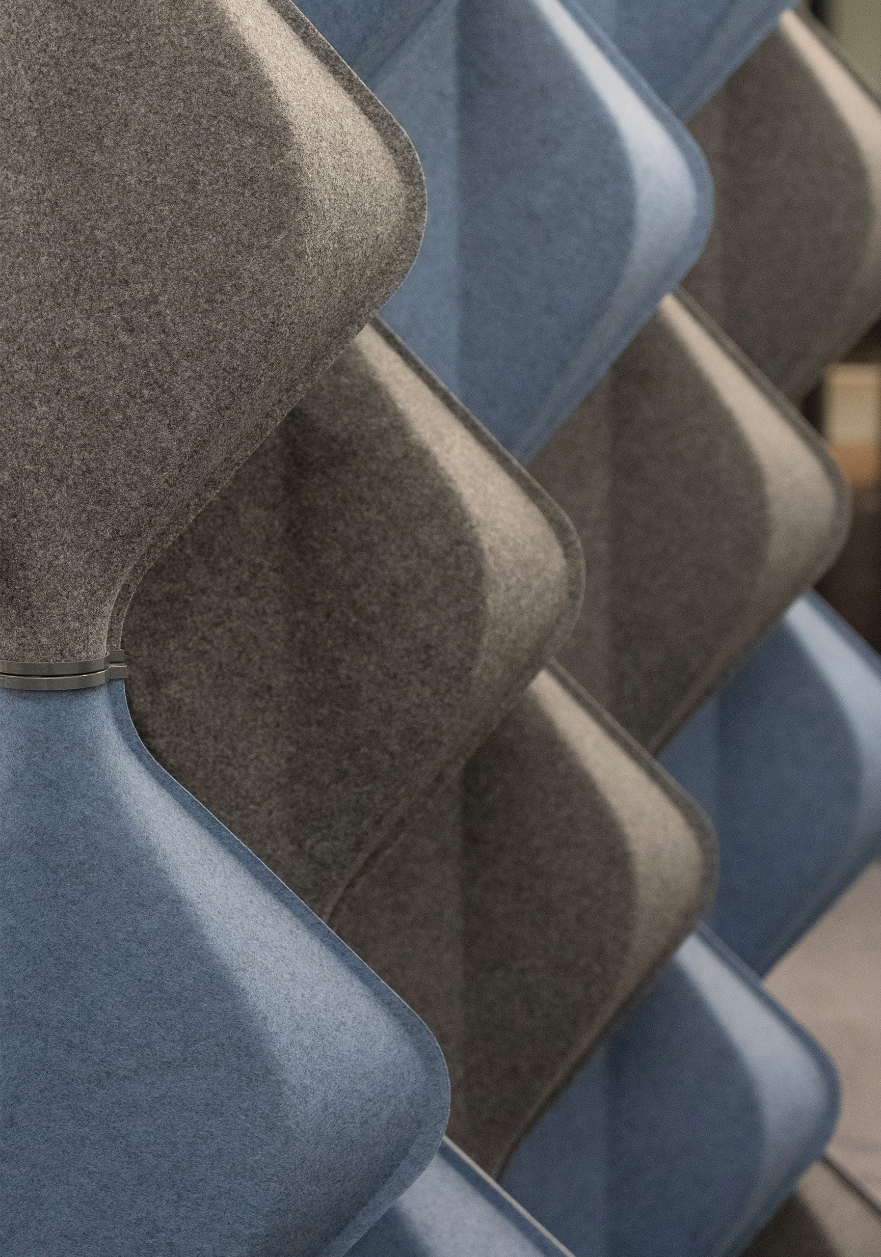 For this reason, the project integrates different Feltouch solutions across the interior. In circulation and shared areas, Make Up suspended lighting is installed on the ceiling. This solution supports both lighting and acoustic comfort. Additionally, Diagon dividers define work zones and limit sound transfer between nearby spaces. At the same time, they maintain visual openness.