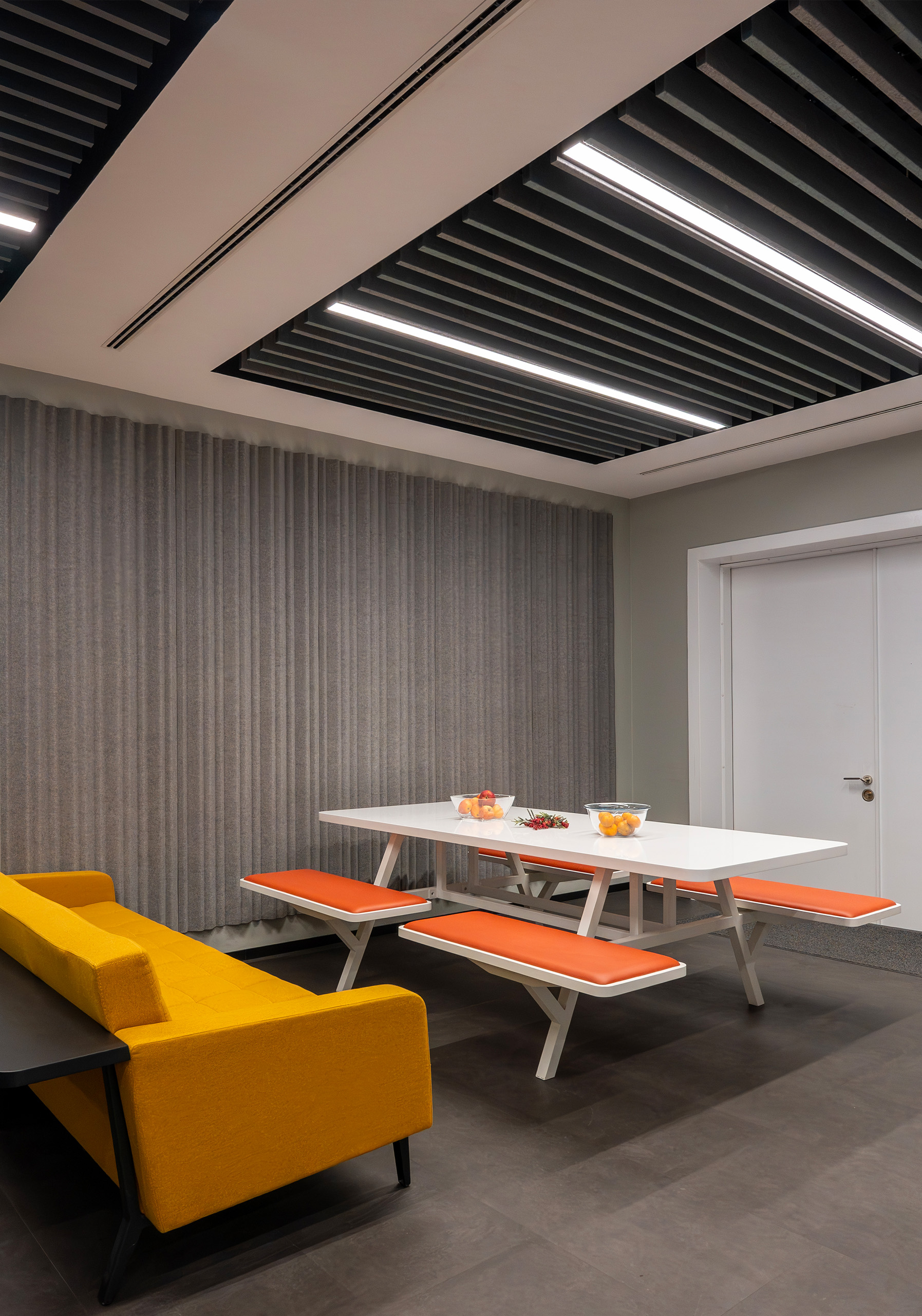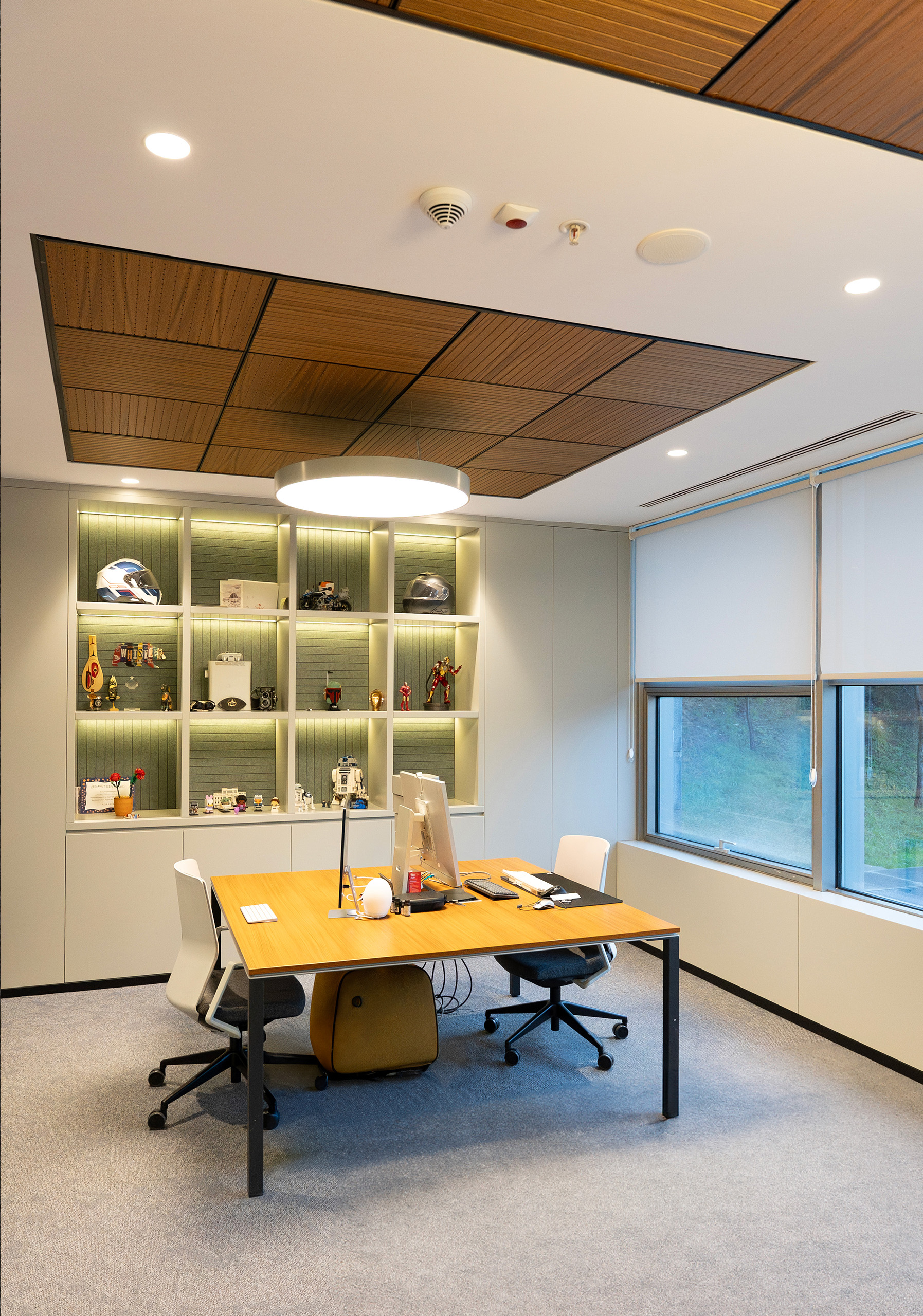 As a result, the Valensas Office offers a more comfortable working environment. The interior supports focus, clear communication, and balanced acoustic performance through ceiling, wall, divider, lighting, and cladding-based solutions.