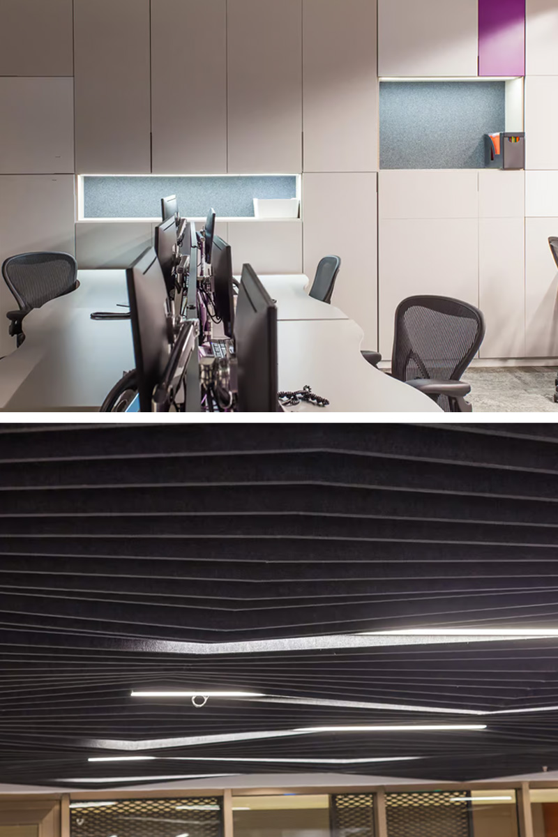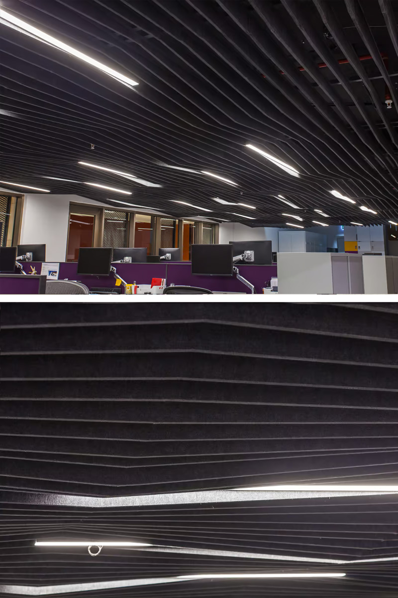 The acoustic strategy controls reverberation time while supporting a clean and modern interior. Plate panels work as wall panels and absorb sound reflections on vertical surfaces. They help reduce overall noise levels. Baffle panels sit above workstations to control sound locally and also act as divider elements. They define zones and reduce sound transfer between desks. Cloud panels hang above the open office areas and control sound from above, creating a more balanced acoustic environment.