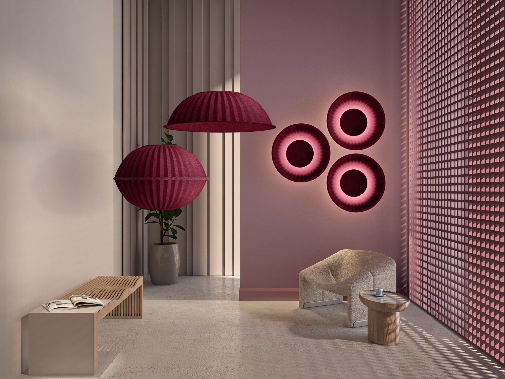 Flow, designed by Ali Berkman, will be showcased for the first time as part of the Sparkle Collection. Made from shaped felt, Flow merges elegant form with acoustic efficiency and offers two length options, delivering versatile linear illumination for diverse environments, from workspaces to social areas.