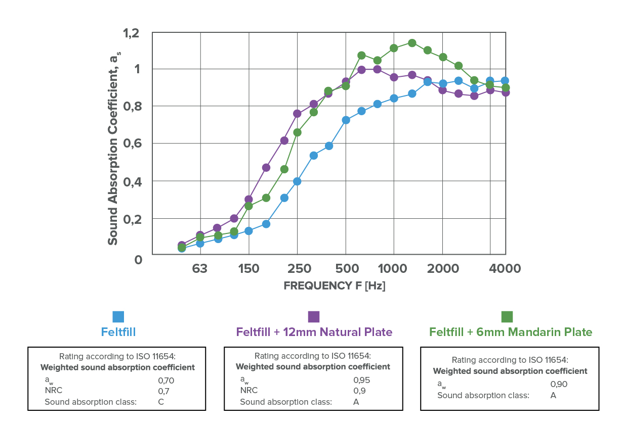 Feltfill has been rigorously tested in compliance with ISO 354 and ASTM C423 standards, demonstrating its excellent acoustic performance. With a weighted sound absorption coefficient (αw) of 0.70, Feltfill effectively reduces sound reverberation across various frequencies. Thanks to its proven reliability and high performance, Feltfill is the ideal solution for creating quieter, more comfortable interiors across diverse applications