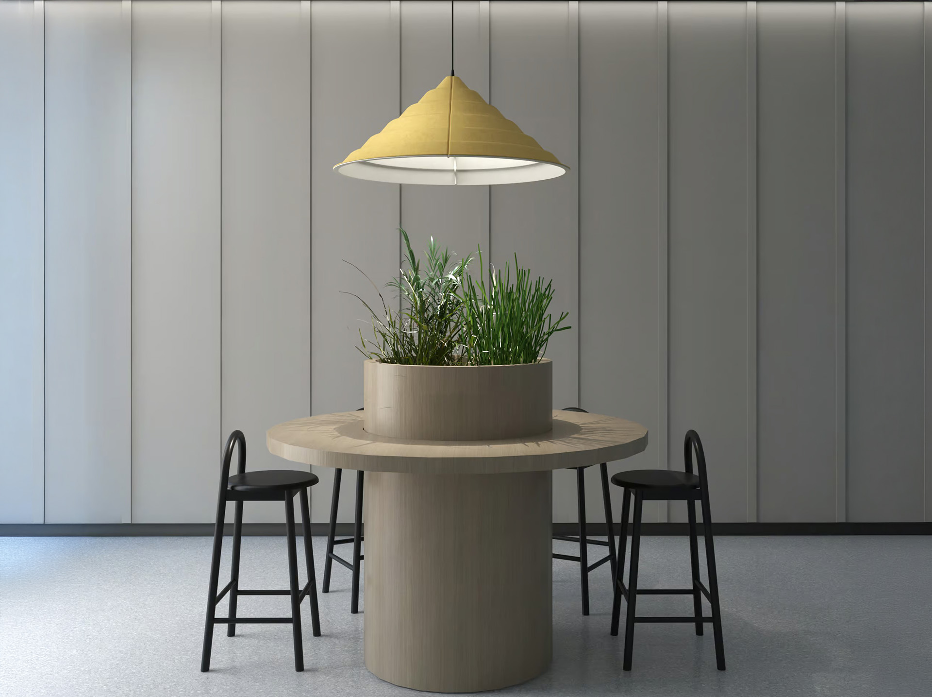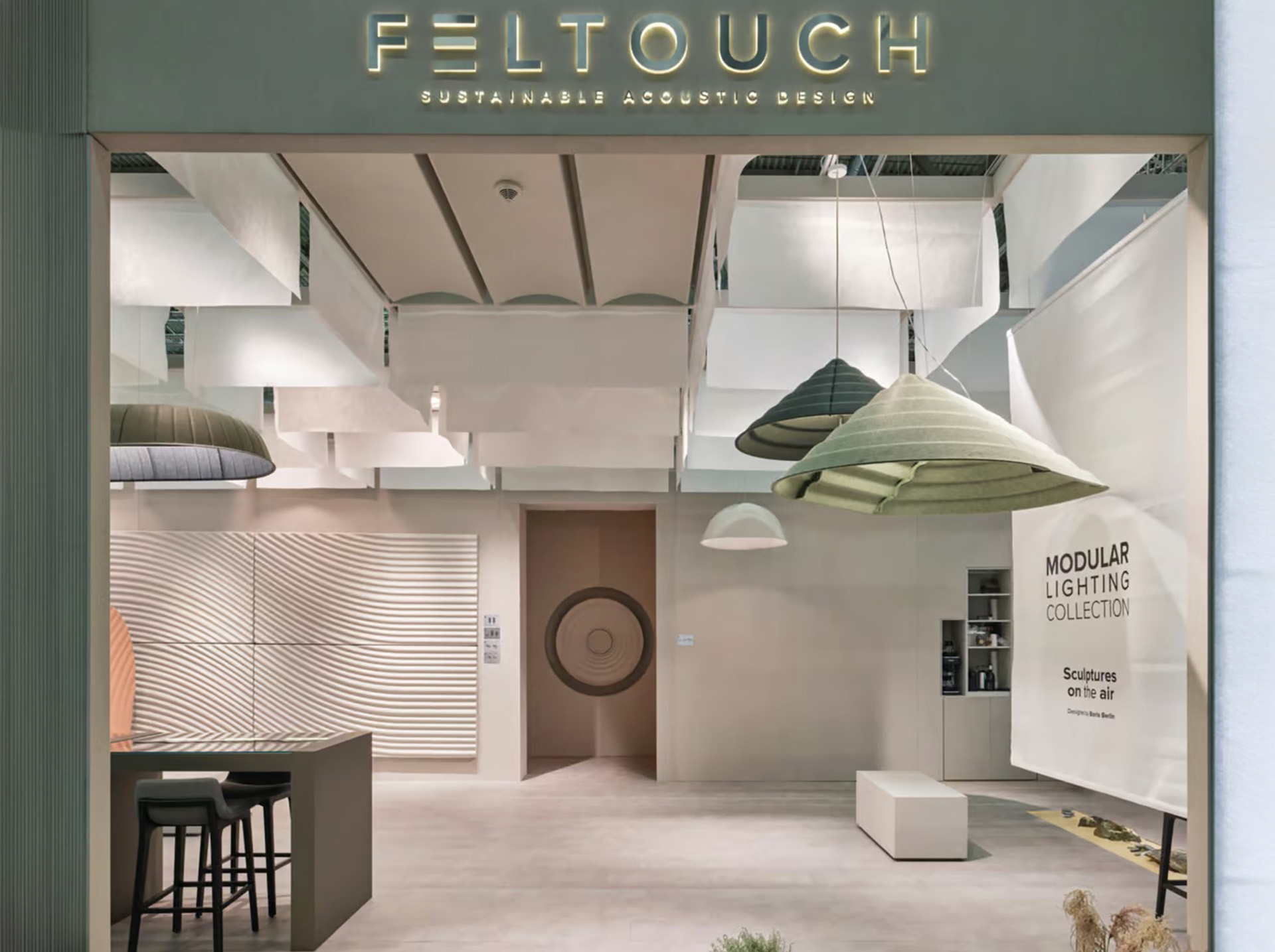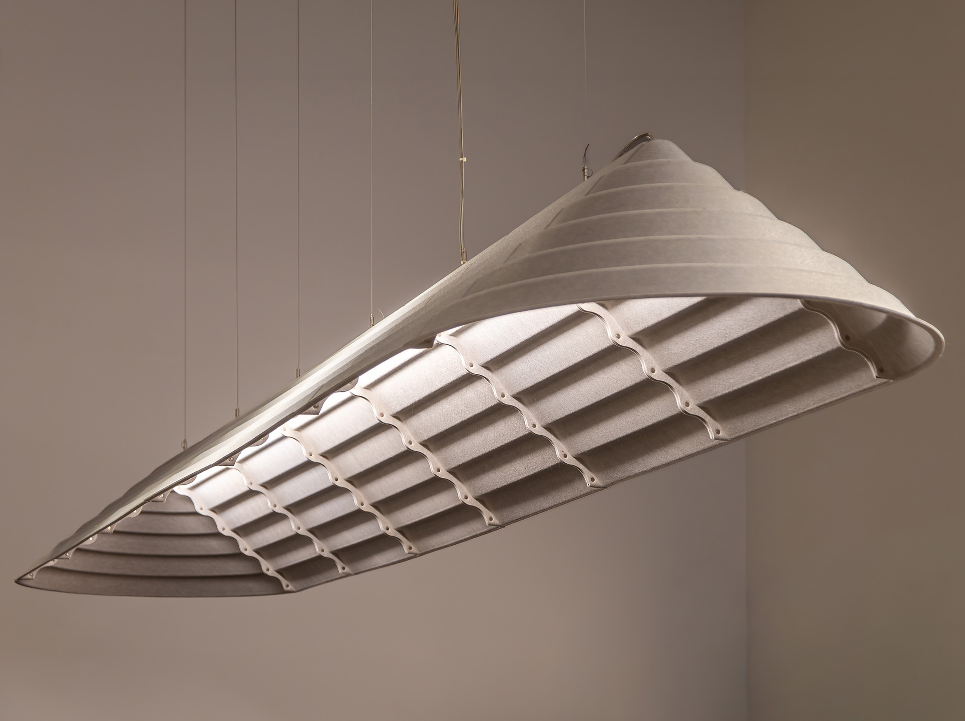 Step lampshades are produced from recycled PET felt. This material reflects light while also absorbing ambient sound. As a result, Step Pendant Lighting supports both visual comfort and acoustic balance in interior spaces.