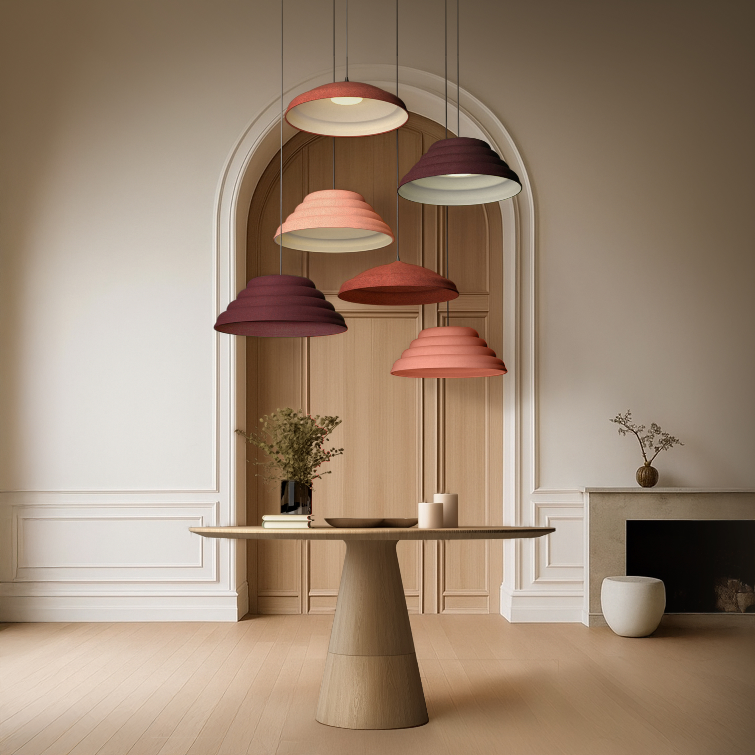 The outer mold includes circular indents that taper upwards for a refined aesthetic, while the inner mold has a simple, minimalist look. Nube is produced from molded PET felt containing 50% recycled polyester derived from PET bottles, combining decorative appeal with acoustic performance for interior spaces.