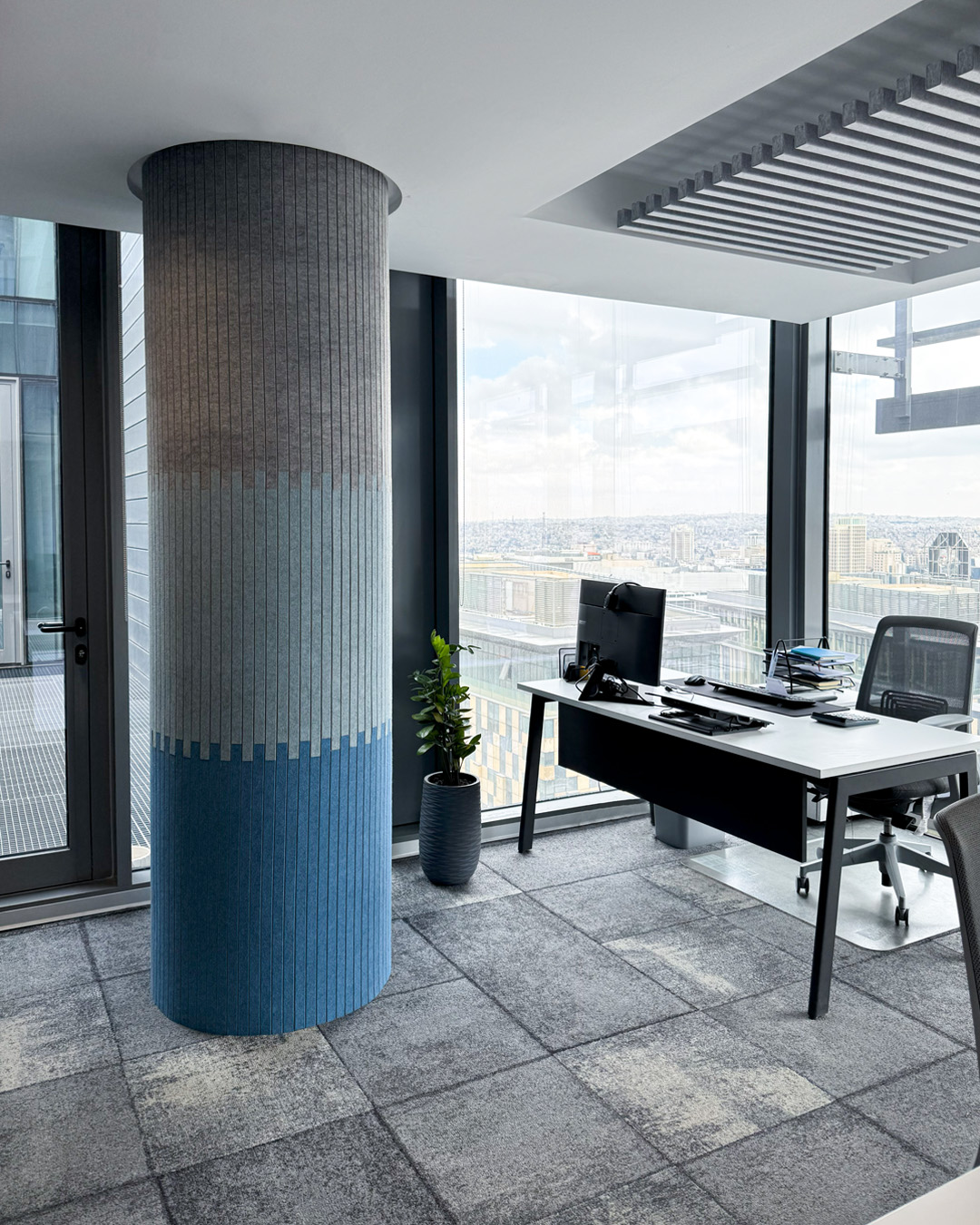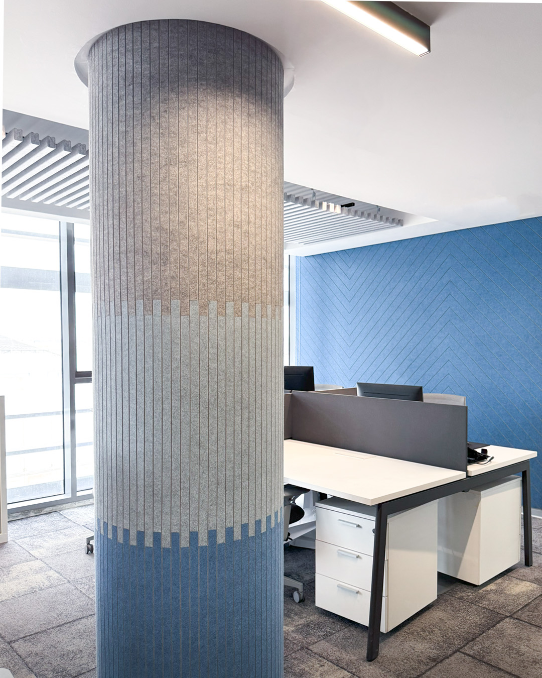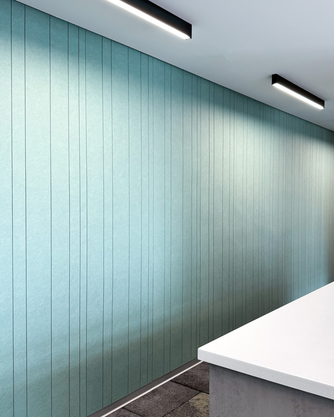 On the columns, the flexibility of the material was utilized not only for its decorative potential but also to contribute to the acoustic performance. A total of 16.905 m² of 6mm thick Tile – Line panels were used, customized with V-Cuts placed at 3cm gaps. The combination of FLM08, FLM07, and FLM06 colors created a smooth tonal transition throughout the space.