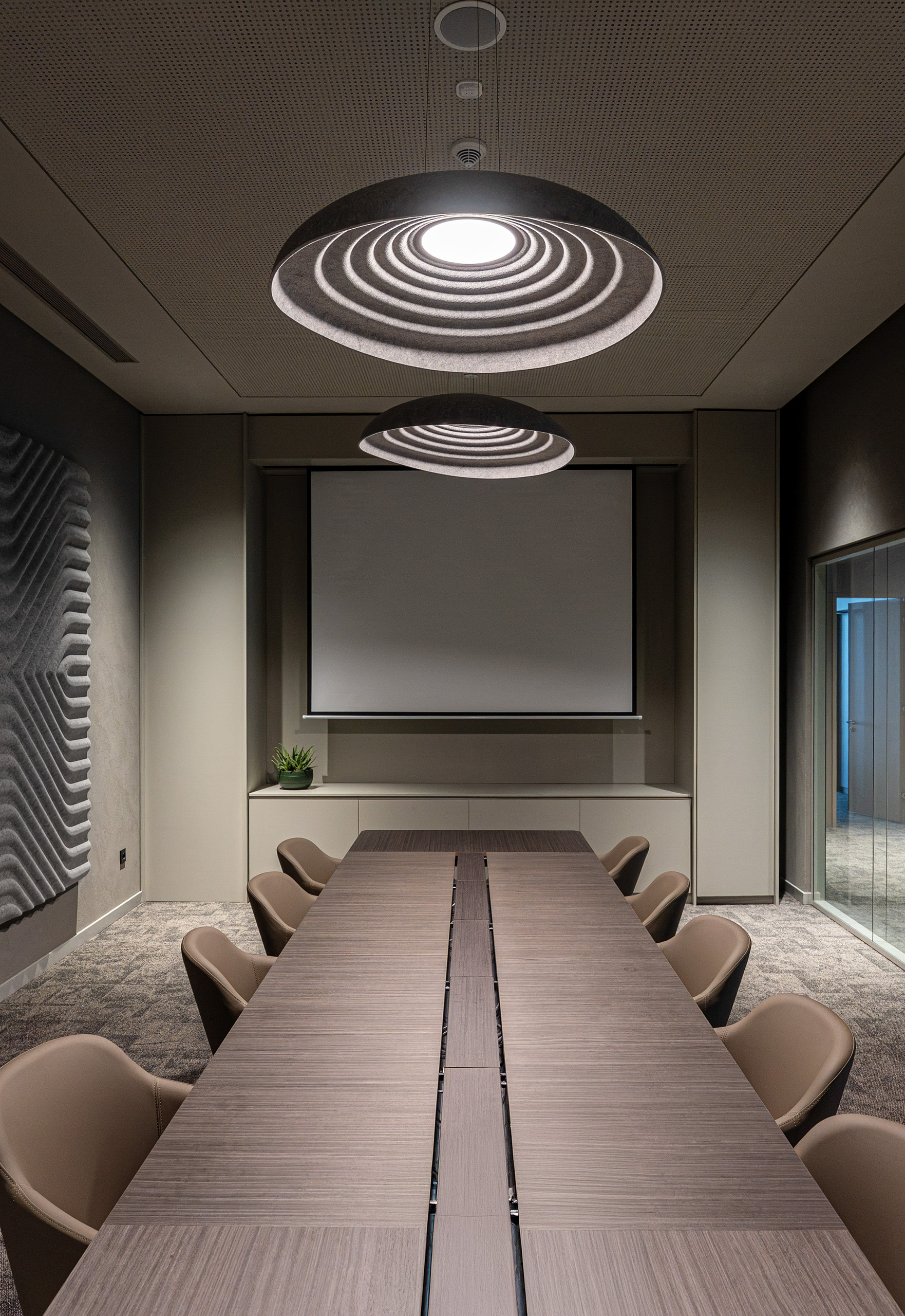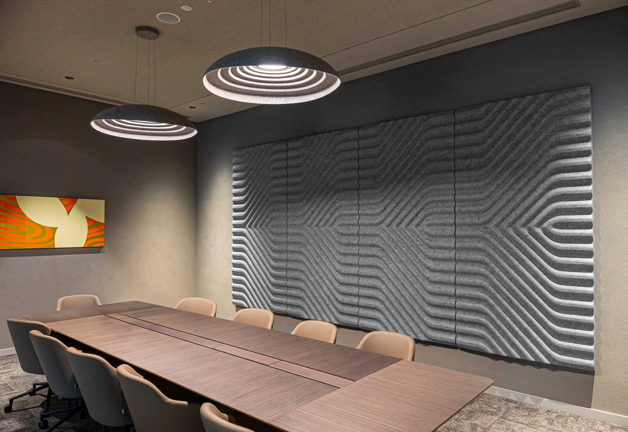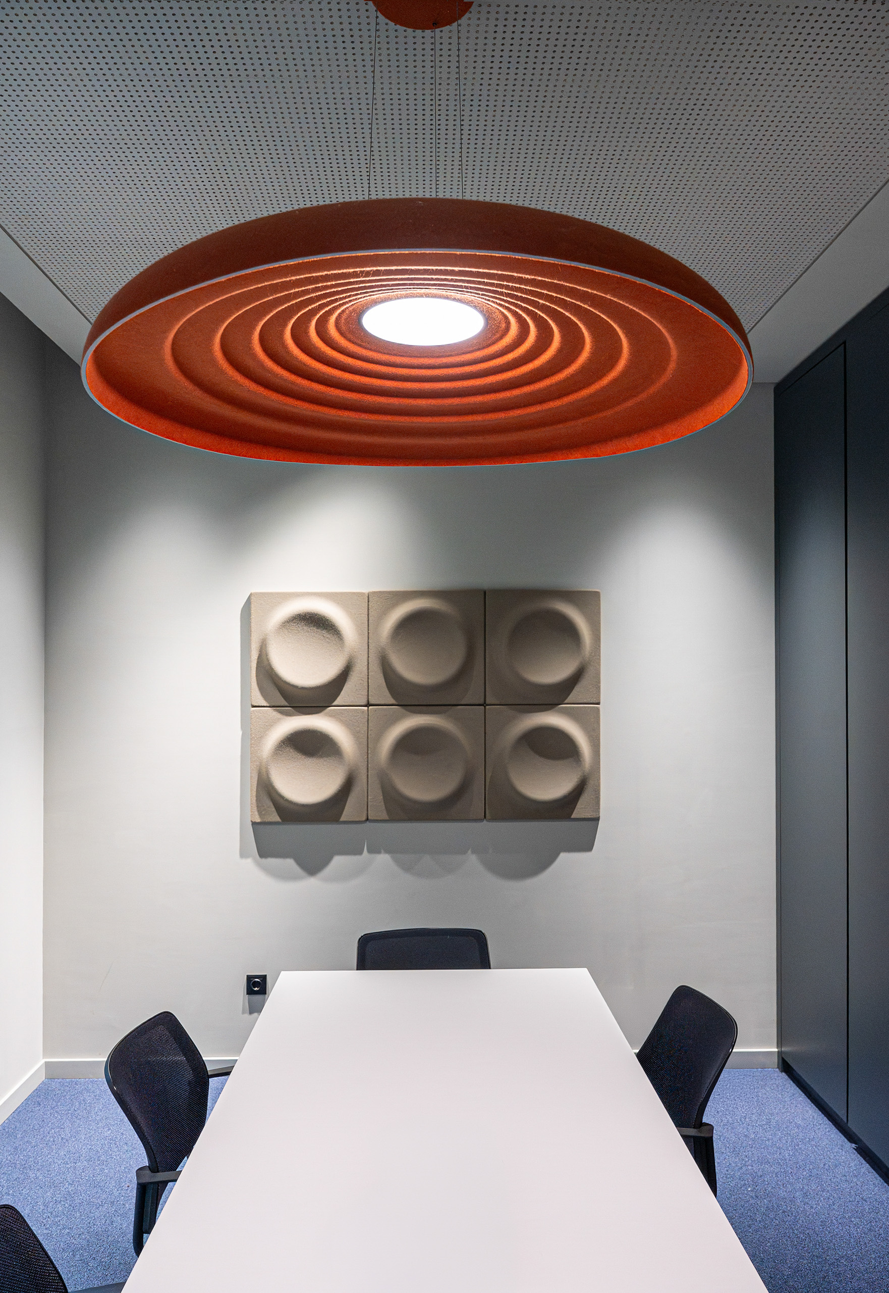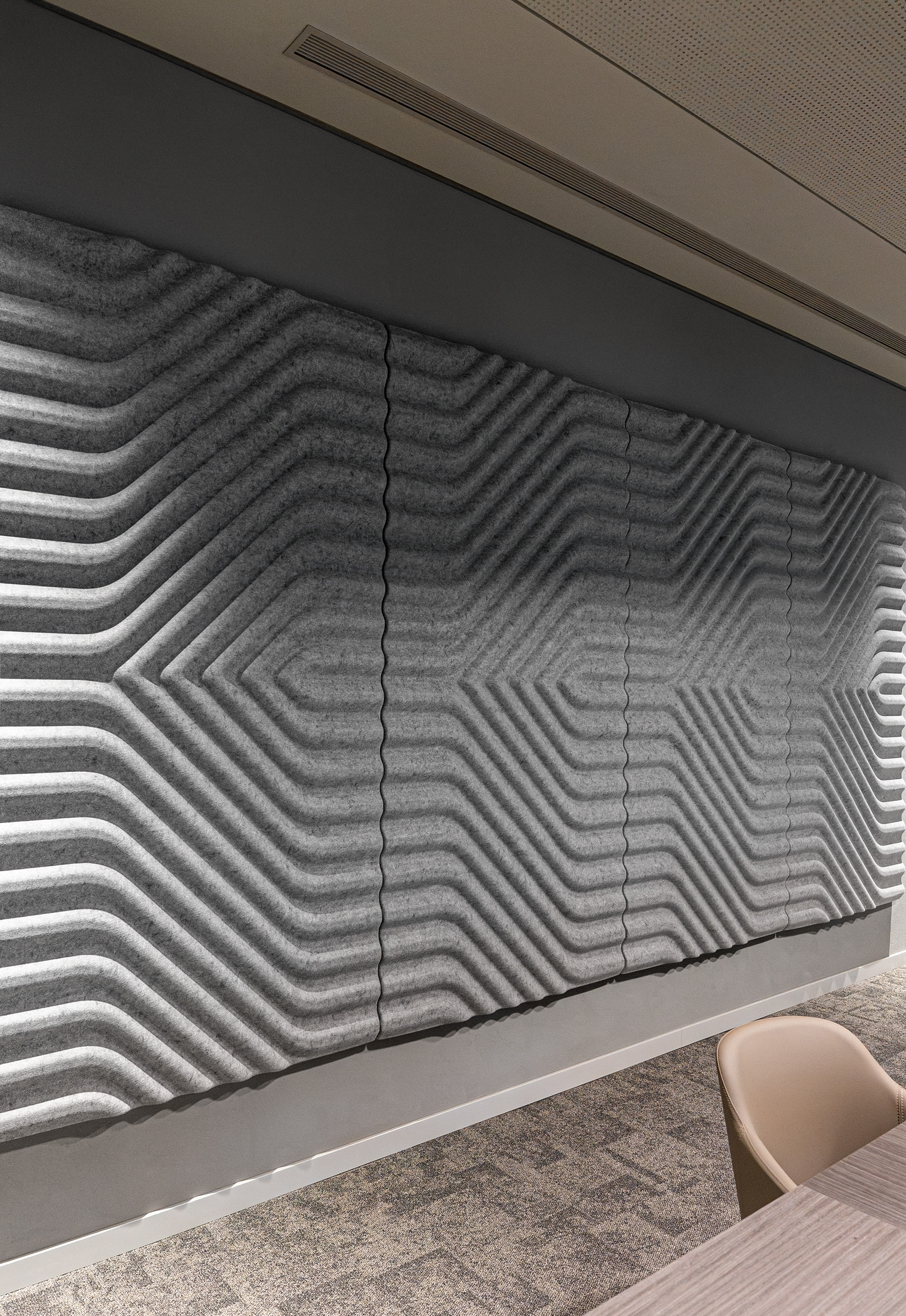 In the meeting rooms, Vertigo wall panels enhance acoustic performance and add strong visual character to the interiors. At the same time, the panels absorb sound reflections on vertical surfaces and help create a controlled environment for meetings and discussions.