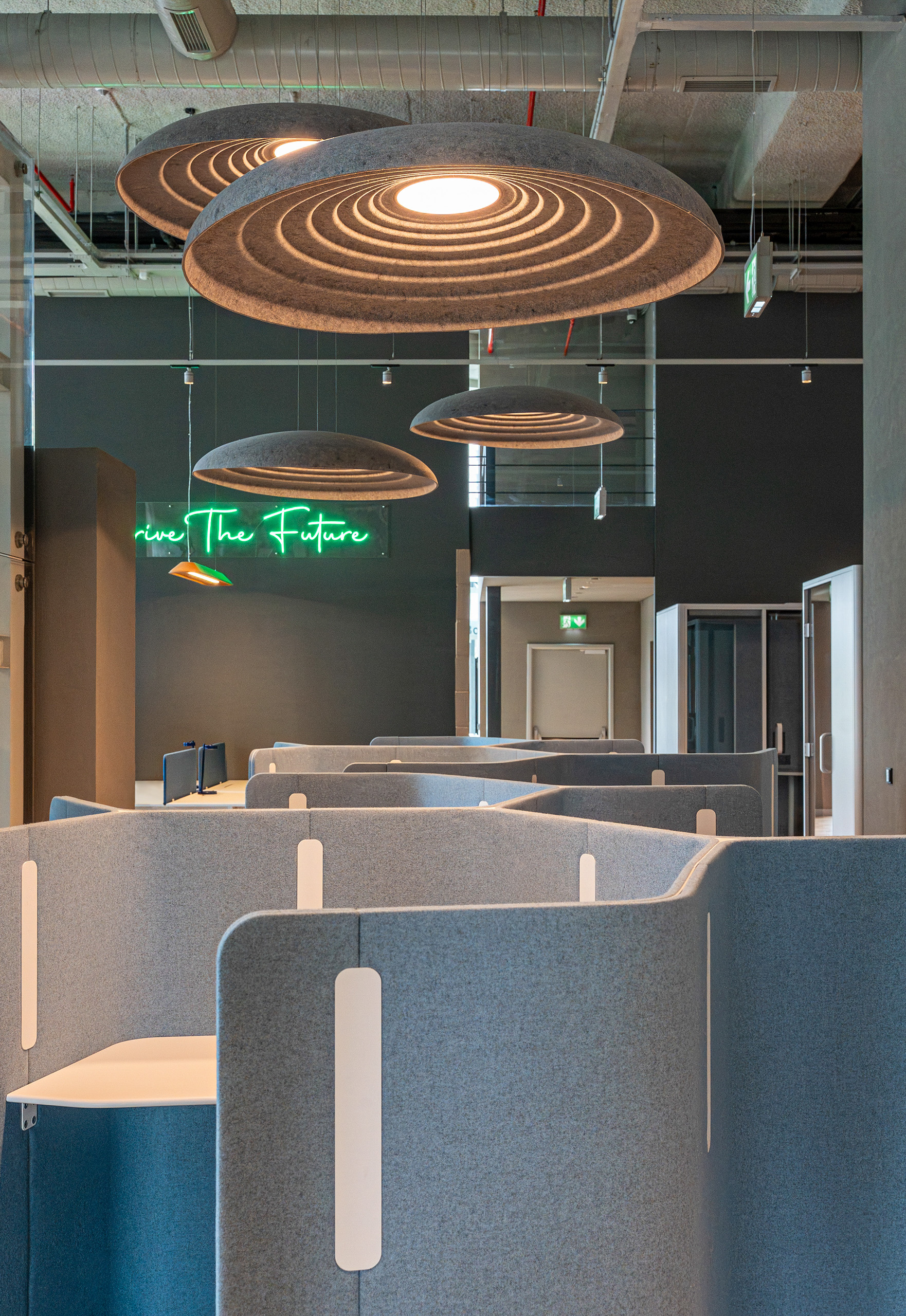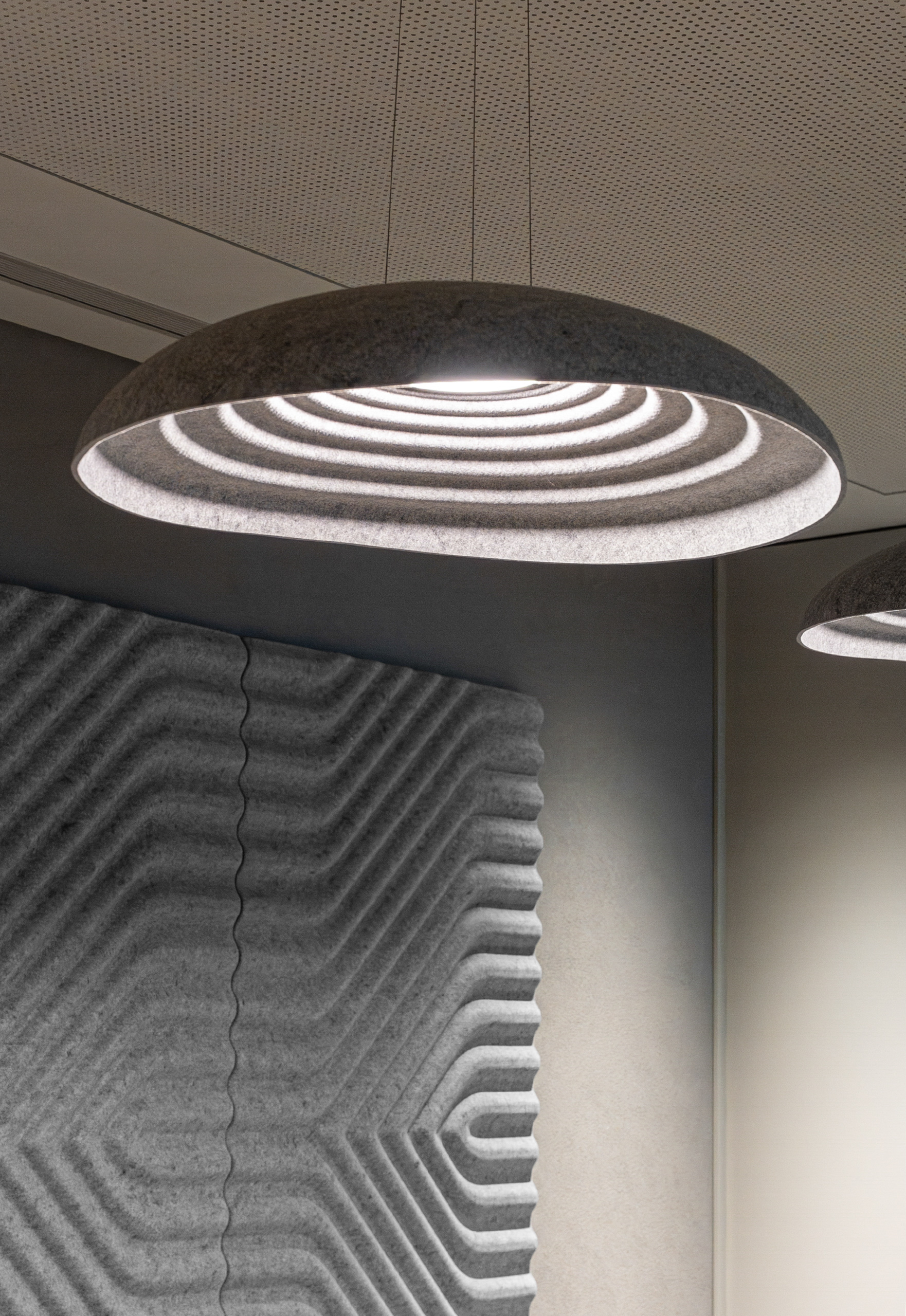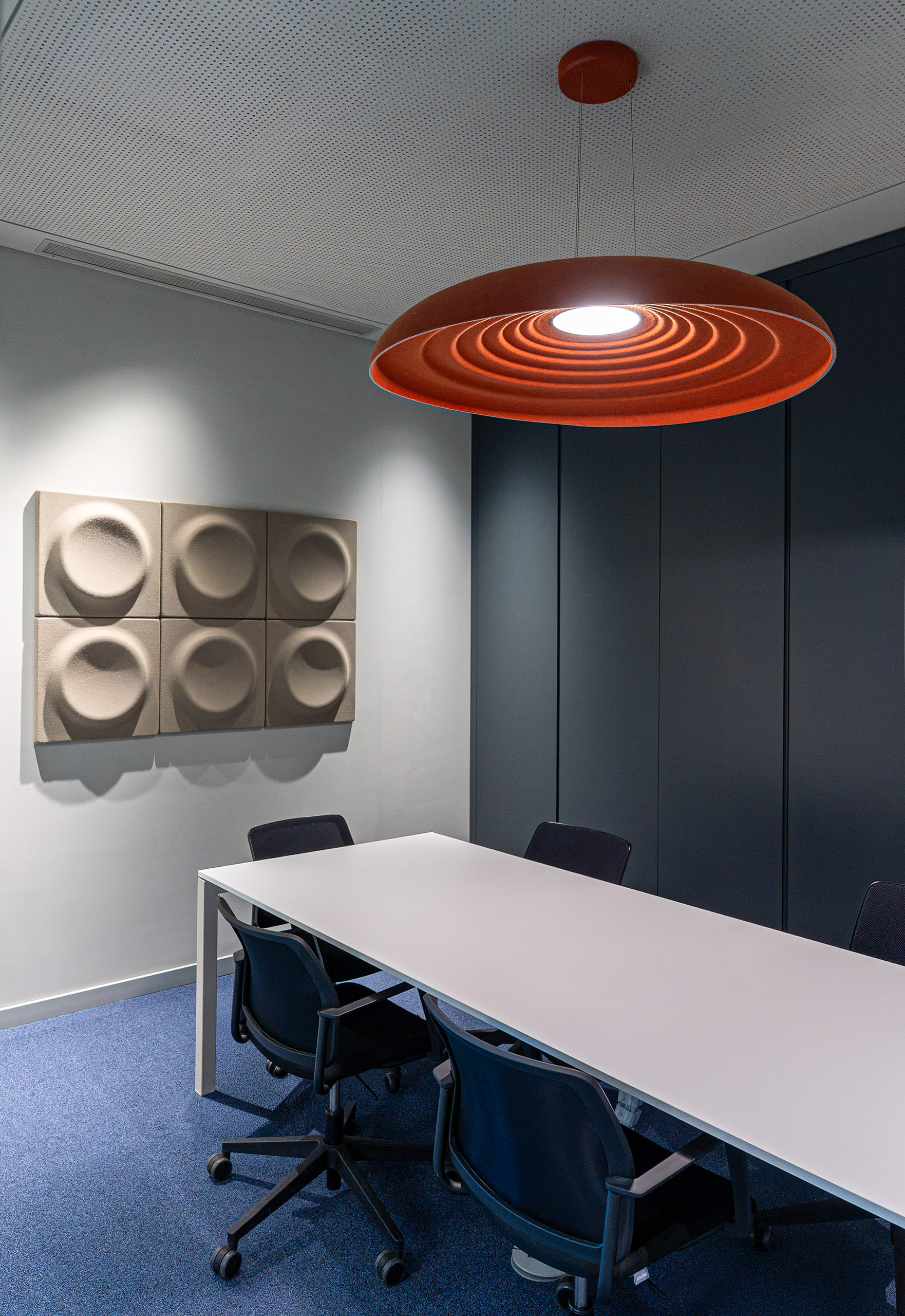 Together, the Vertigo wall panels, Octopus panels, Make Up Lighting elements, Grid Cloud features, and Ripple acoustic lighting reduce reverberation time across the office. As a result, these solutions minimize workplace noise and the issues it can cause, supporting clearer communication, better concentration, and improved acoustic comfort.