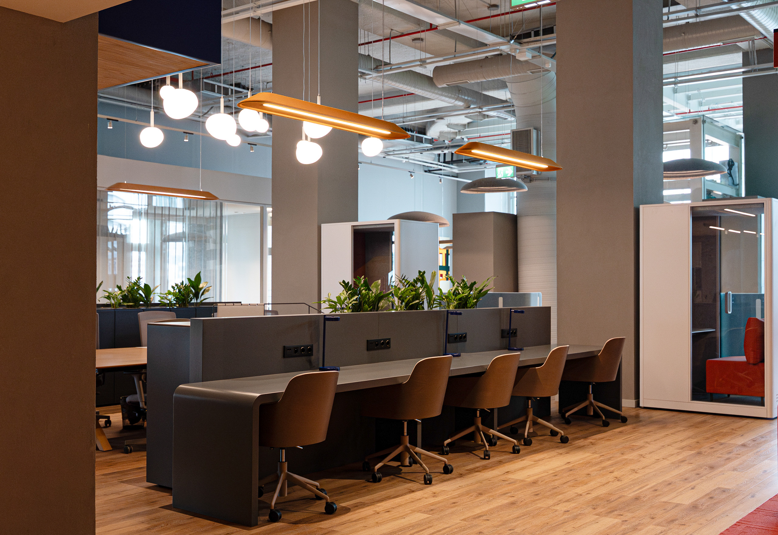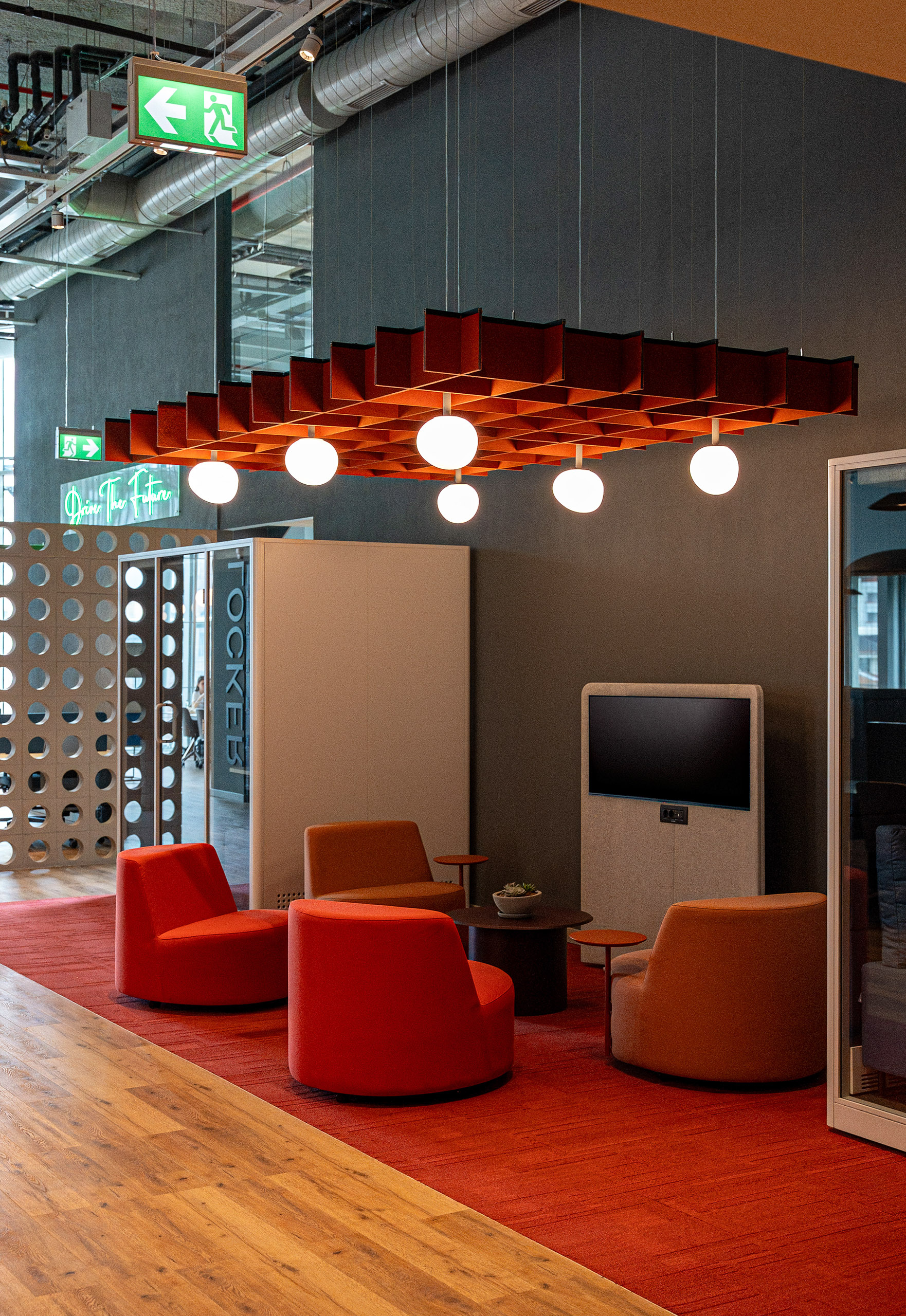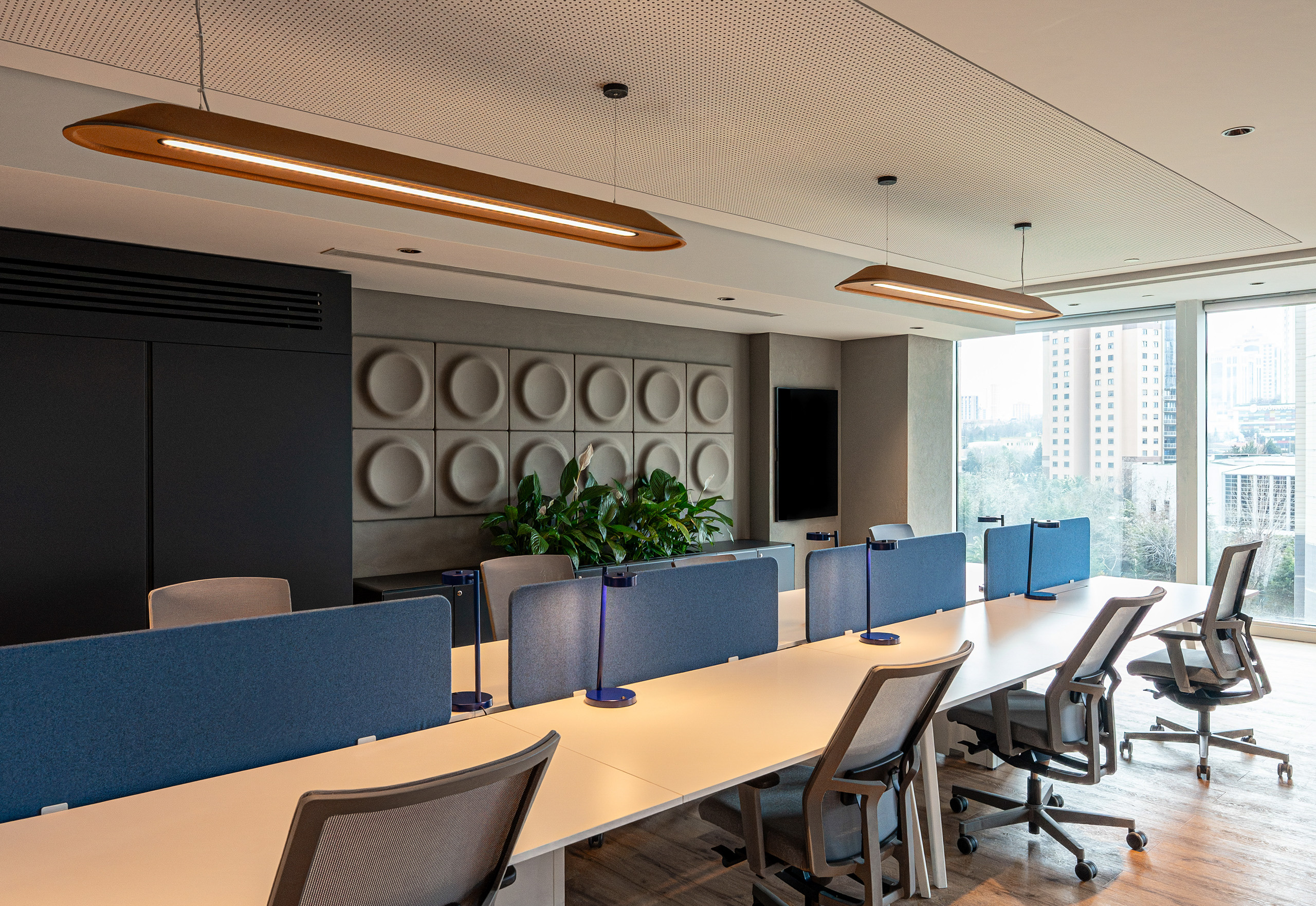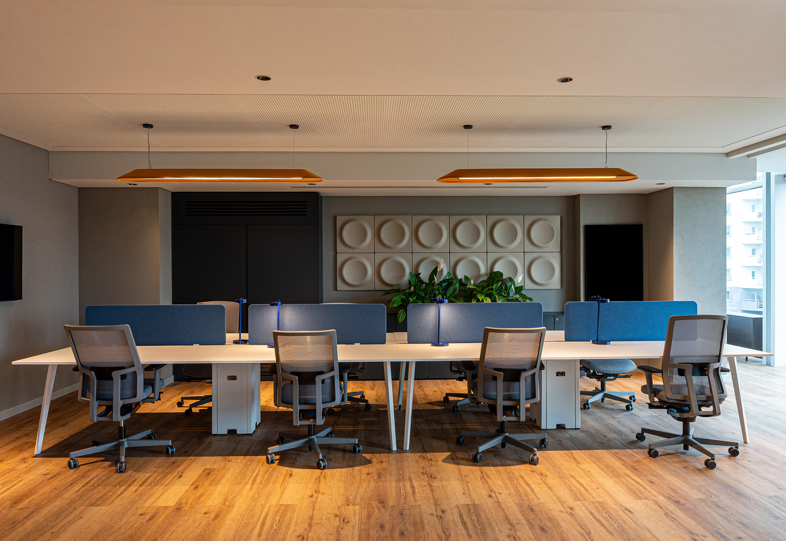 Together, the Vertigo wall panels, Octopus panels, Make Up Lighting elements, Grid Cloud features, and Ripple acoustic lighting reduce reverberation time across the office. As a result, these solutions minimize workplace noise and the issues it can cause, supporting clearer communication, better concentration, and improved acoustic comfort.