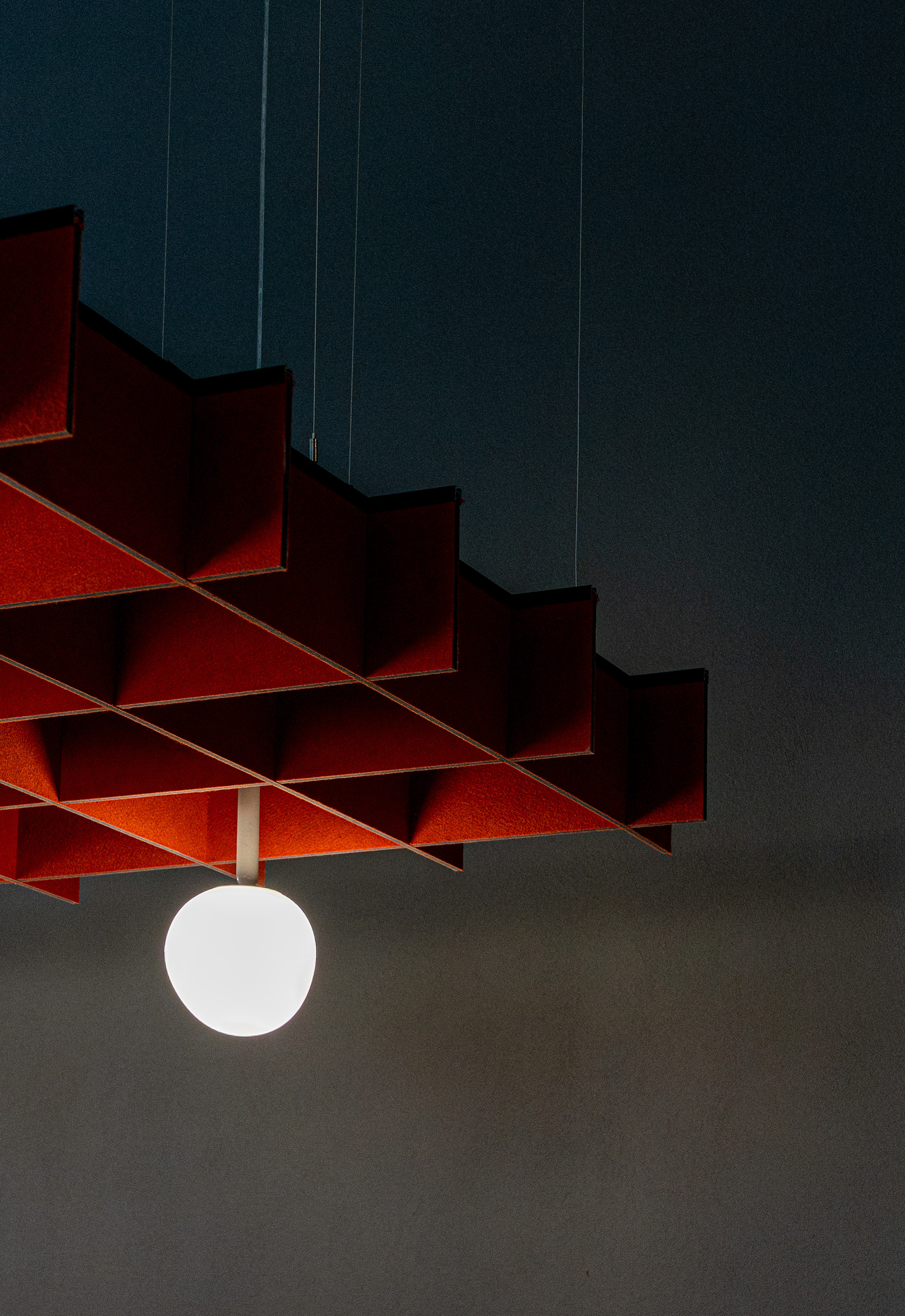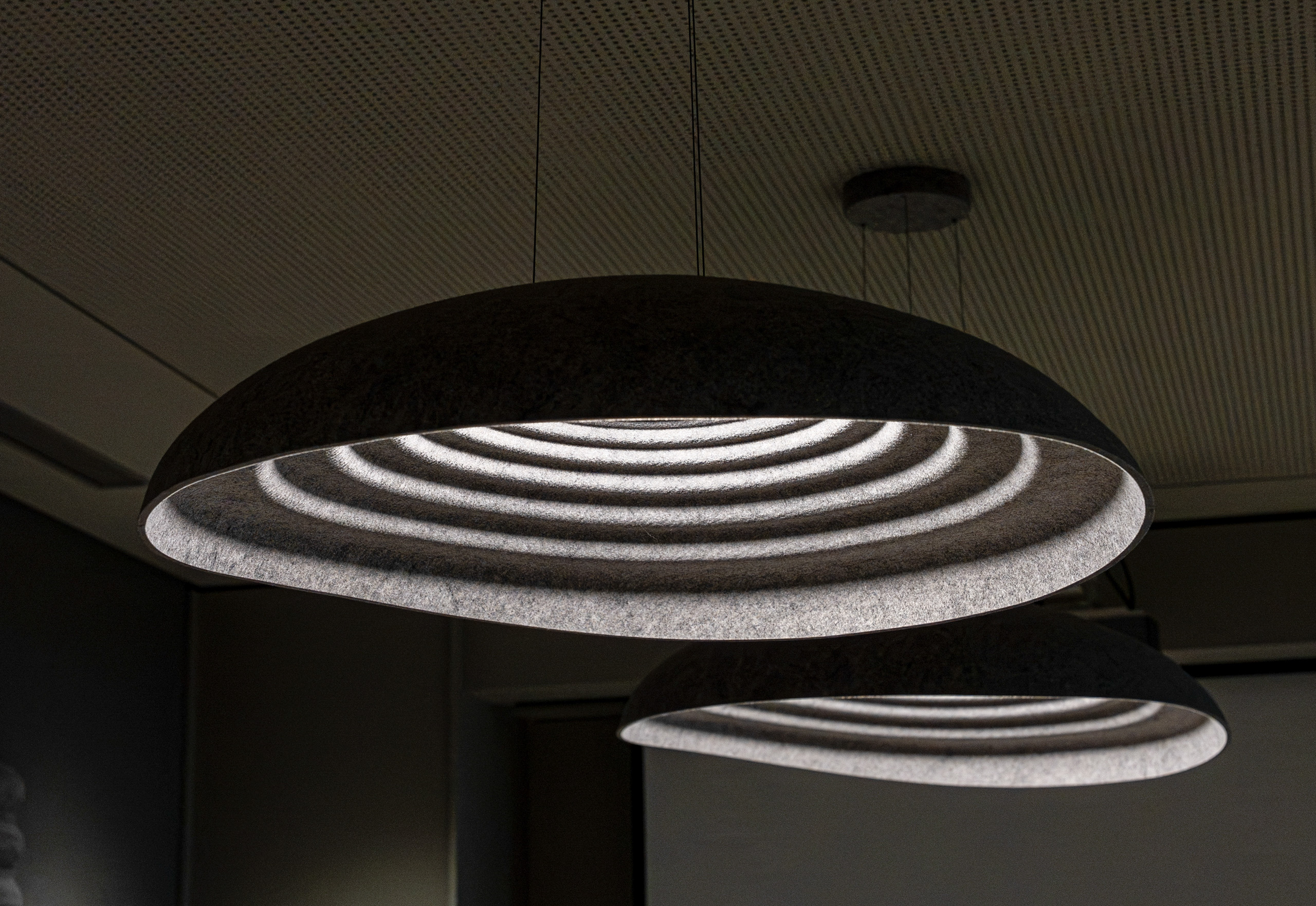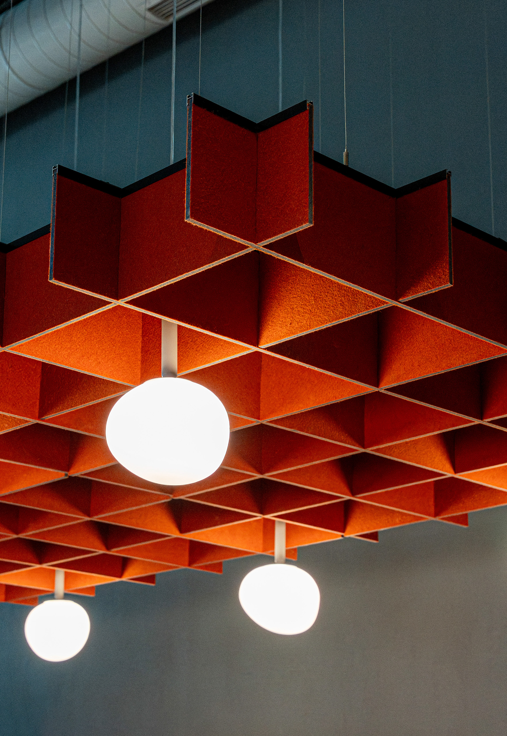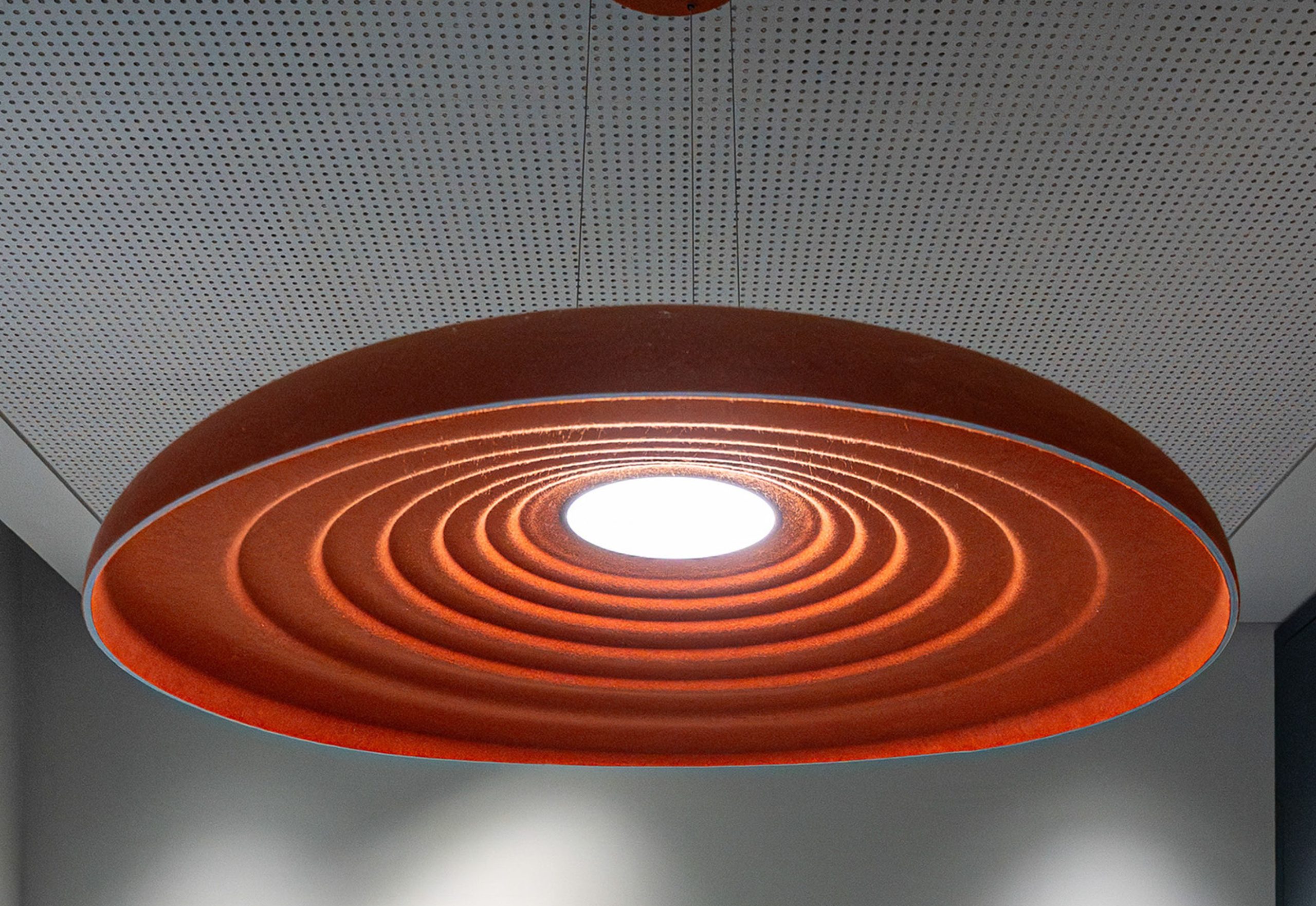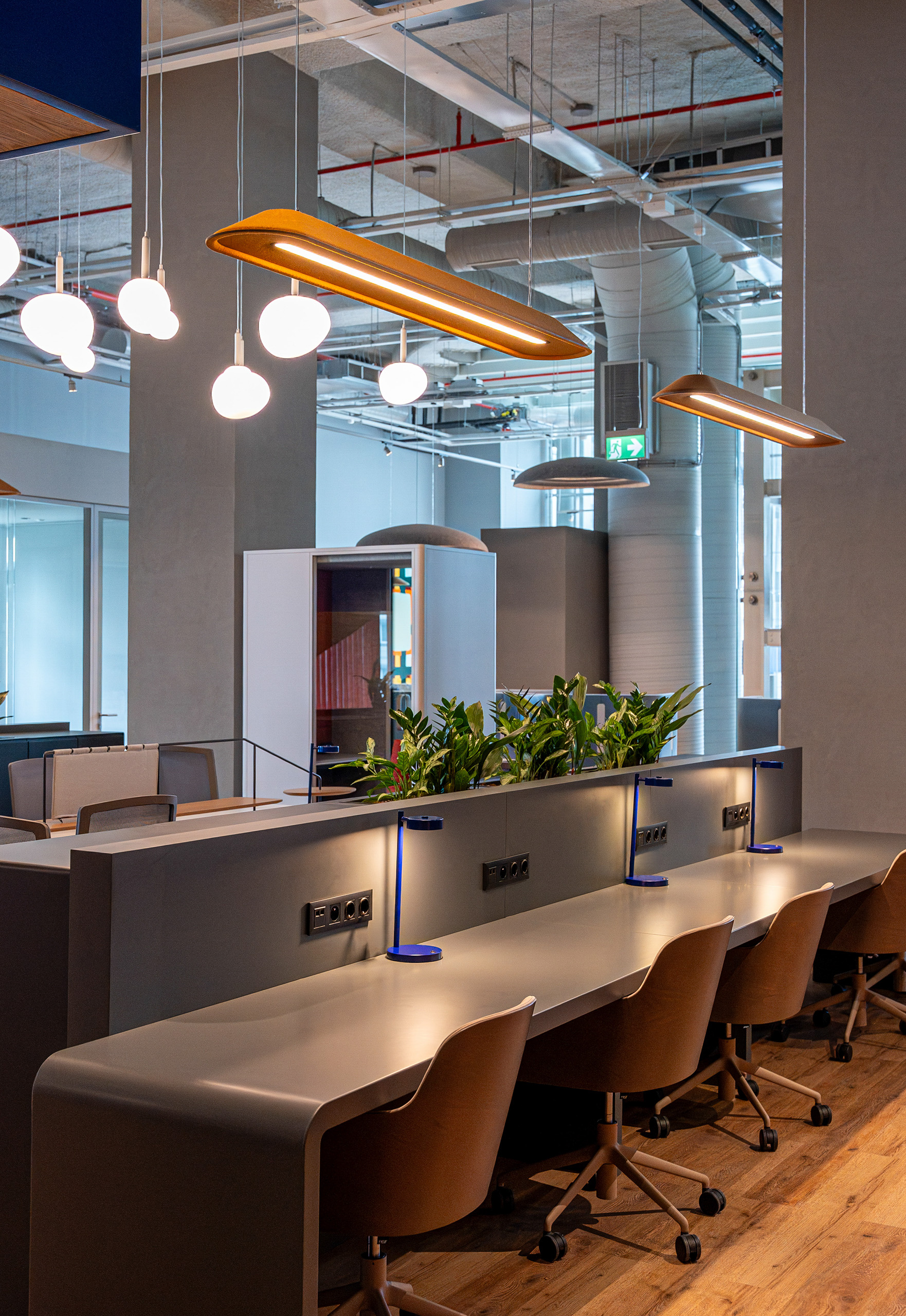 Within the open office areas, Make Up Lighting elements introduce an additional acoustic layer to the workspace. In this way, they help regulate sound reflections in large shared environments and contribute to a calmer working atmosphere.