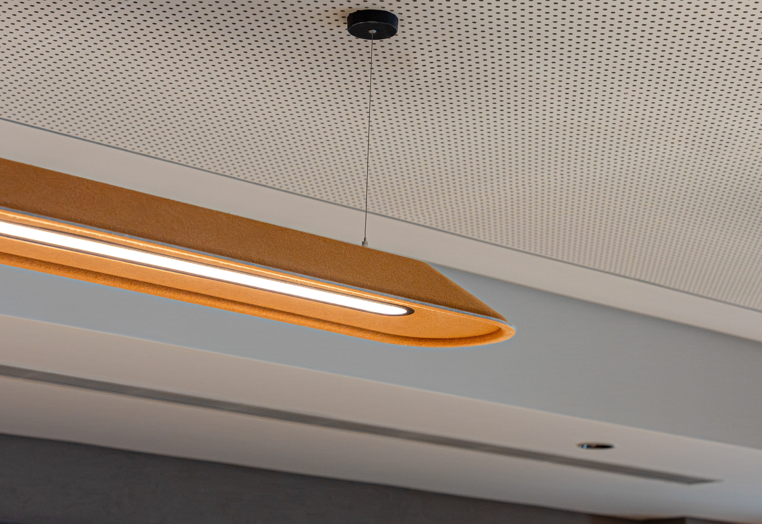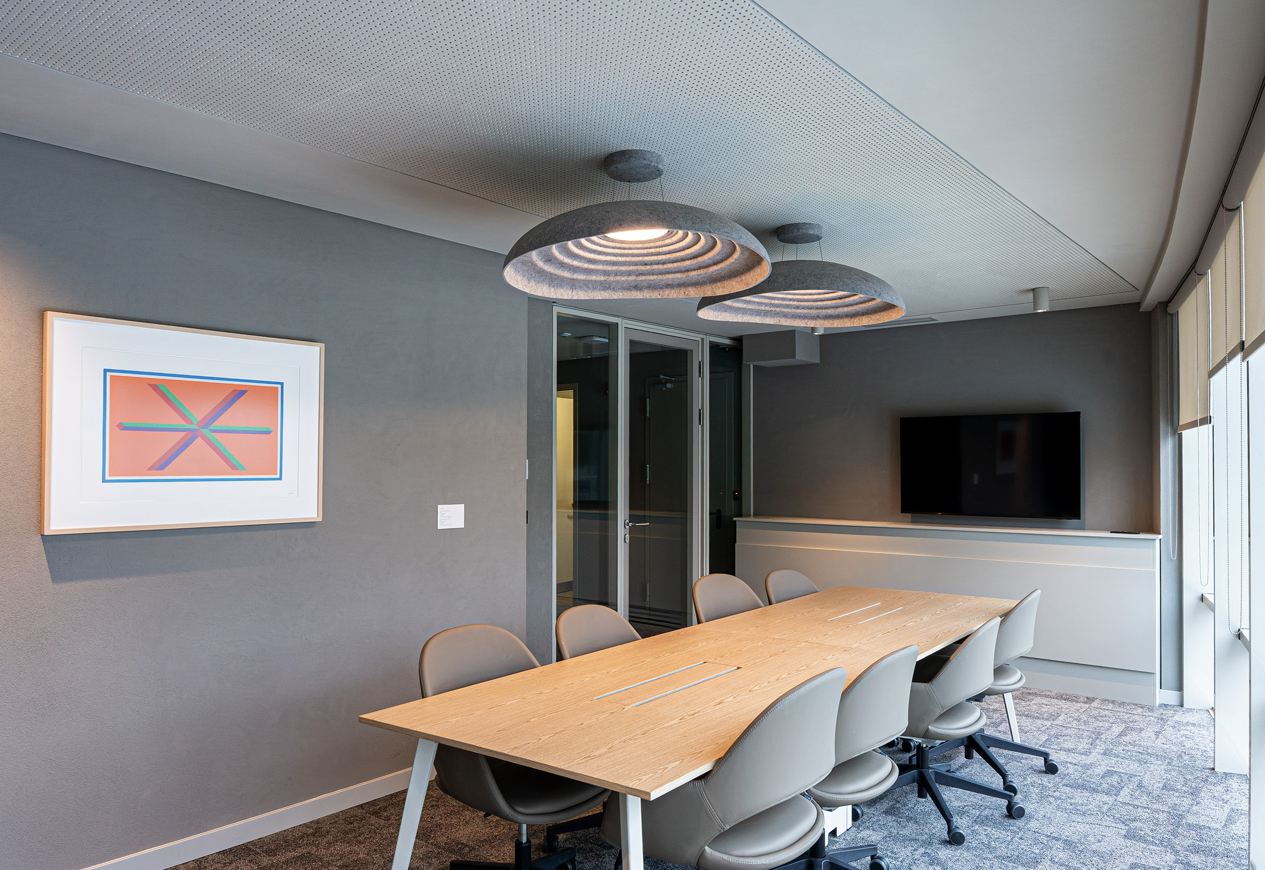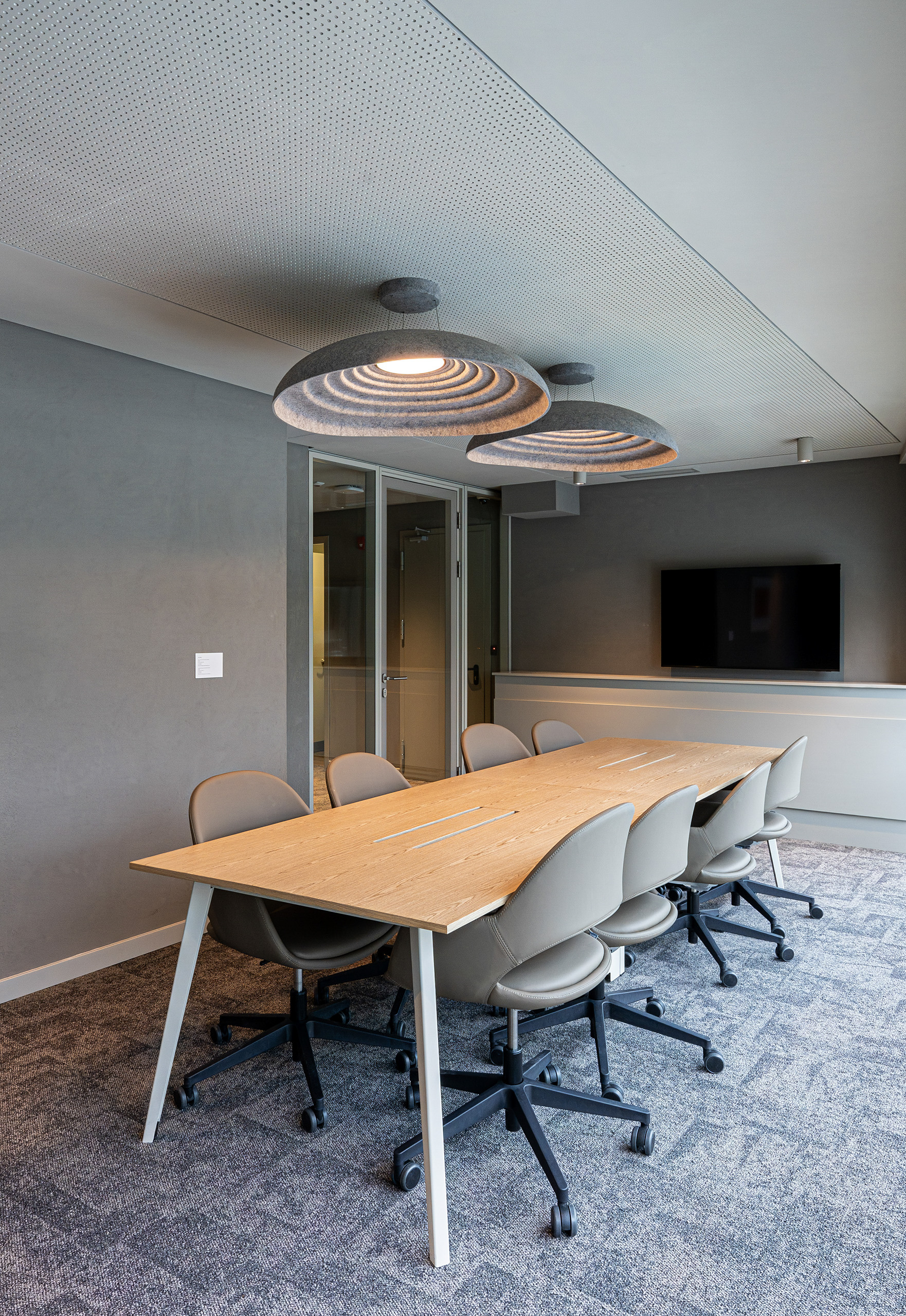 In addition, several meeting spaces include Ripple acoustic lighting elements. These fixtures combine lighting with acoustic performance. As a result, they provide soft ambient illumination while supporting sound absorption and improving speech clarity.