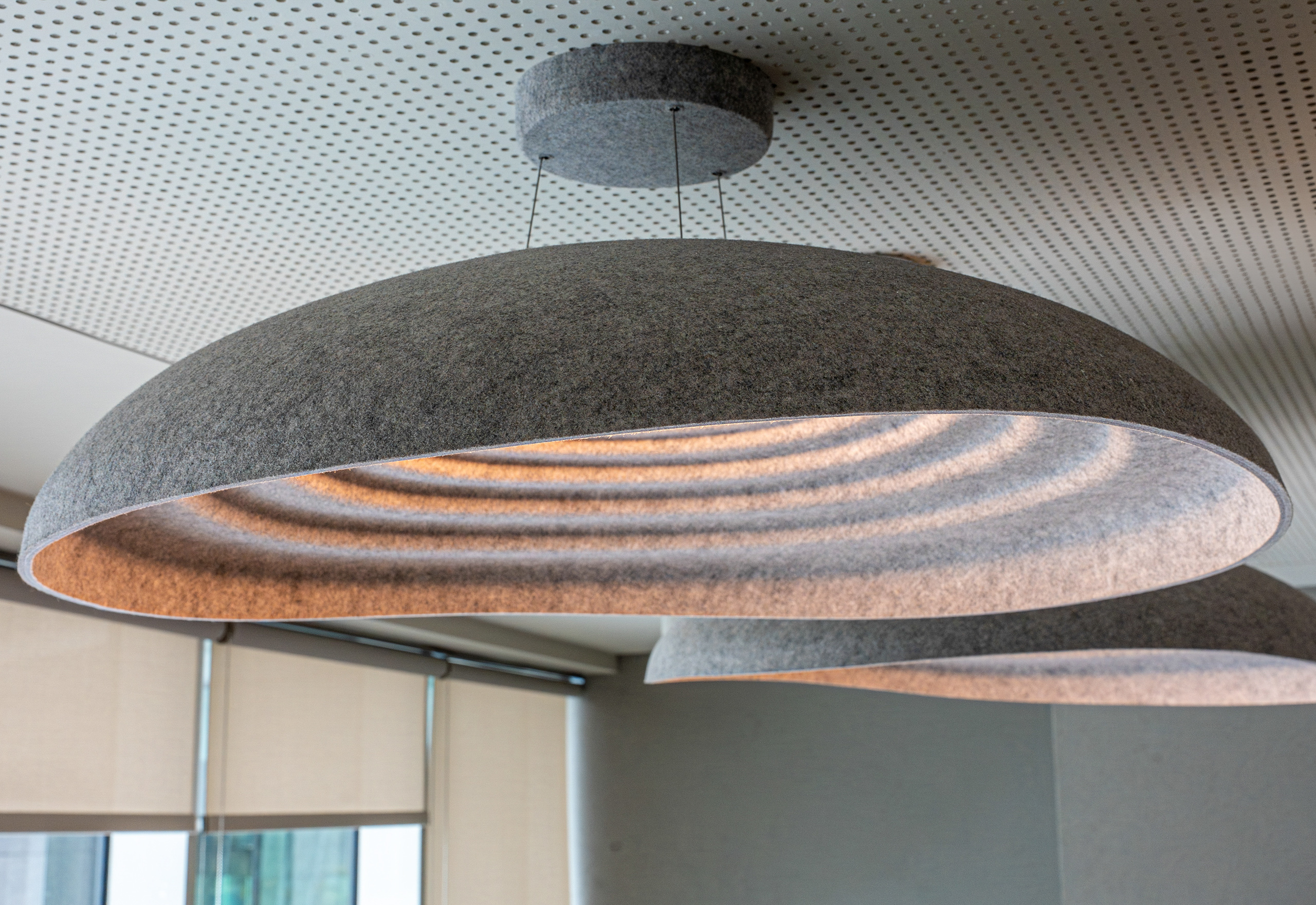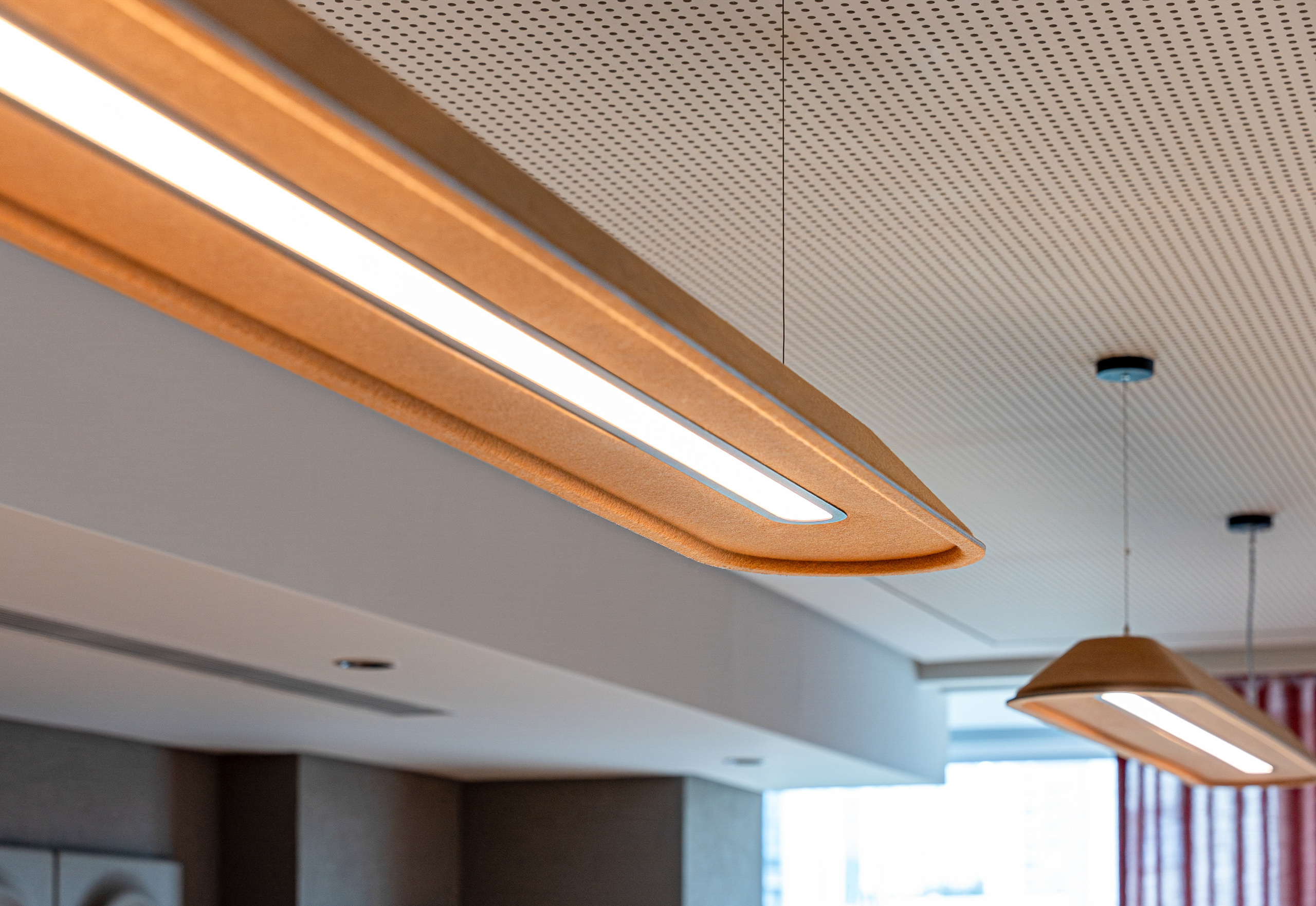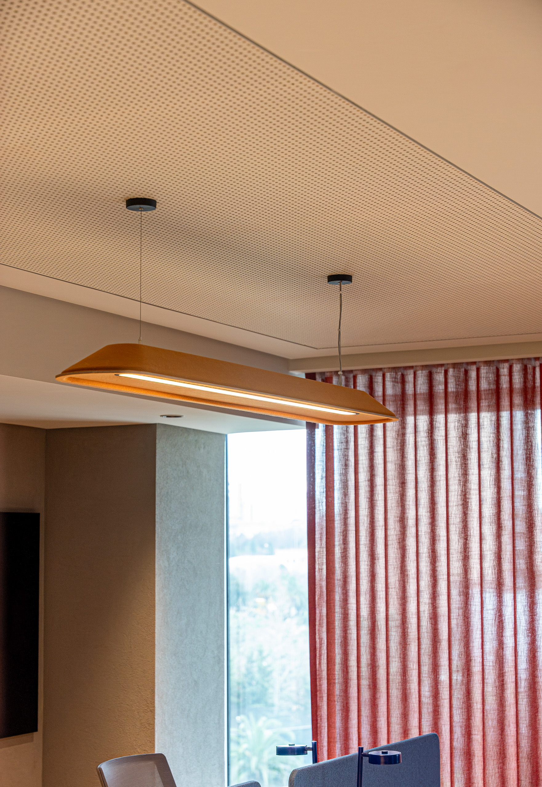 In addition, several meeting spaces include Ripple acoustic lighting elements. These fixtures combine lighting with acoustic performance. As a result, they provide soft ambient illumination while supporting sound absorption and improving speech clarity.