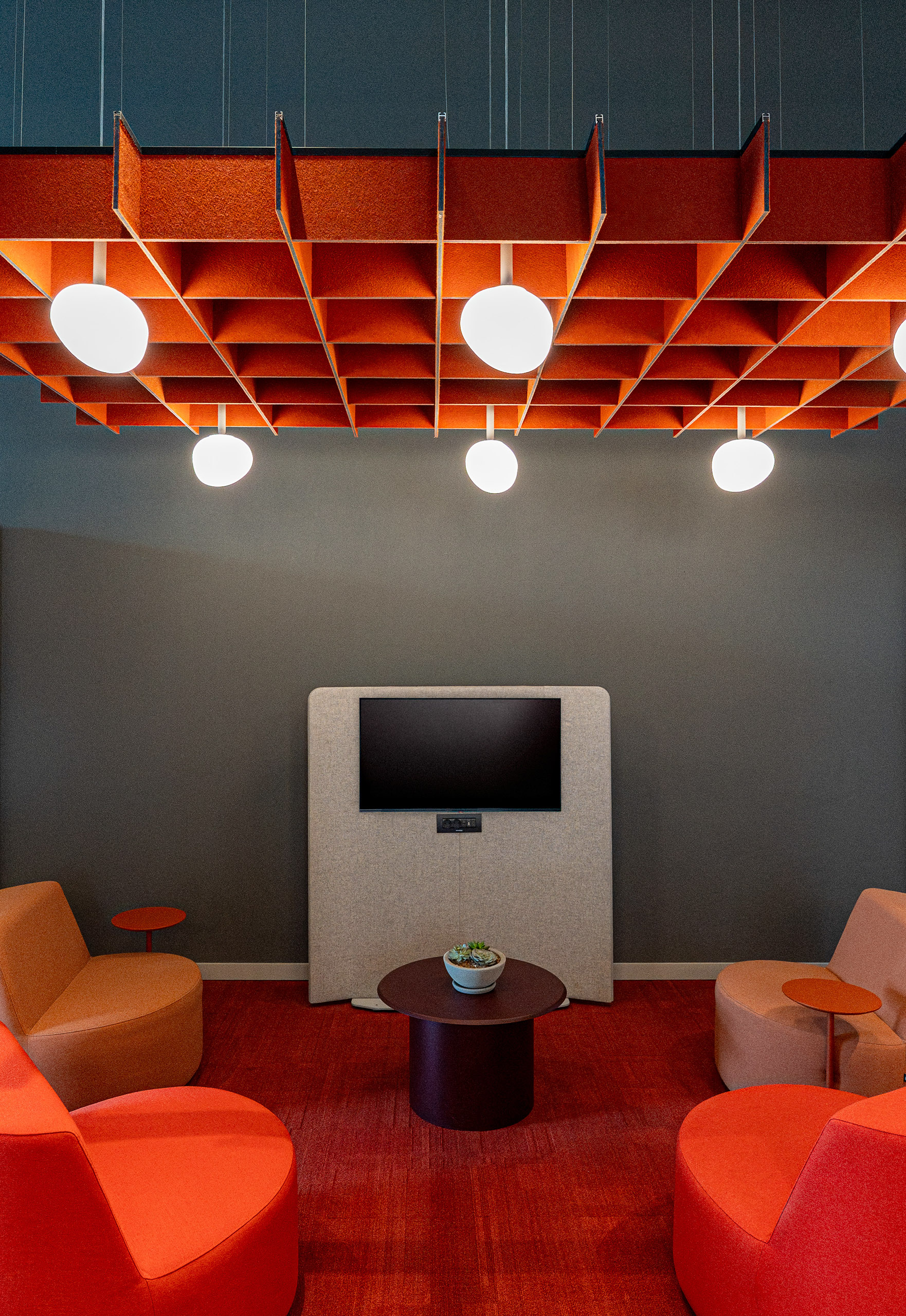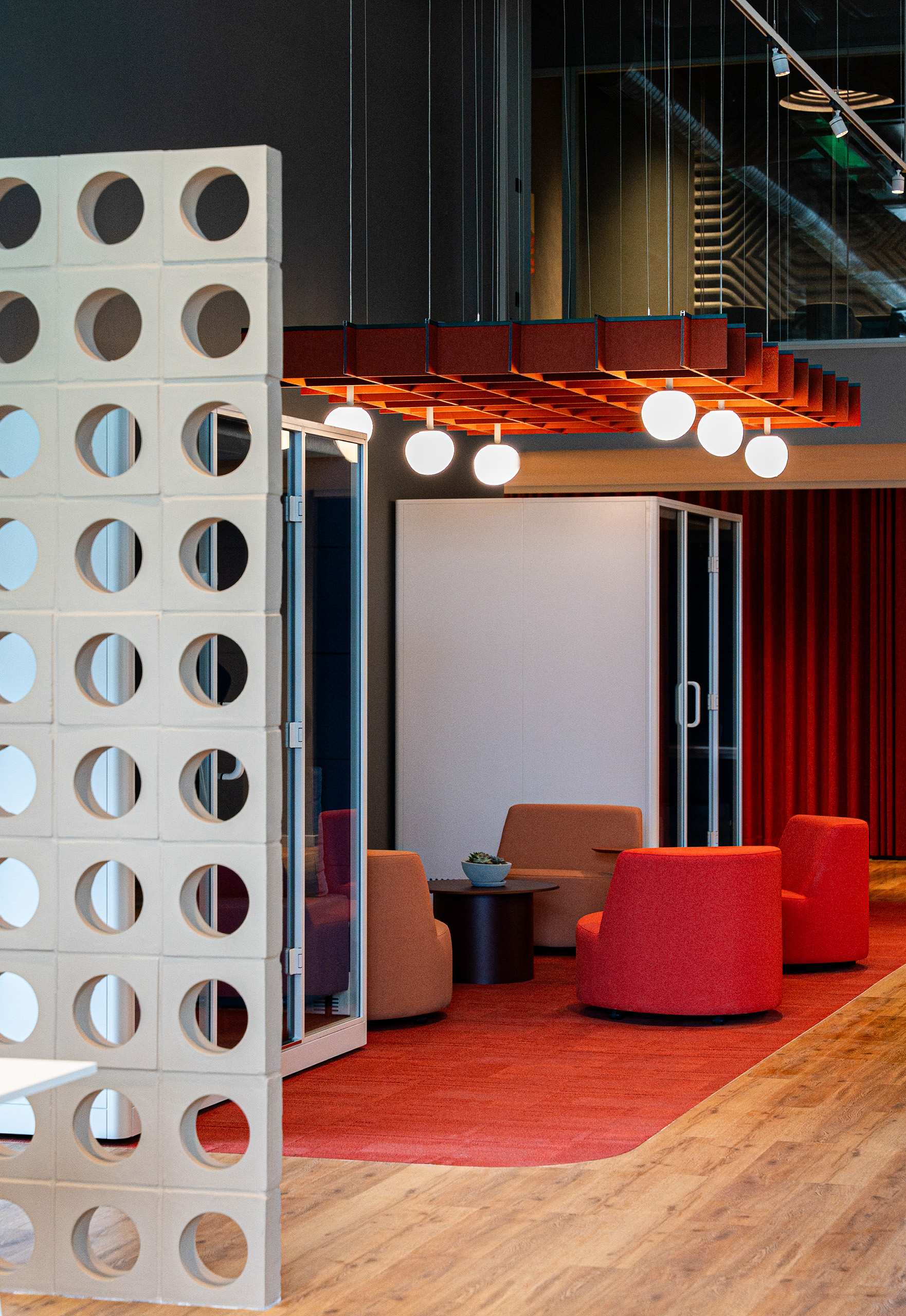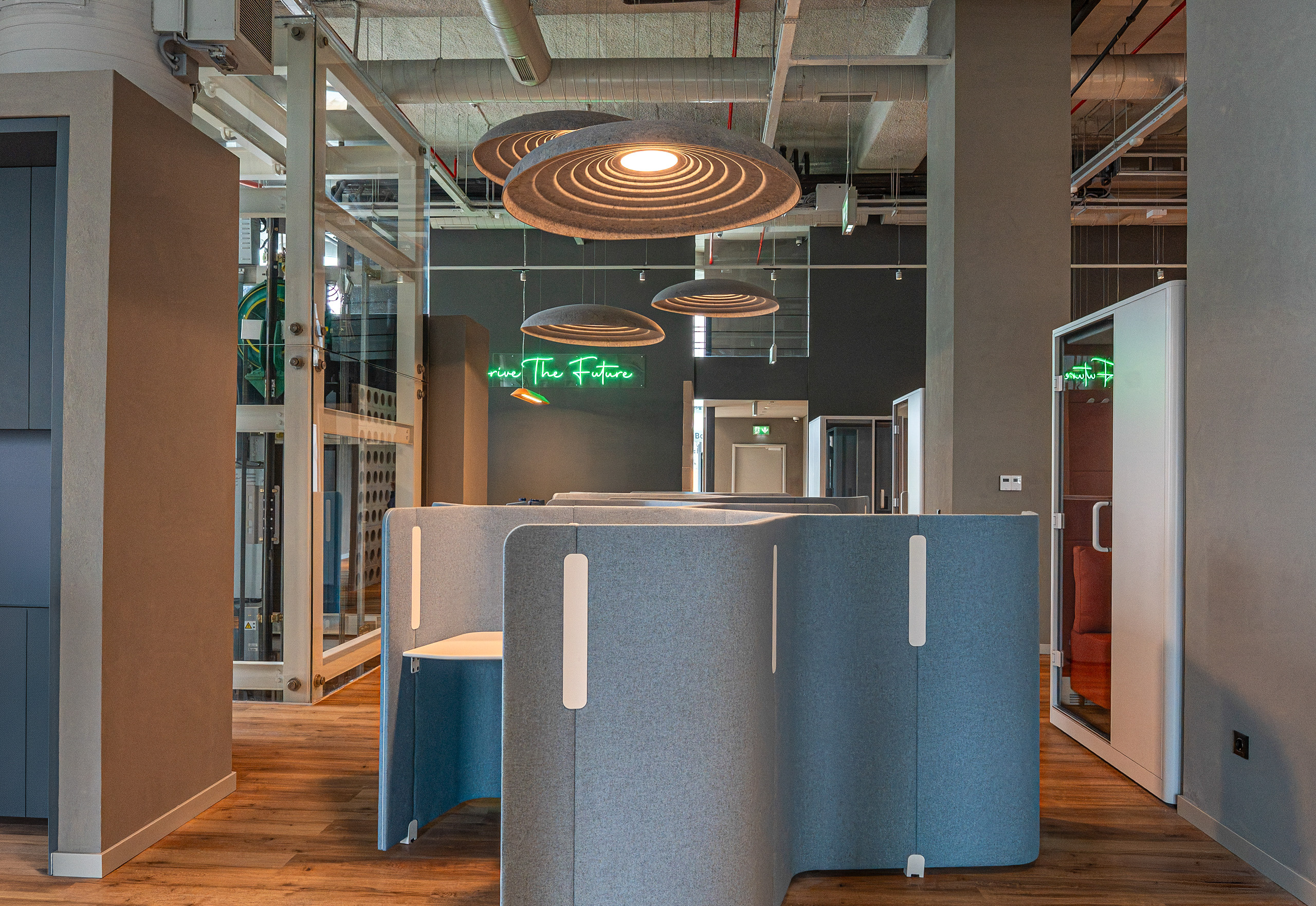Meanwhile, the walls of the open office areas feature Octopus wall panels. Their organic geometry adds visual texture while also helping control noise levels typically generated in collaborative workspaces.