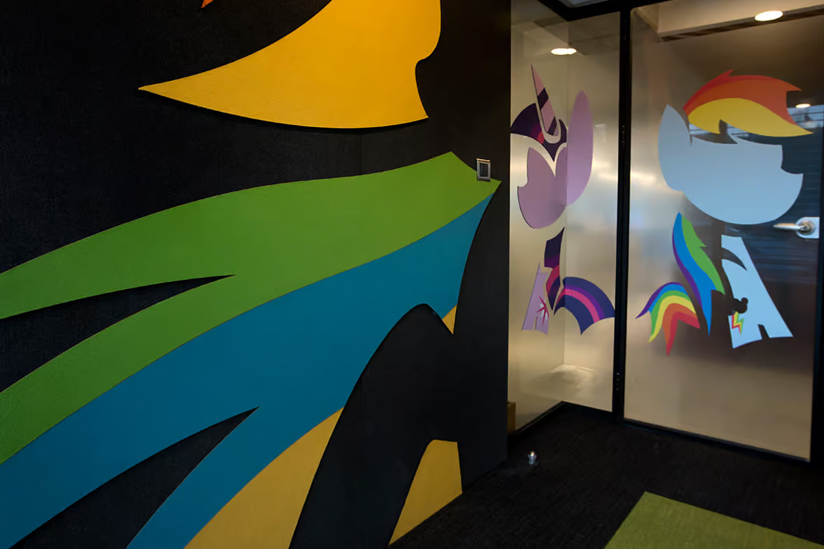 The acoustic strategy controls reverberation time while shaping a unique spatial experience. Plate panels feature custom cuts and cover both walls and ceilings. They absorb sound reflections and add a playful visual language. In addition, they strengthen Hasbro’s distinctive design identity.