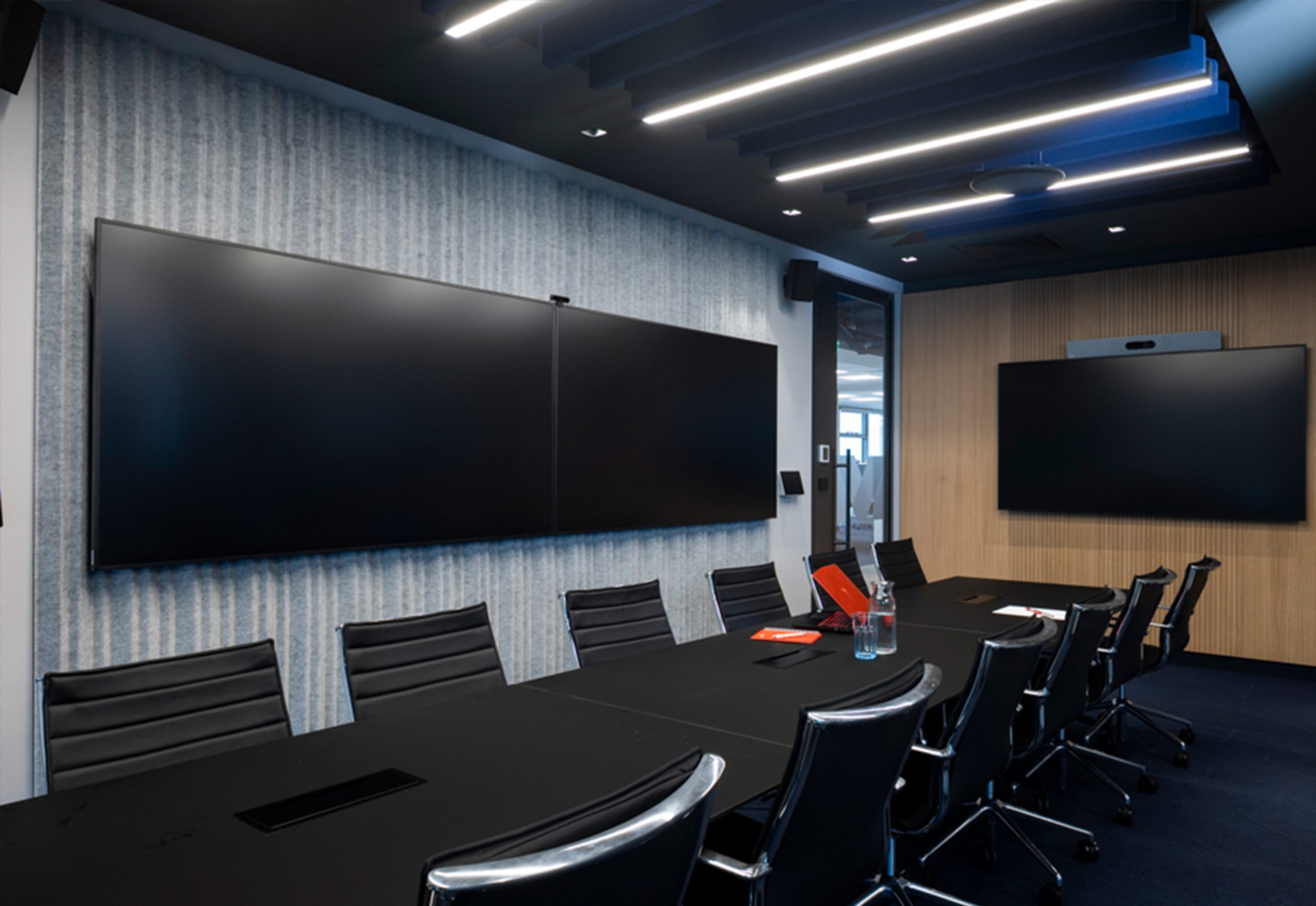 In the meeting rooms, Air Felt Baffle cover the ceilings. These vertical panels absorb sound and reduce echo while maintaining an open-ceiling look. They also hide cables and technical elements above the ceiling. When maintenance is needed, the team can remove a single lamella and access the ceiling area easily without disturbing the rest of the panels.